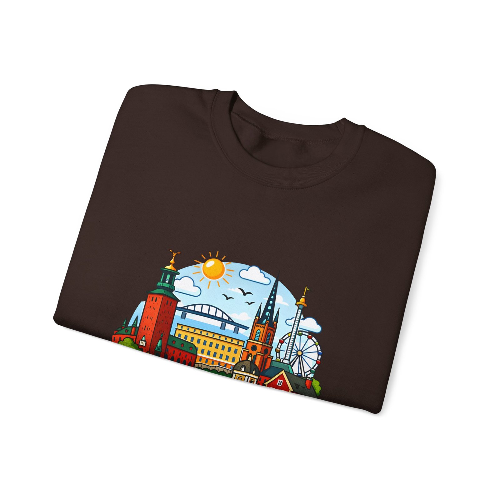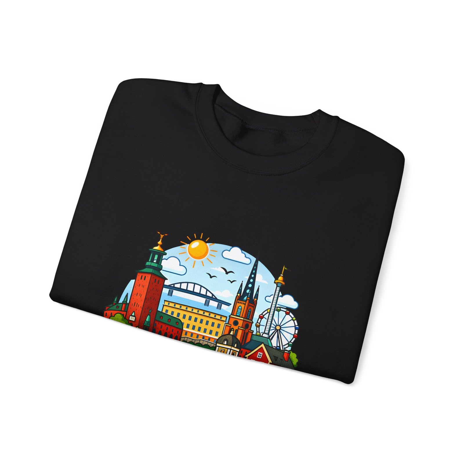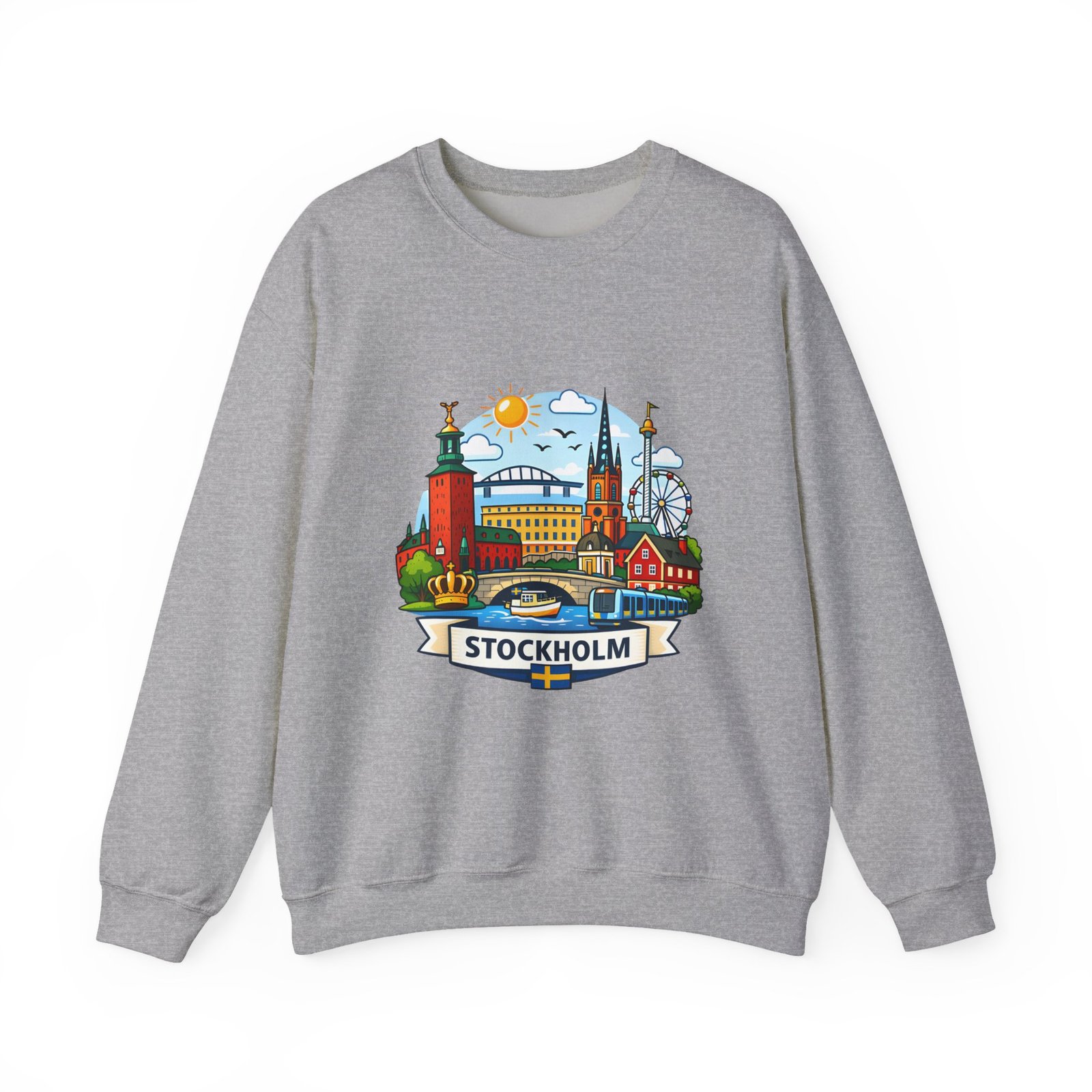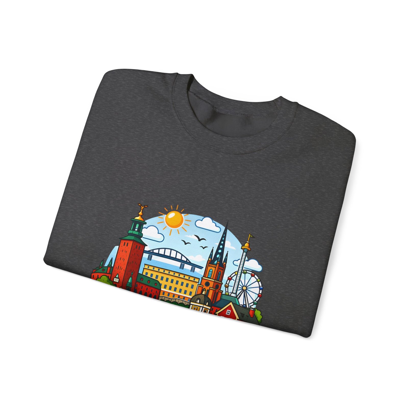 This cozy crewneck brings Stockholm home in soft, lived-in comfort. The midweight 50/50 cotton–poly blend holds a bright, detailed cityscape print on the front that pops against the clean white fabric. Tubular knit construction and ribbed collar keep the silhouette tidy, while double-needle stitching and reinforced seams mean this sweatshirt stands up to frequent wear. It’s breathable yet warm — the kind of layer you reach for on cool mornings, museum days, or long walks along the waterfront. The graphic captures familiar spires, ferris-wheel evenings, and sunlit streets, turning a simple sweatshirt into a small, wearable ode to the city.
