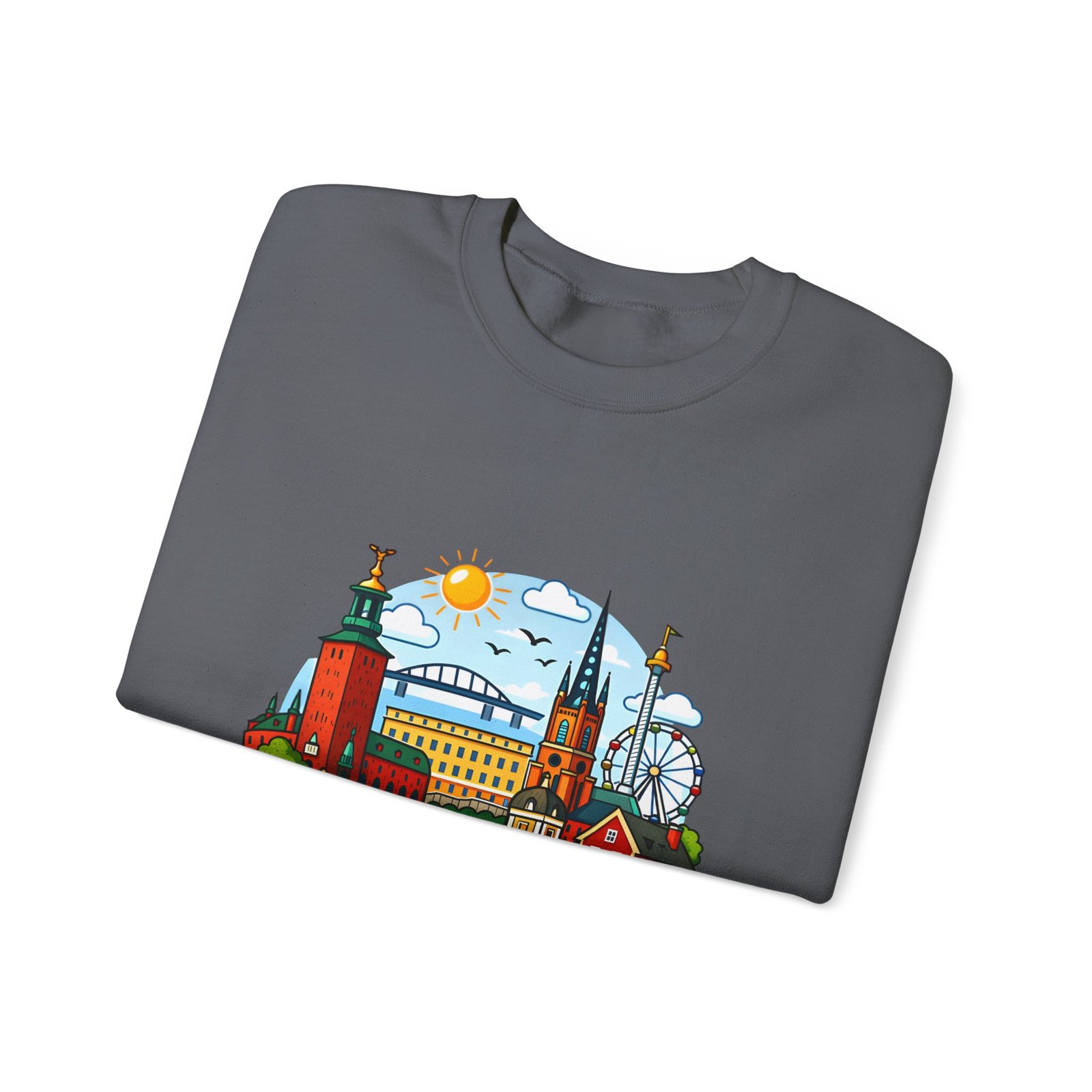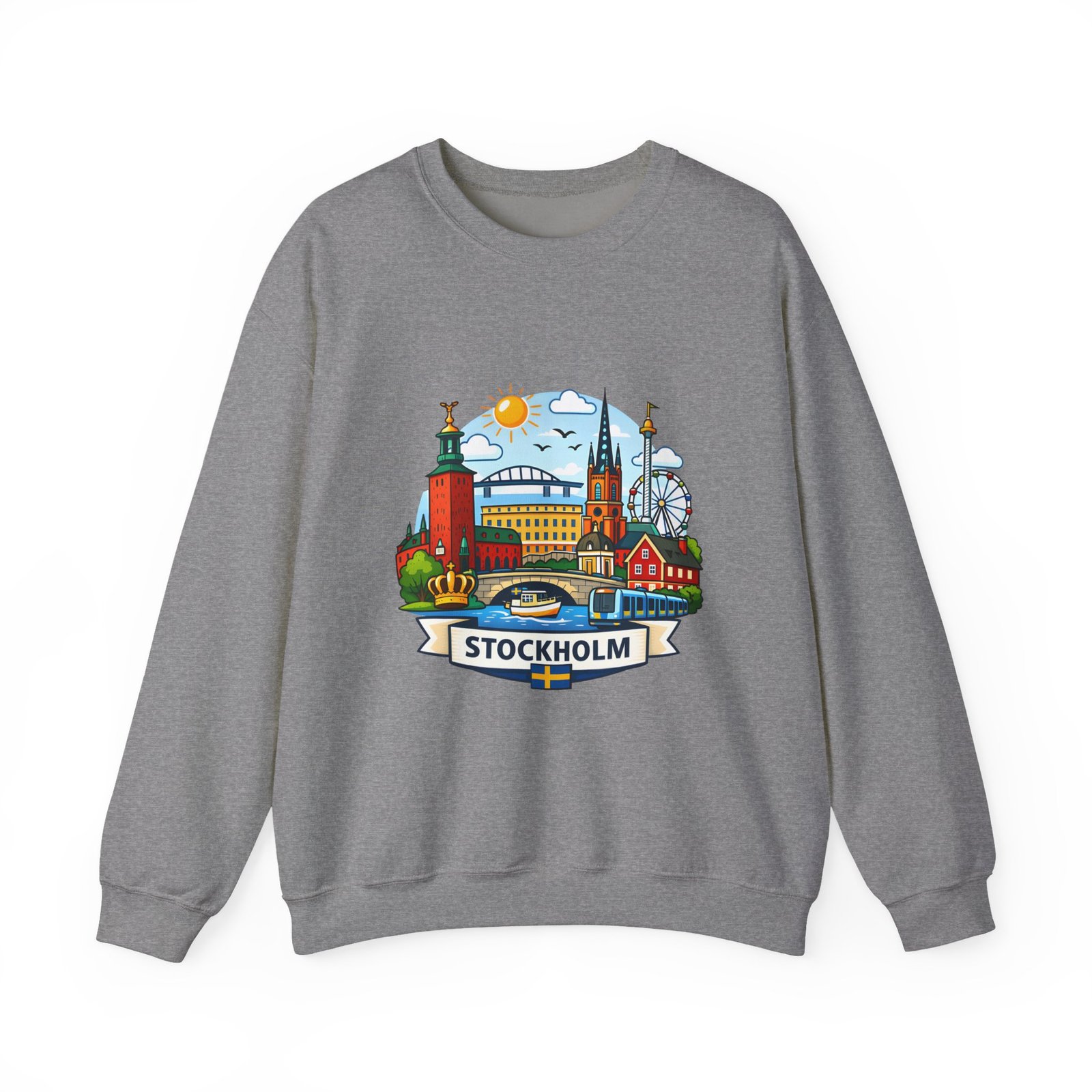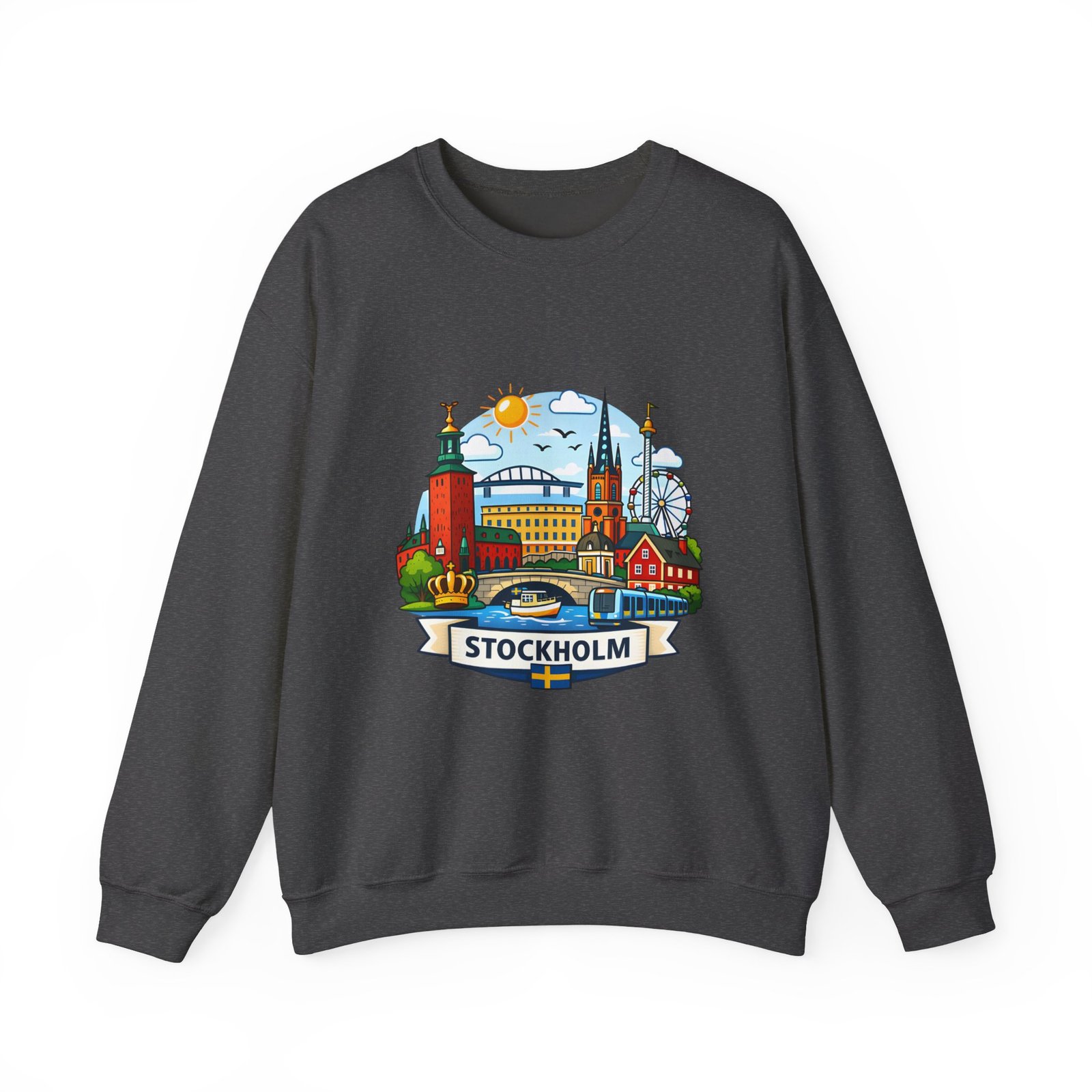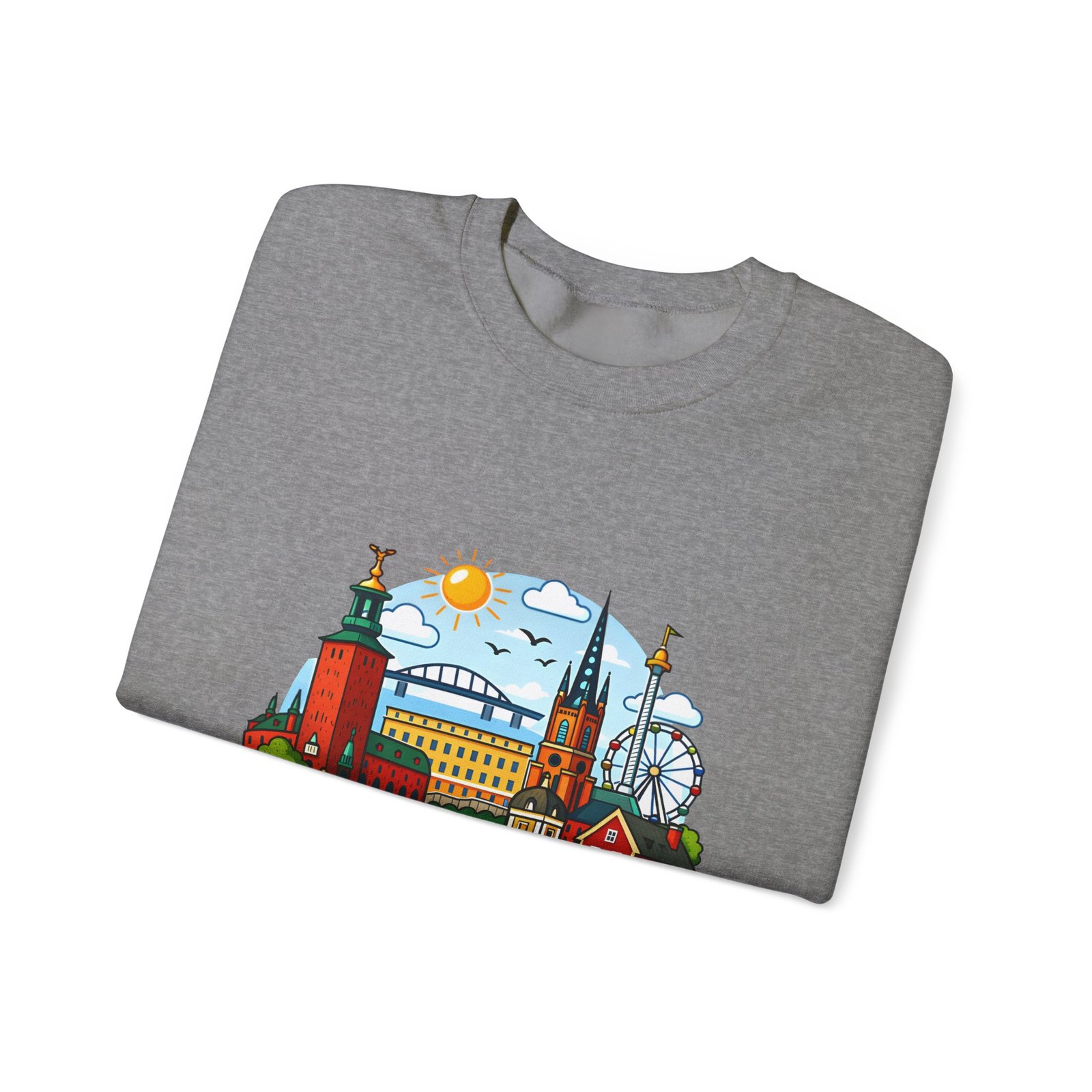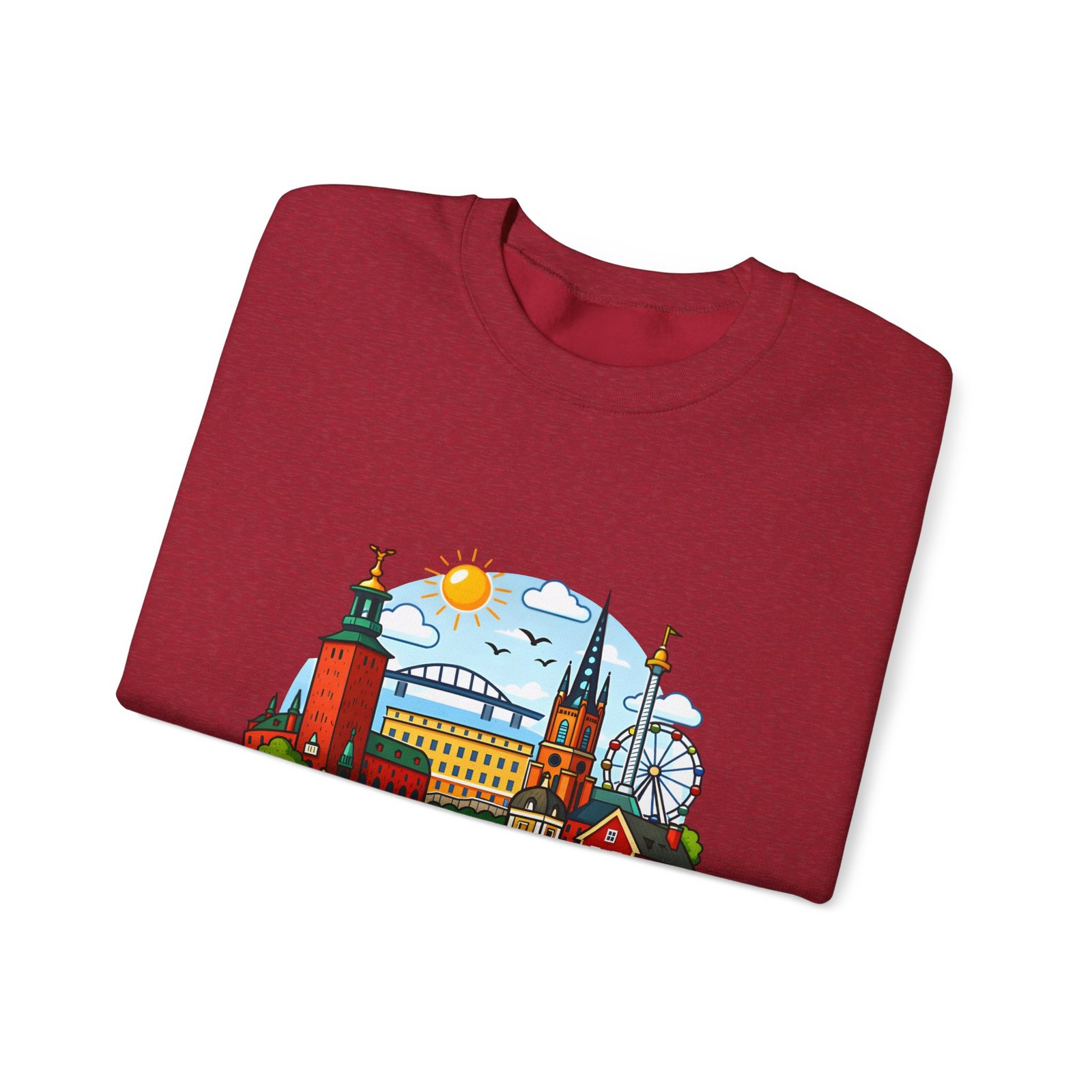 This cozy crewneck brings Stockholm home in soft, lived-in comfort. The midweight 50/50 cotton–poly blend holds a bright, detailed cityscape print on the front that pops against the clean white fabric. Tubular knit construction and ribbed collar keep the silhouette tidy, while double-needle stitching and reinforced seams mean this sweatshirt stands up to frequent wear. It’s breathable yet warm — the kind of layer you reach for on cool mornings, museum days, or long walks along the waterfront. The graphic captures familiar spires, ferris-wheel evenings, and sunlit streets, turning a simple sweatshirt into a small, wearable ode to the city.