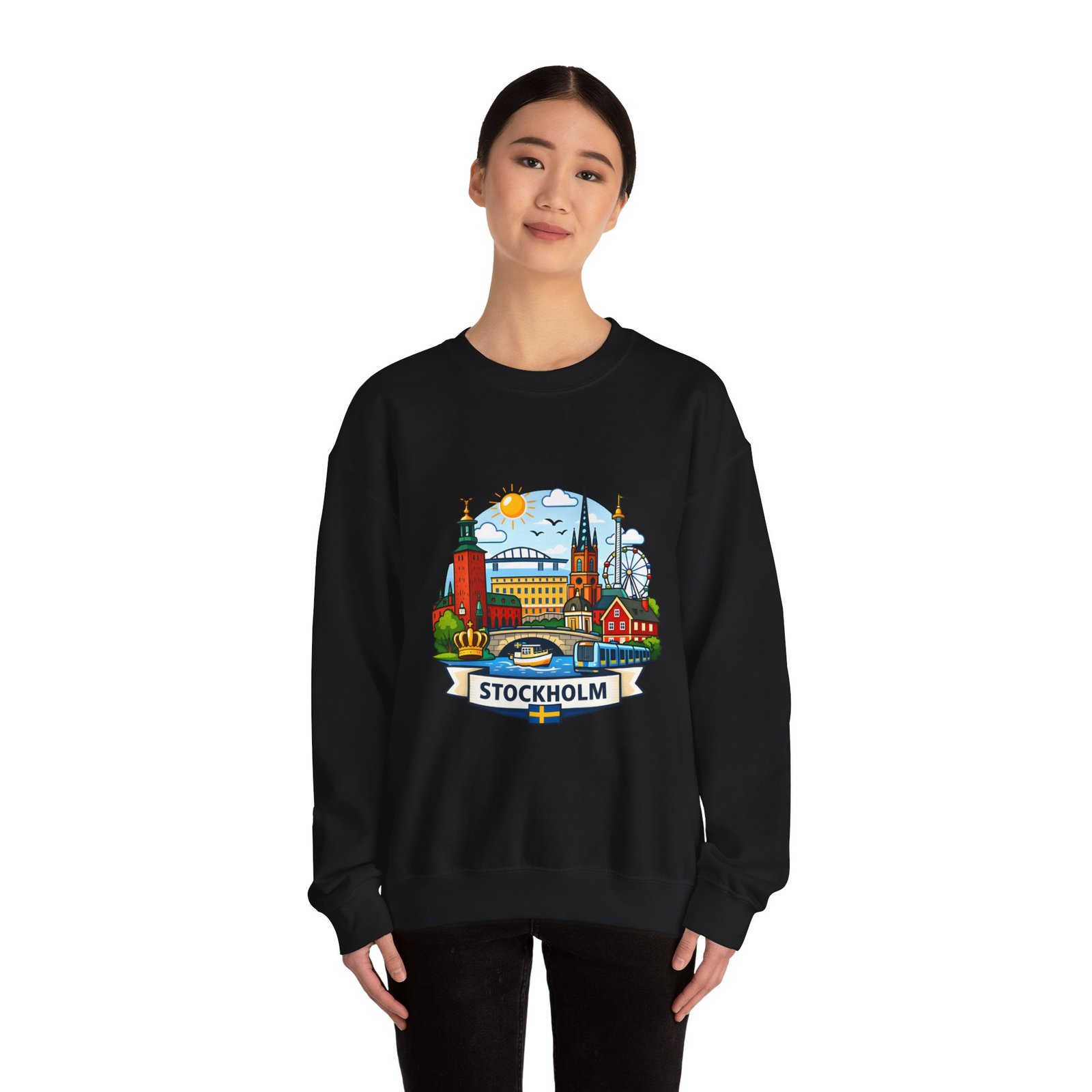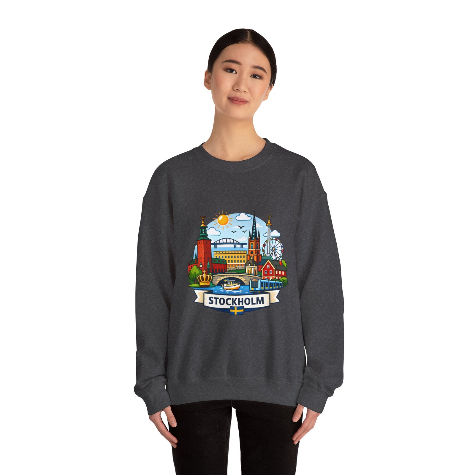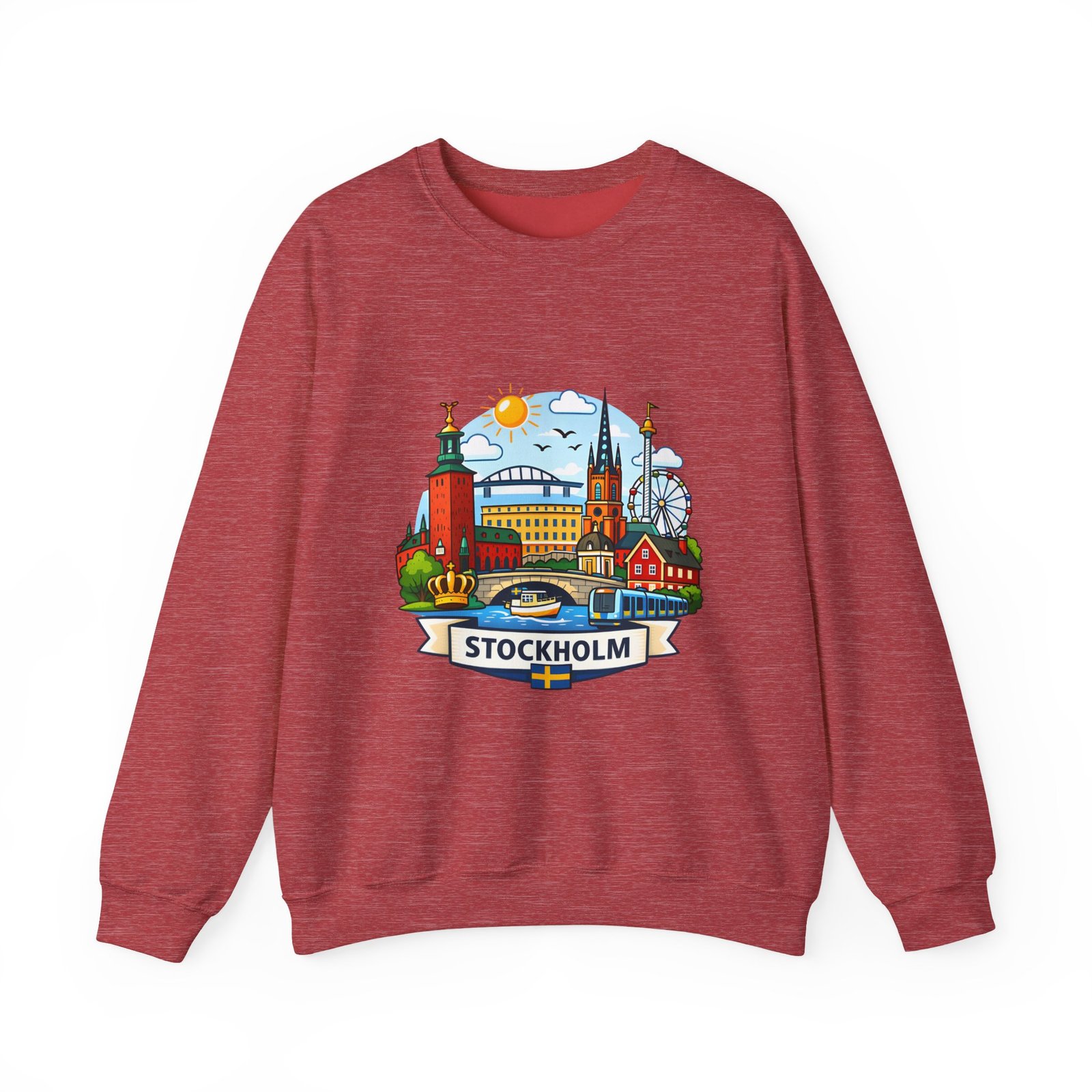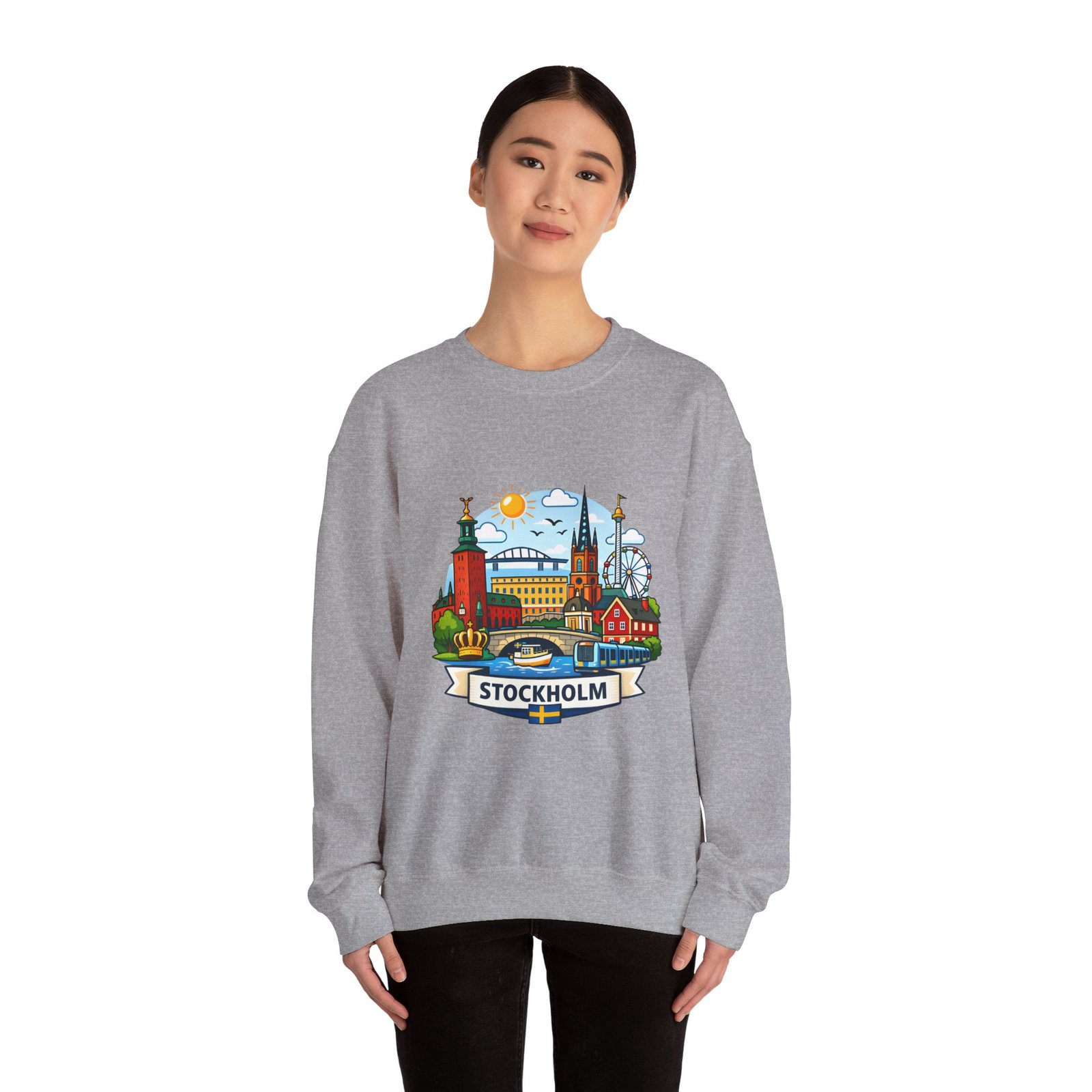 This cozy crewneck brings Stockholm home in soft, lived-in comfort. The midweight 50/50 cotton–poly blend holds a bright, detailed cityscape print on the front that pops against the clean white fabric. Tubular knit construction and ribbed collar keep the silhouette tidy, while double-needle stitching and reinforced seams mean this sweatshirt stands up to frequent wear. It’s breathable yet warm — the kind of layer you reach for on cool mornings, museum days, or long walks along the waterfront. The graphic captures familiar spires, ferris-wheel evenings, and sunlit streets, turning a simple sweatshirt into a small, wearable ode to the city.