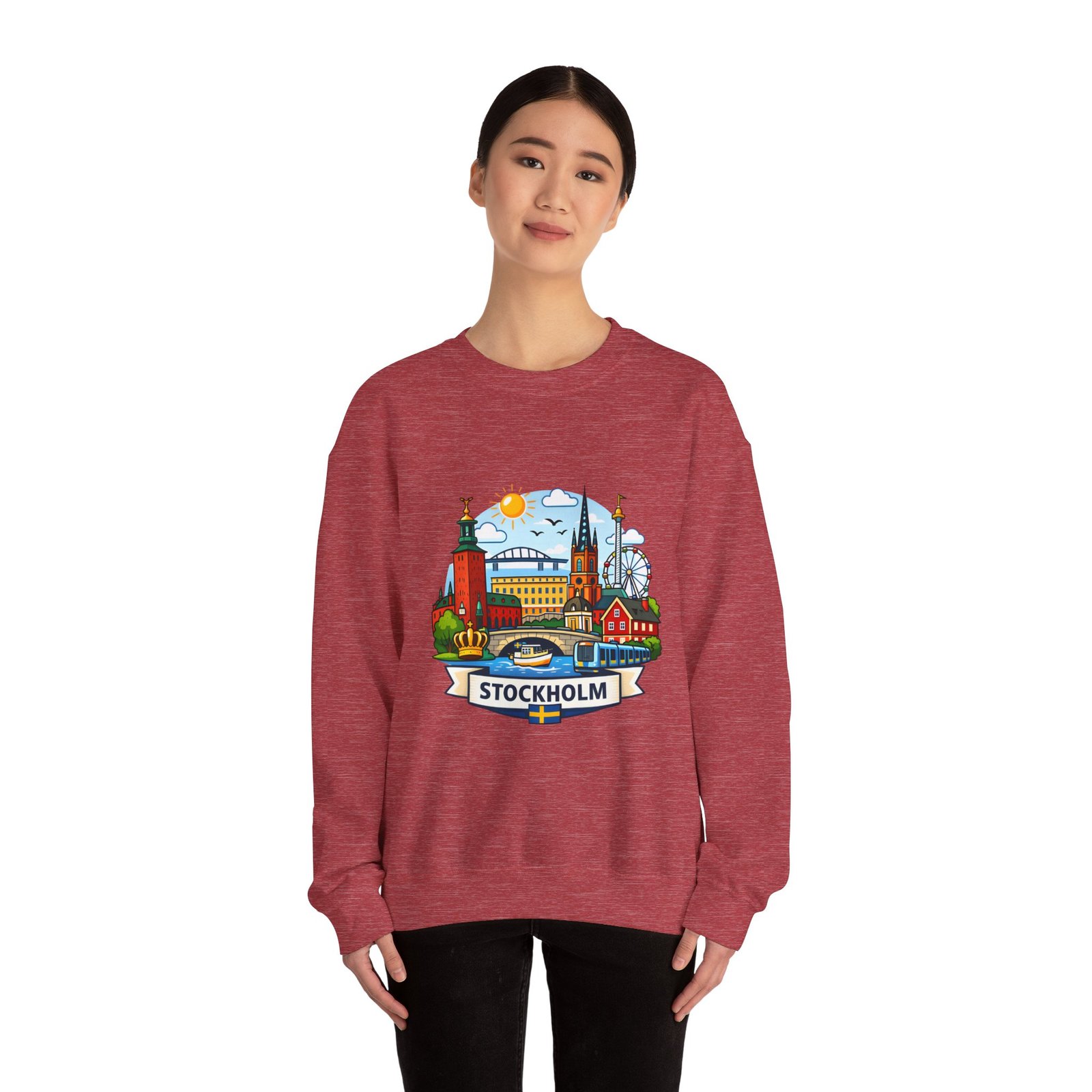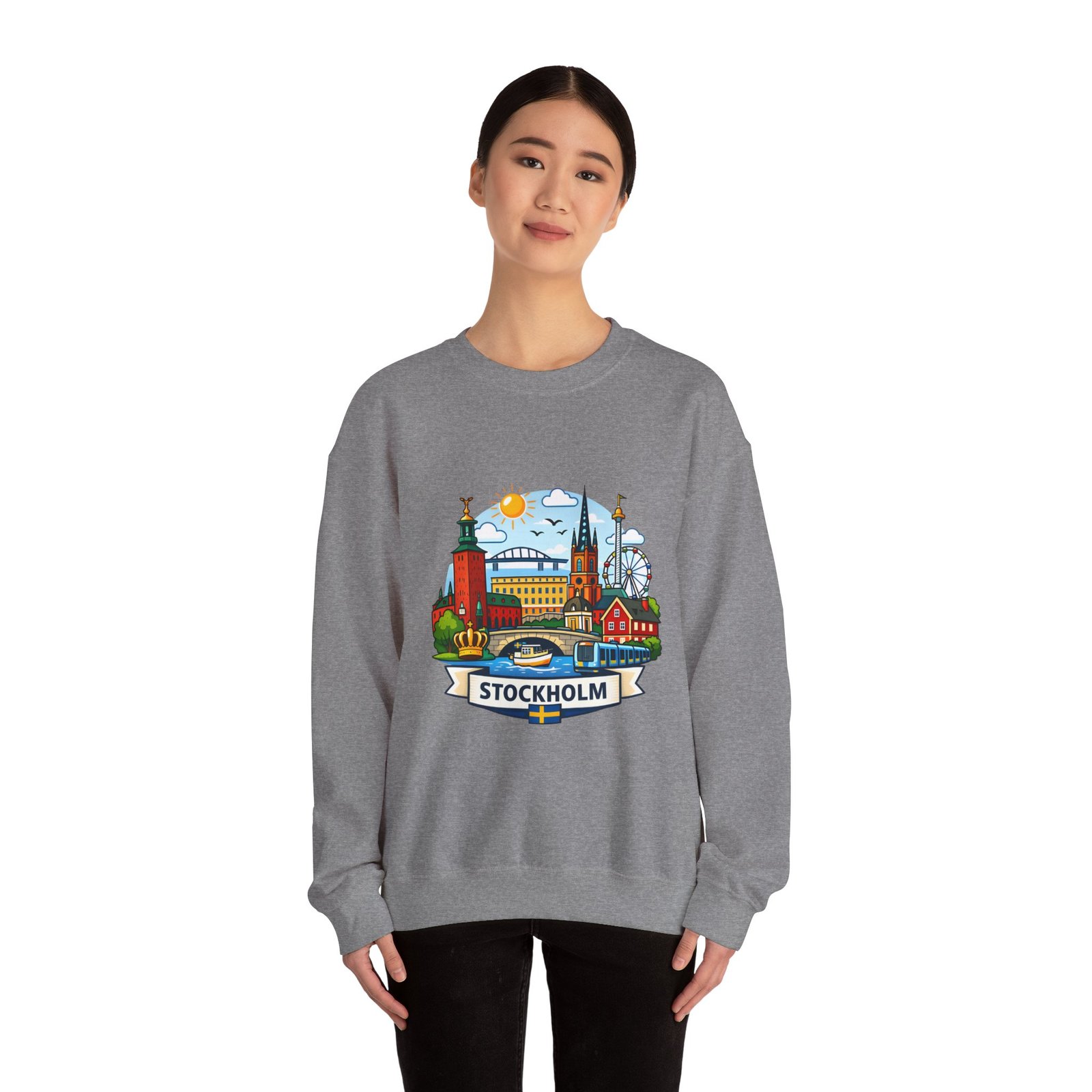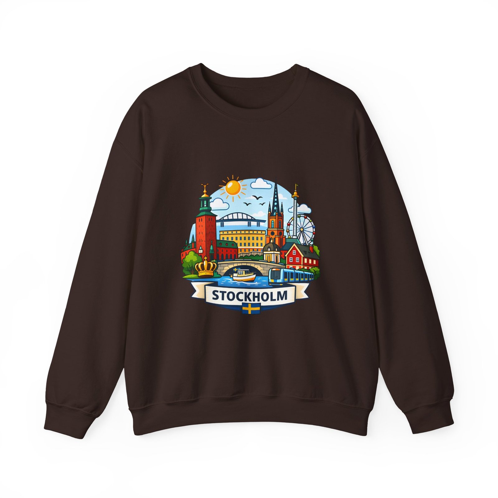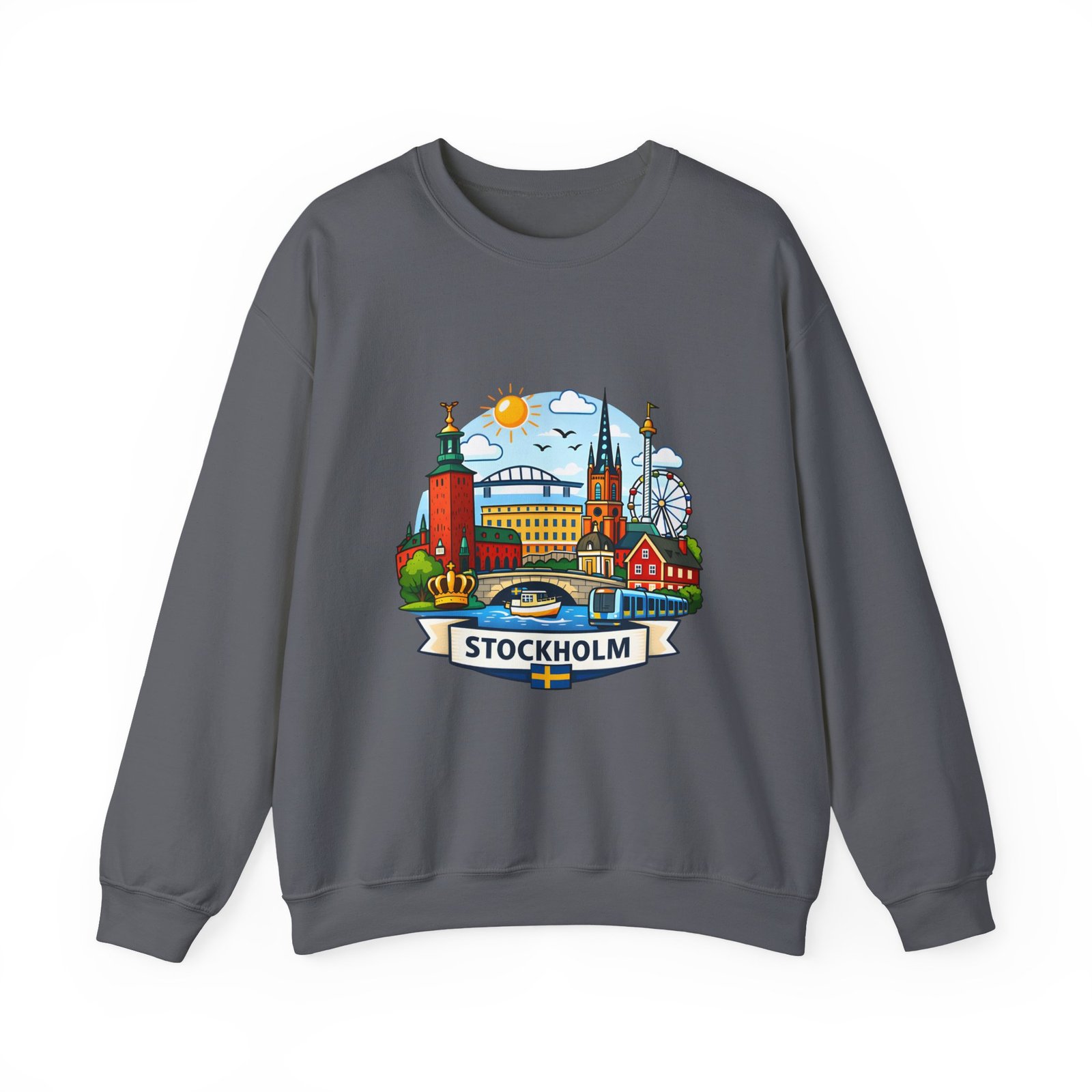 This cozy crewneck brings Stockholm home in soft, lived-in comfort. The midweight 50/50 cotton–poly blend holds a bright, detailed cityscape print on the front that pops against the clean white fabric. Tubular knit construction and ribbed collar keep the silhouette tidy, while double-needle stitching and reinforced seams mean this sweatshirt stands up to frequent wear. It’s breathable yet warm — the kind of layer you reach for on cool mornings, museum days, or long walks along the waterfront. The graphic captures familiar spires, ferris-wheel evenings, and sunlit streets, turning a simple sweatshirt into a small, wearable ode to the city.