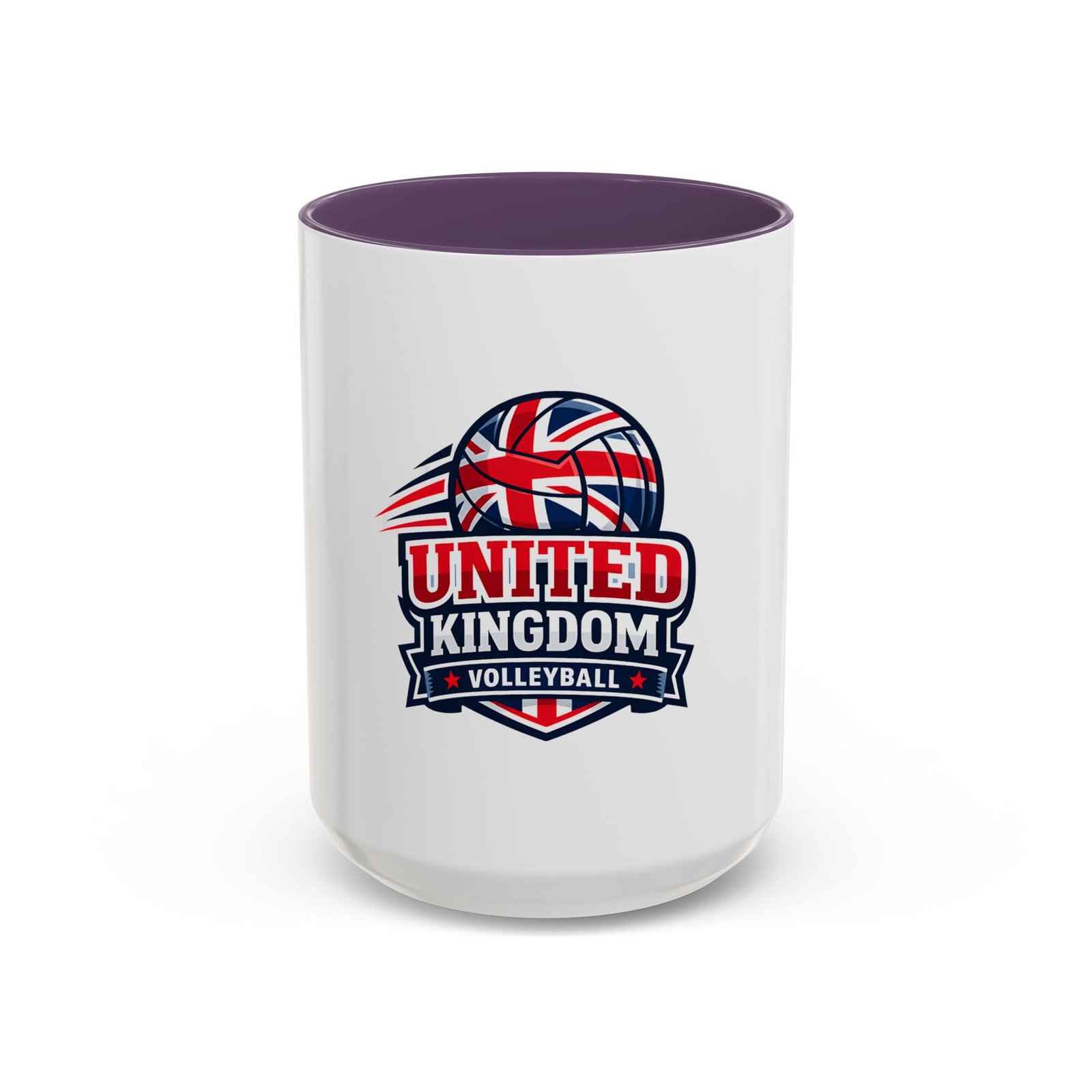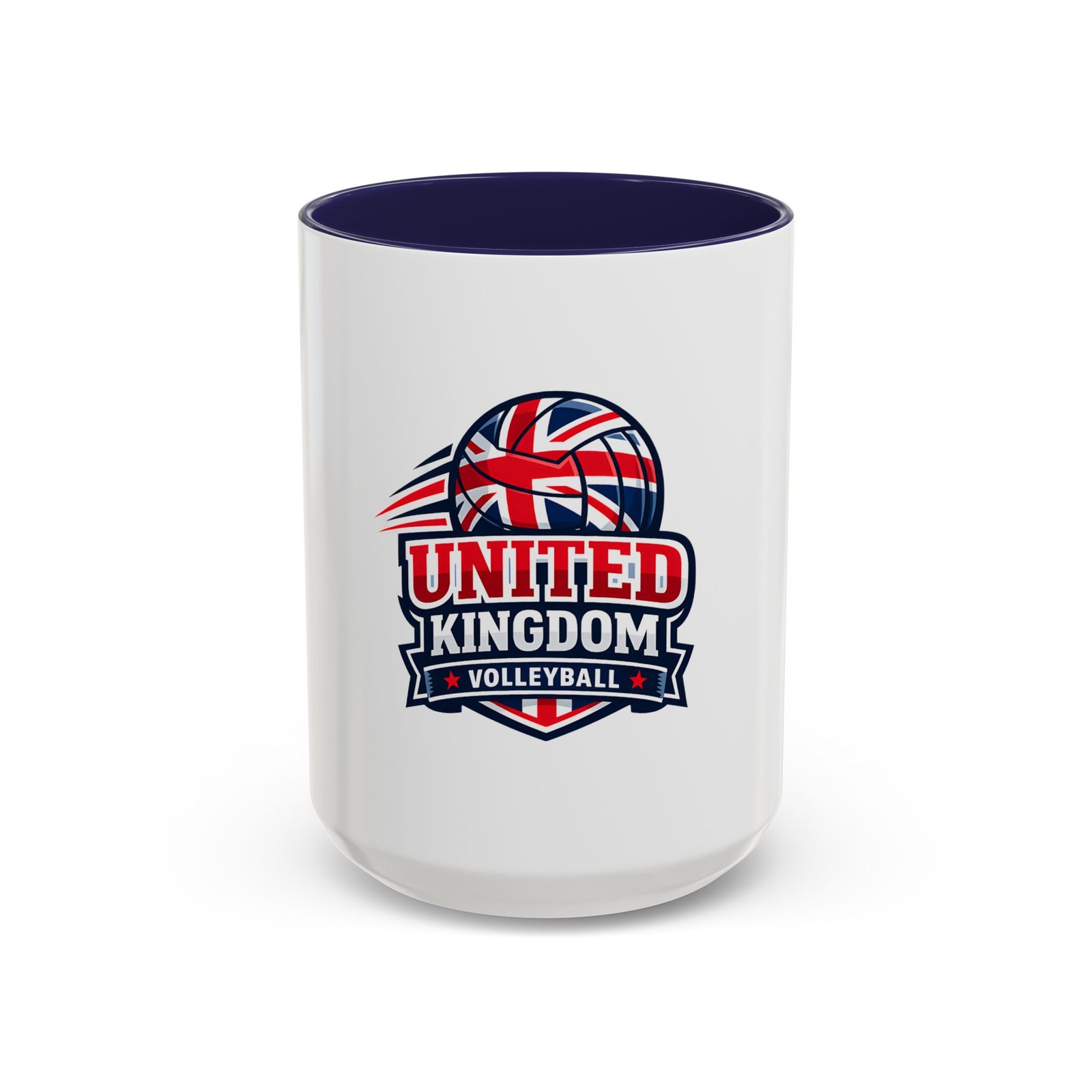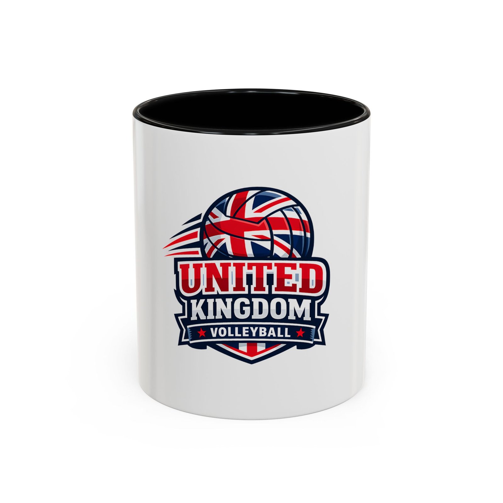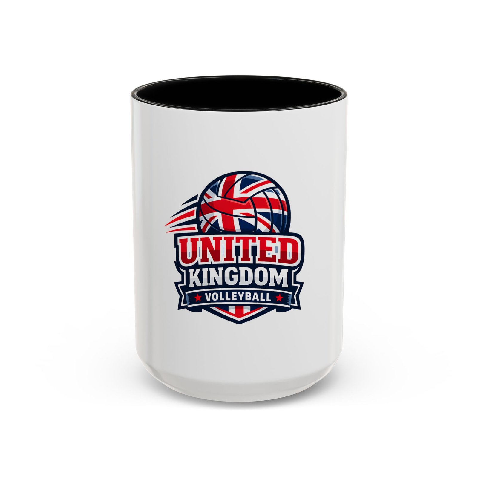 This ceramic accent mug brings a spirited slice of British volleyball pride to every morning routine. The glossy white exterior contrasts with a bold black interior and handle, framing a dynamic United Kingdom volleyball emblem that weaves the Union Jack into a volleyball silhouette. It feels energetic and club-focused — the kind of mug a player, coach, or fan reaches for before an early match or during a long strategy chat. Solid in the hand with a comfortable C-shaped handle, it holds either an 11oz or 15oz pour and tolerates the everyday hustle: microwave and dishwasher safe, vibrant color that stands up to regular use, and made from lead- and BPA-free ceramic. Use it on game mornings, team meetings, or as a tabletop reminder of the club you play for.