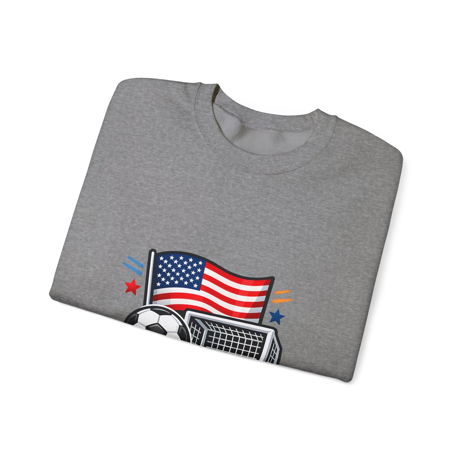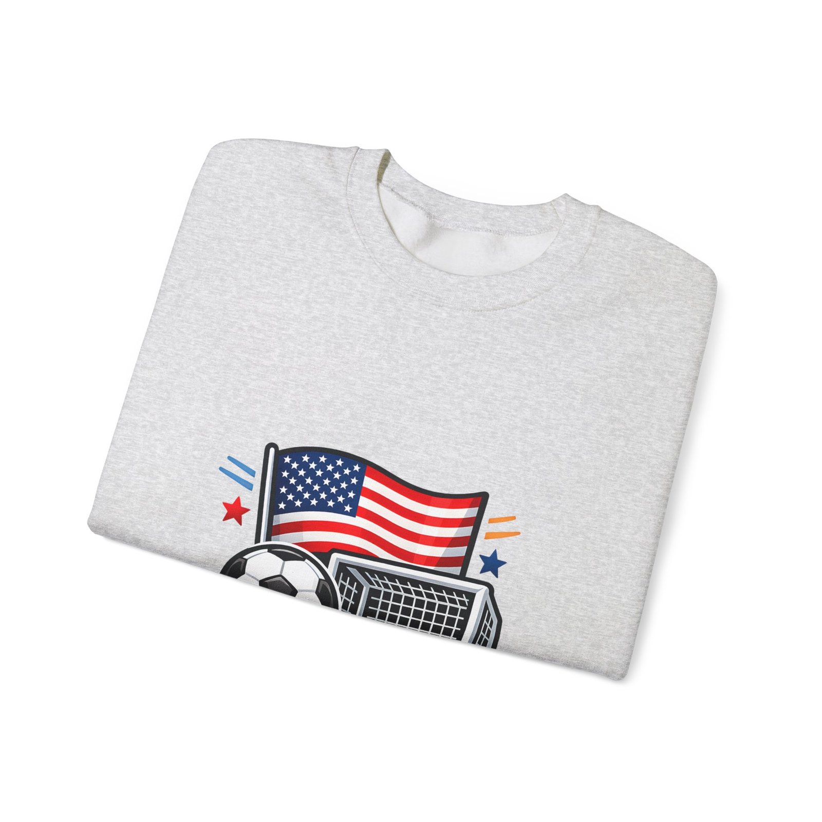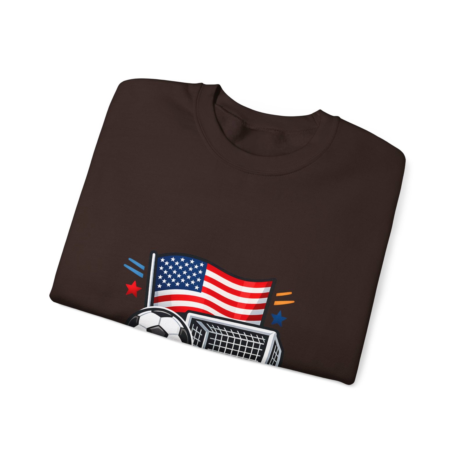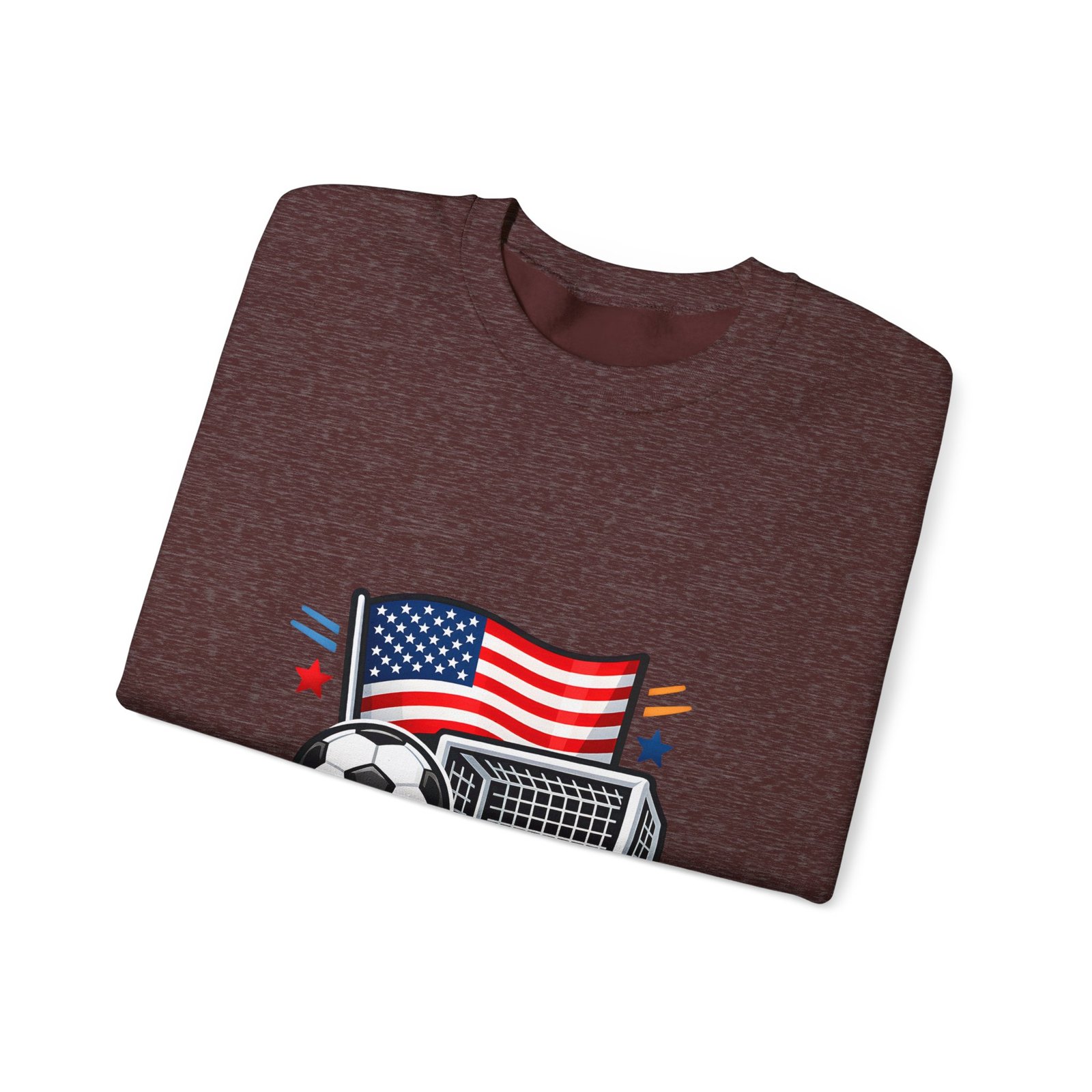This cozy crewneck brings a quiet confidence to game day and beyond. Soft, medium‑weight fleece drapes comfortably over shoulders while a crisp soccer-and-American-flag graphic centers attention without shouting. Wear it to warm up before a match, watch the kids play from the sidelines, or layer under a jacket for chilly evening practices. The tubular knit and ribbed collar keep the silhouette tidy, and tear-away neck label means no scratchy interruptions — just relaxed comfort that lasts through seasons of play.