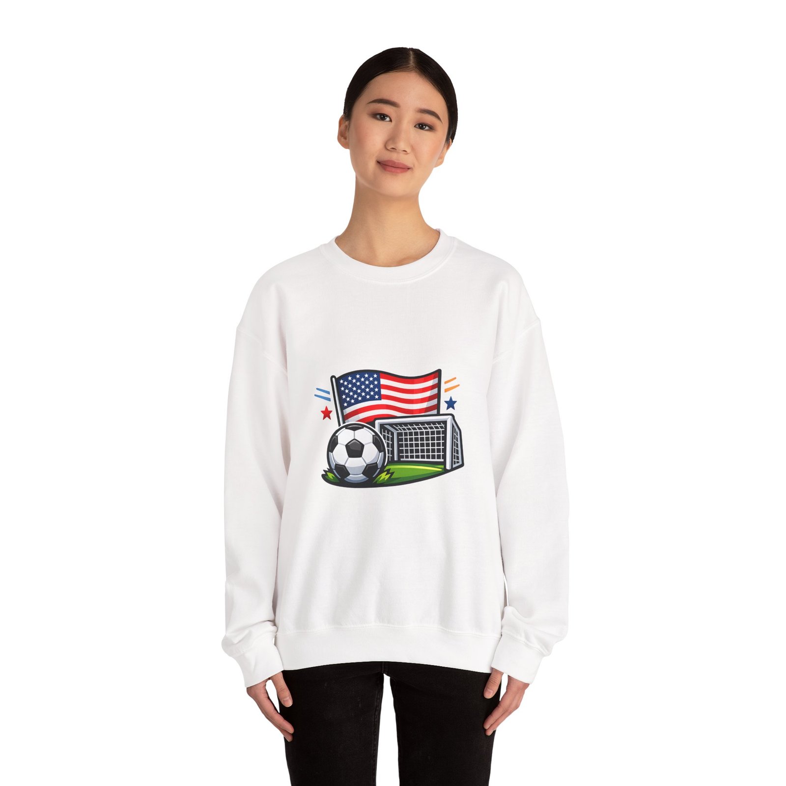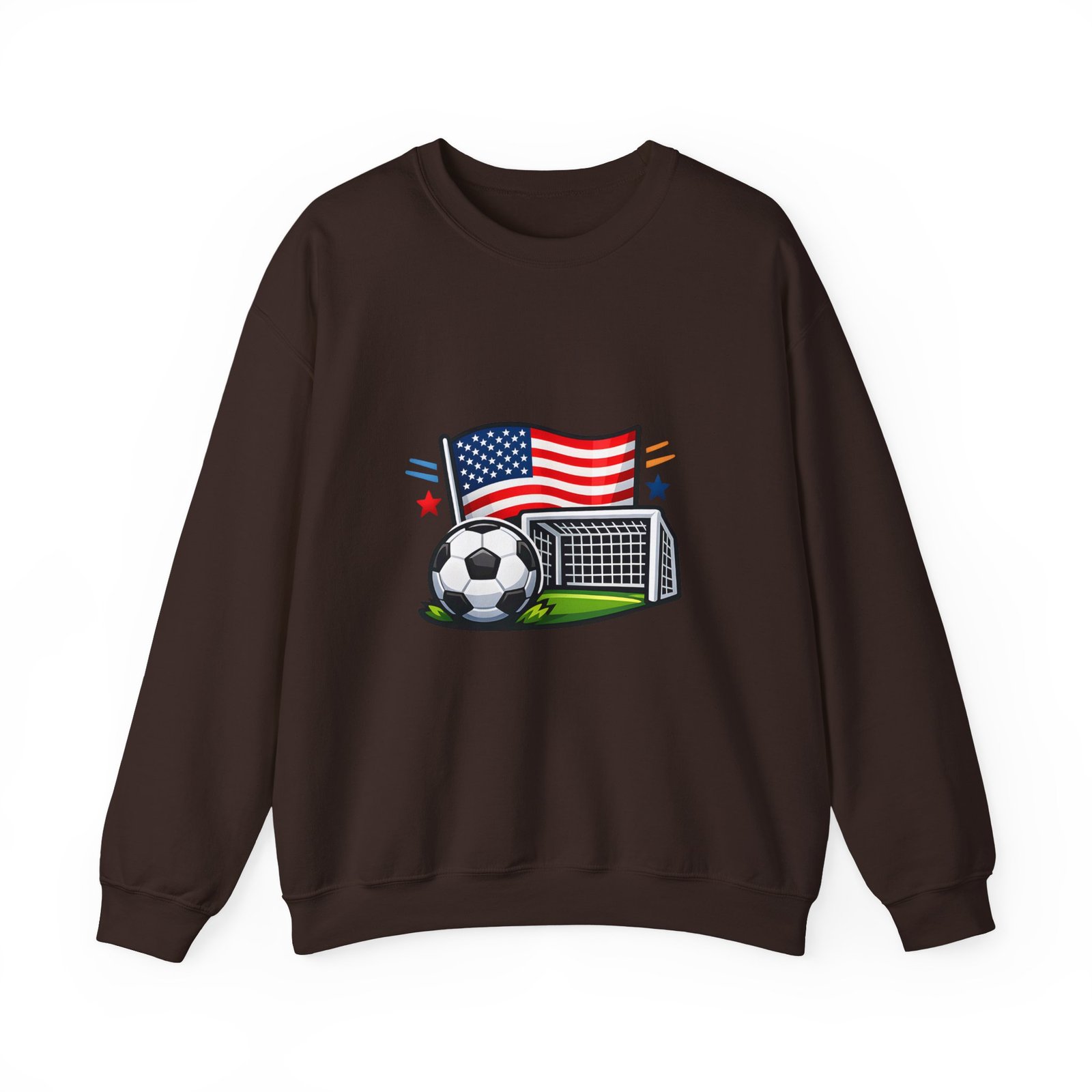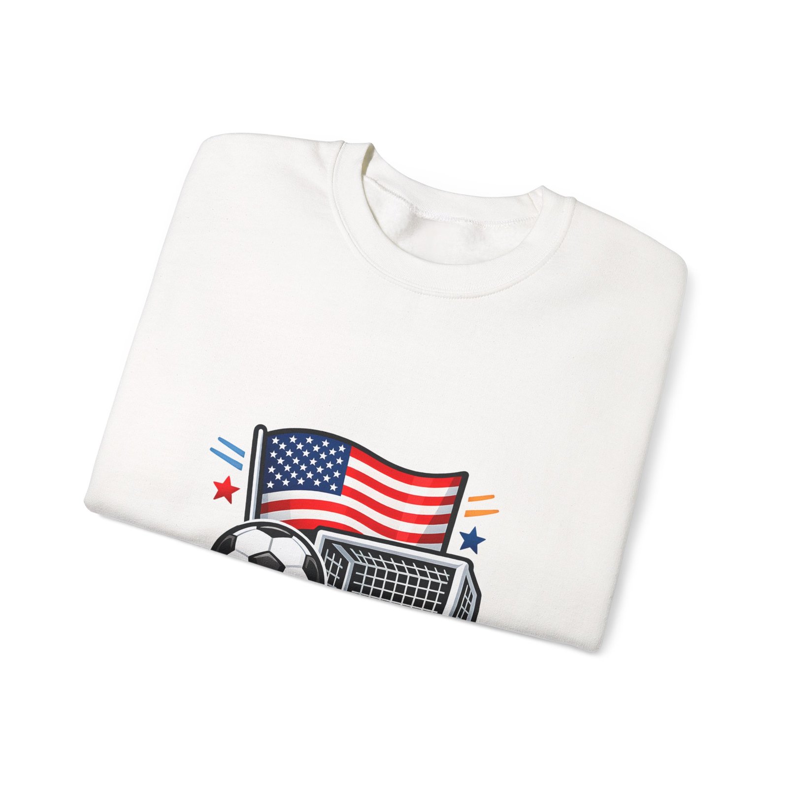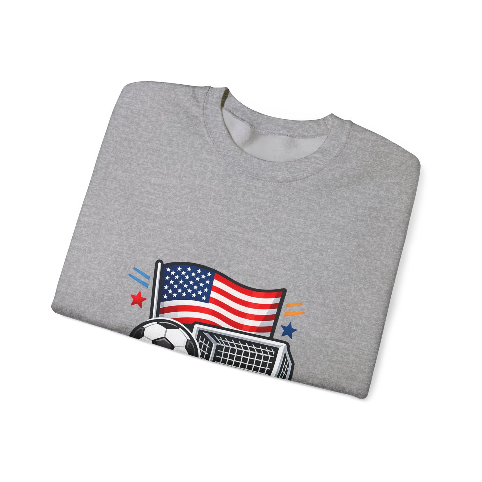 This cozy crewneck brings a quiet confidence to game day and beyond. Soft, medium‑weight fleece drapes comfortably over shoulders while a crisp soccer-and-American-flag graphic centers attention without shouting. Wear it to warm up before a match, watch the kids play from the sidelines, or layer under a jacket for chilly evening practices. The tubular knit and ribbed collar keep the silhouette tidy, and tear-away neck label means no scratchy interruptions — just relaxed comfort that lasts through seasons of play.
