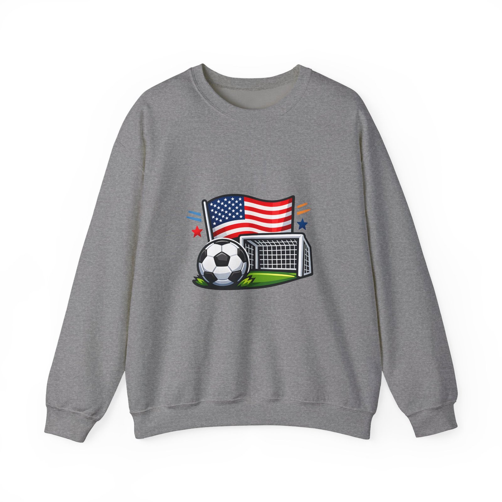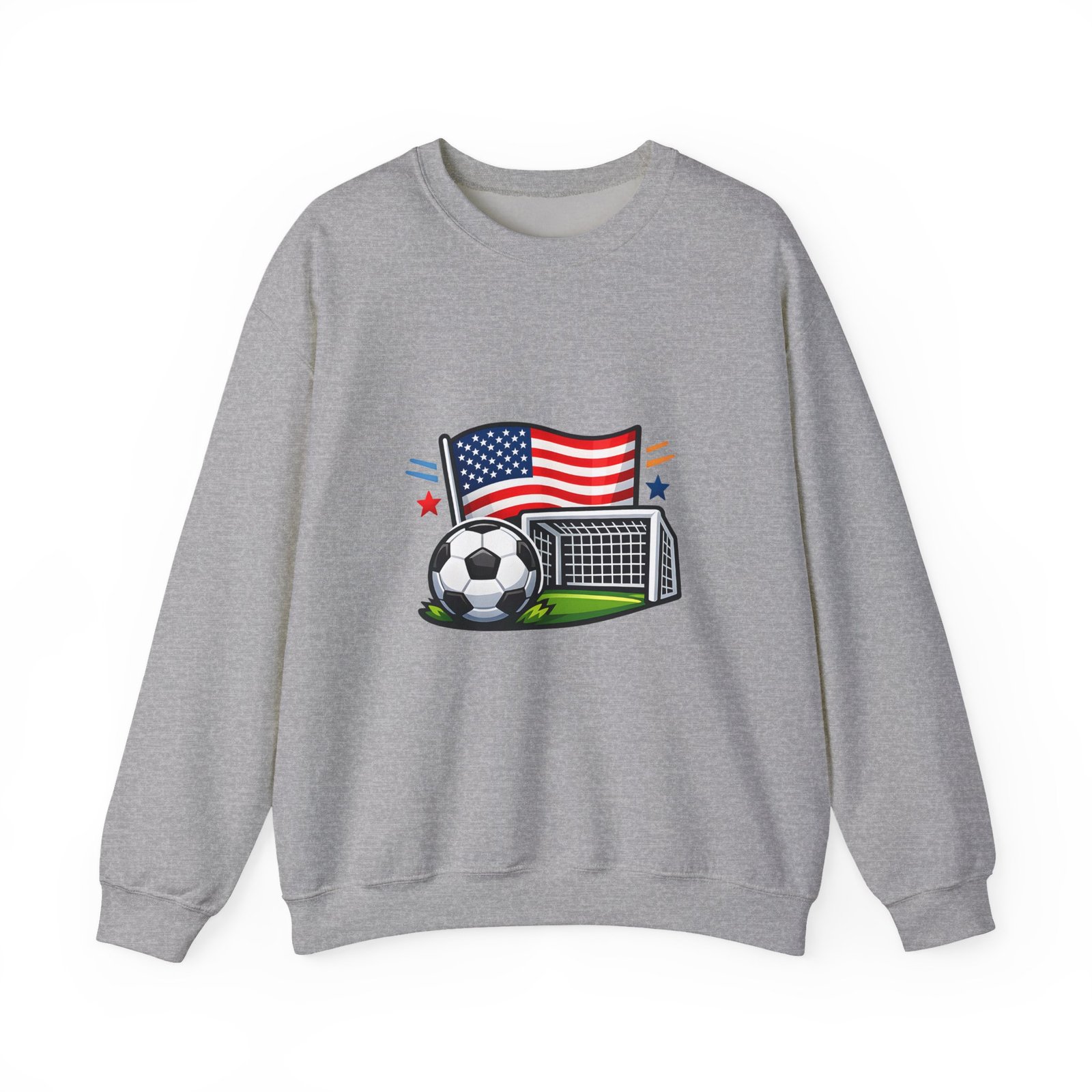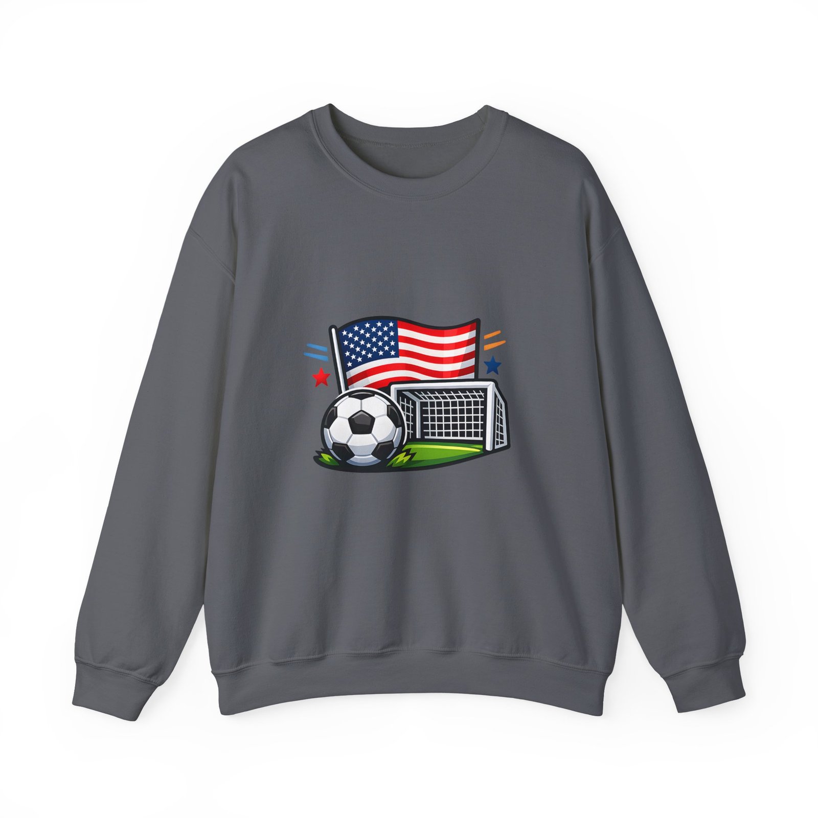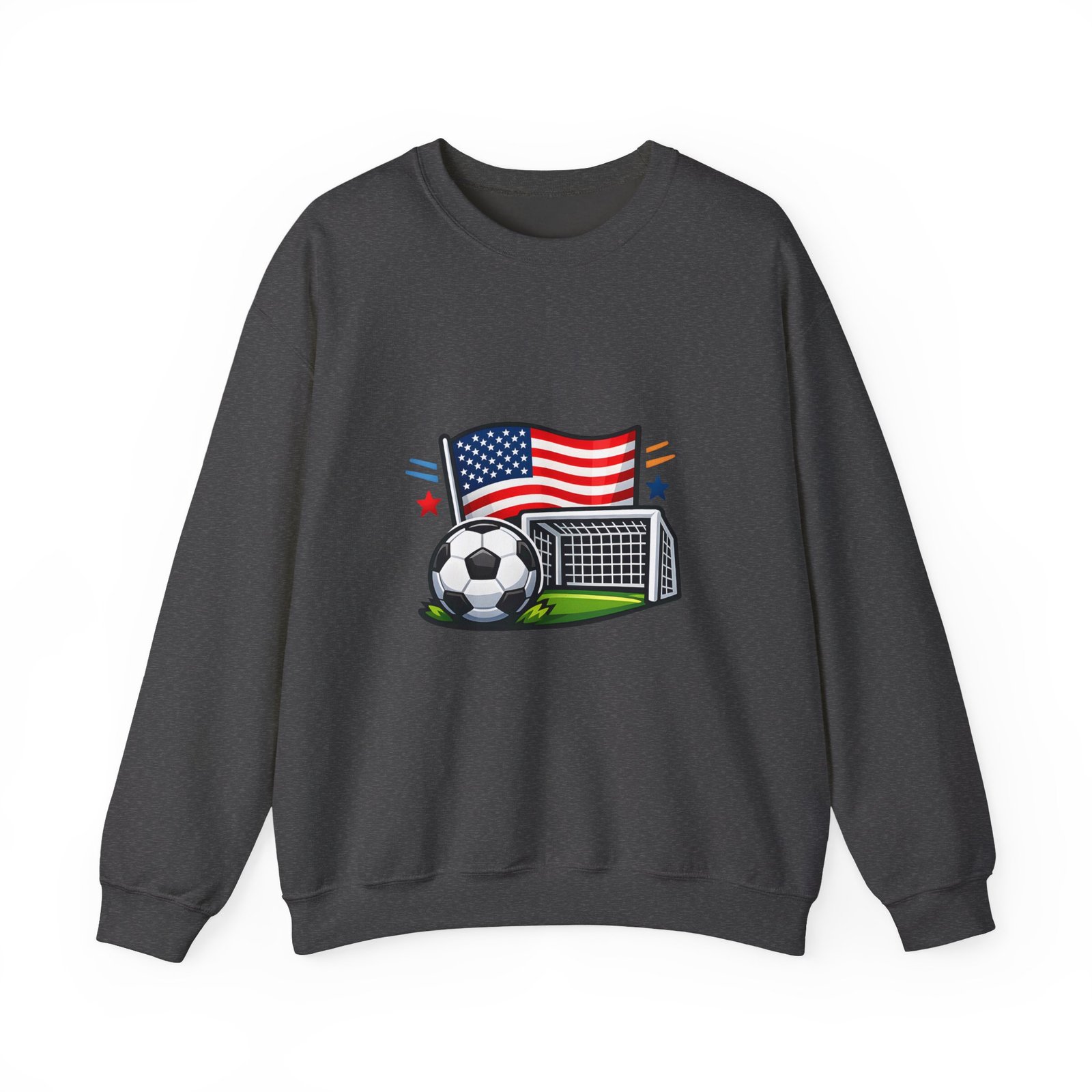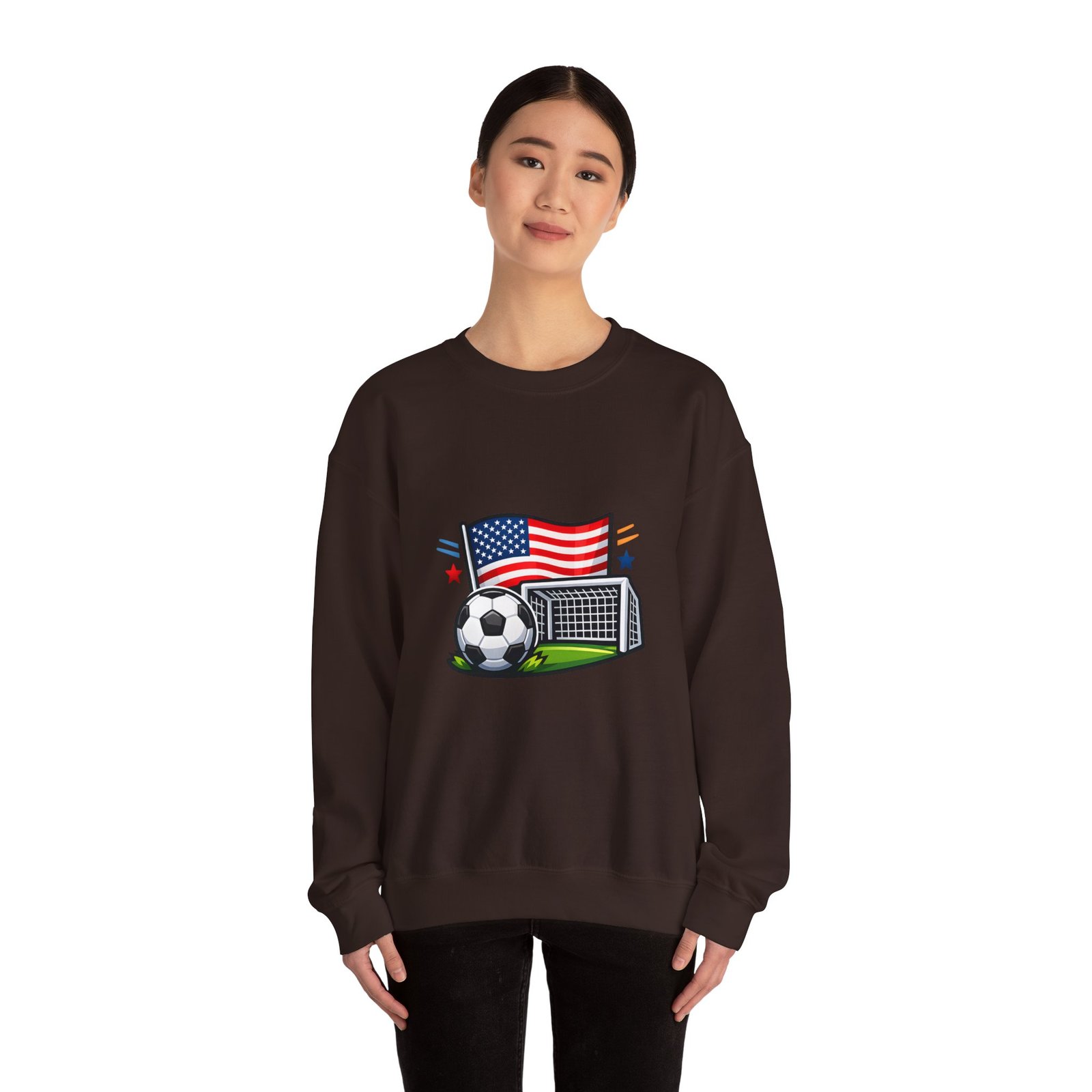 This cozy crewneck brings a quiet confidence to game day and beyond. Soft, medium‑weight fleece drapes comfortably over shoulders while a crisp soccer-and-American-flag graphic centers attention without shouting. Wear it to warm up before a match, watch the kids play from the sidelines, or layer under a jacket for chilly evening practices. The tubular knit and ribbed collar keep the silhouette tidy, and tear-away neck label means no scratchy interruptions — just relaxed comfort that lasts through seasons of play.