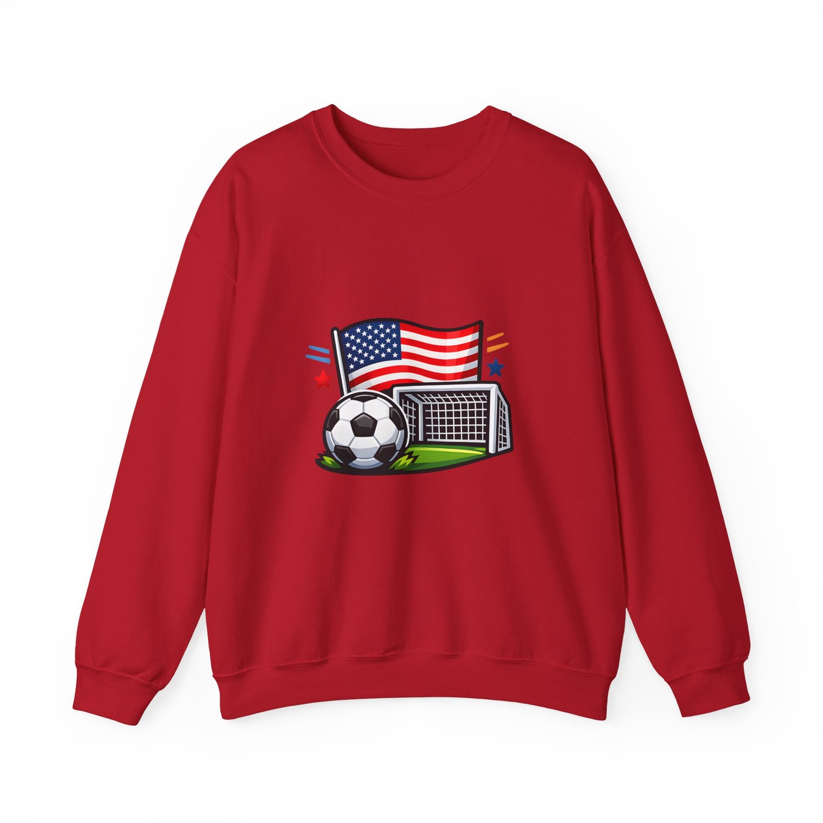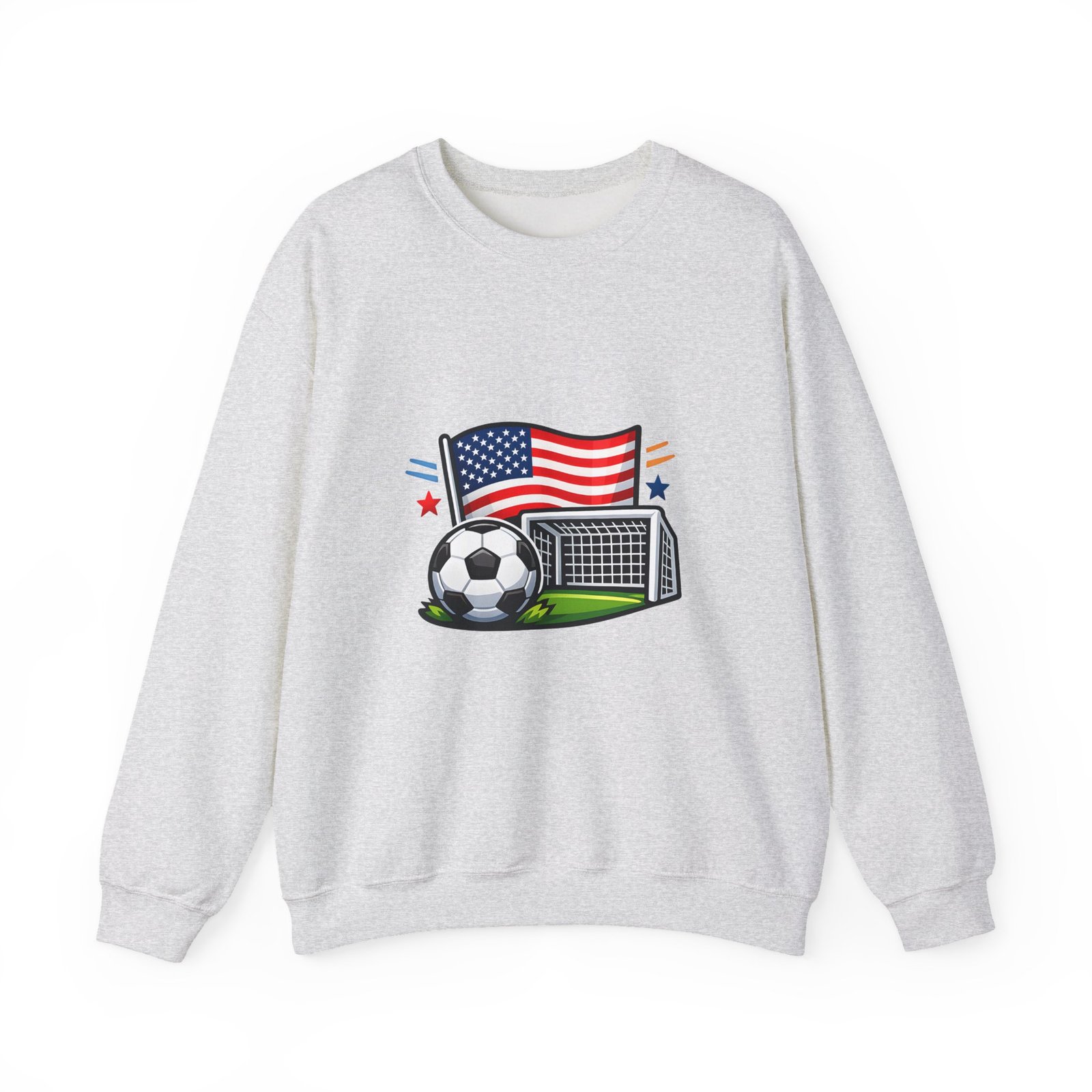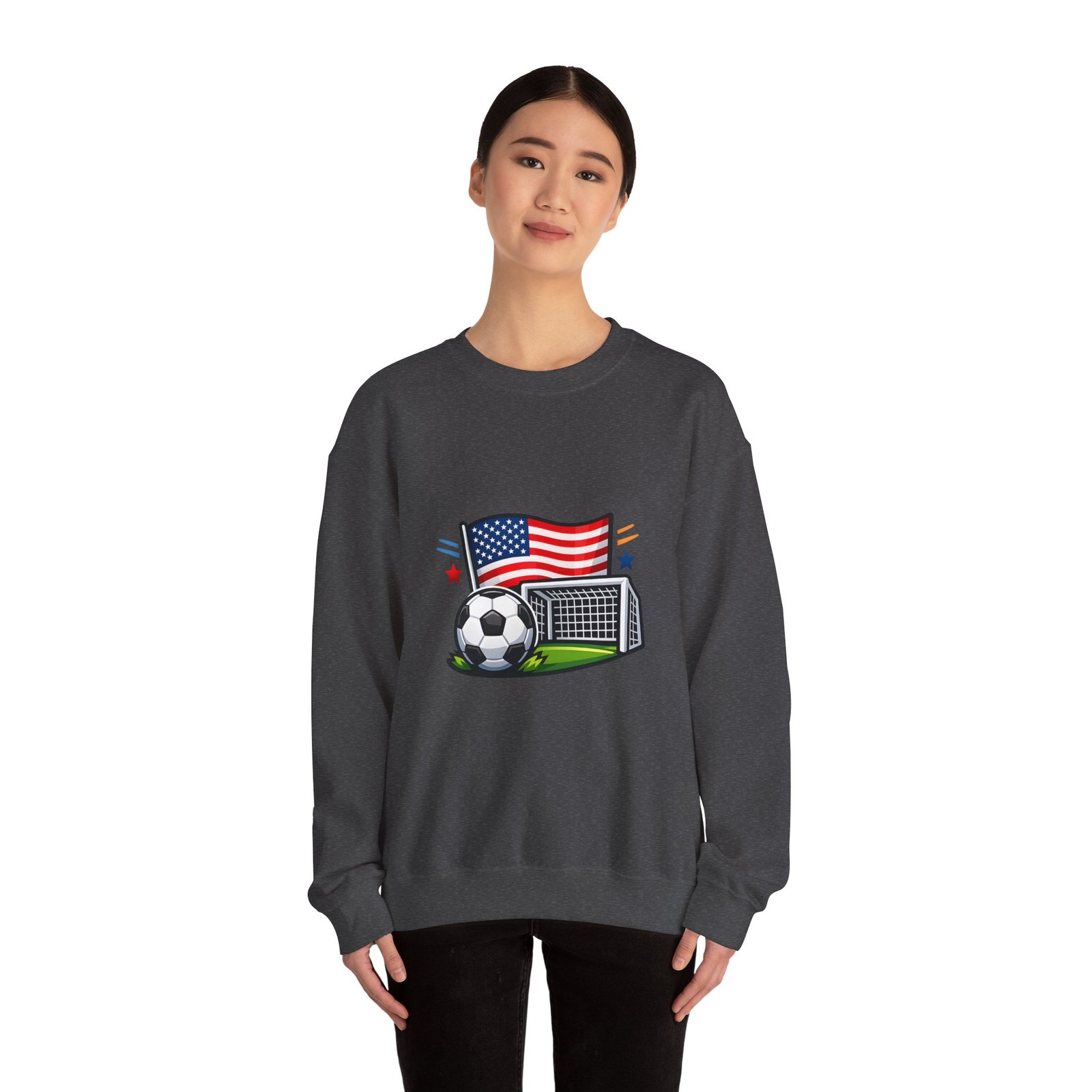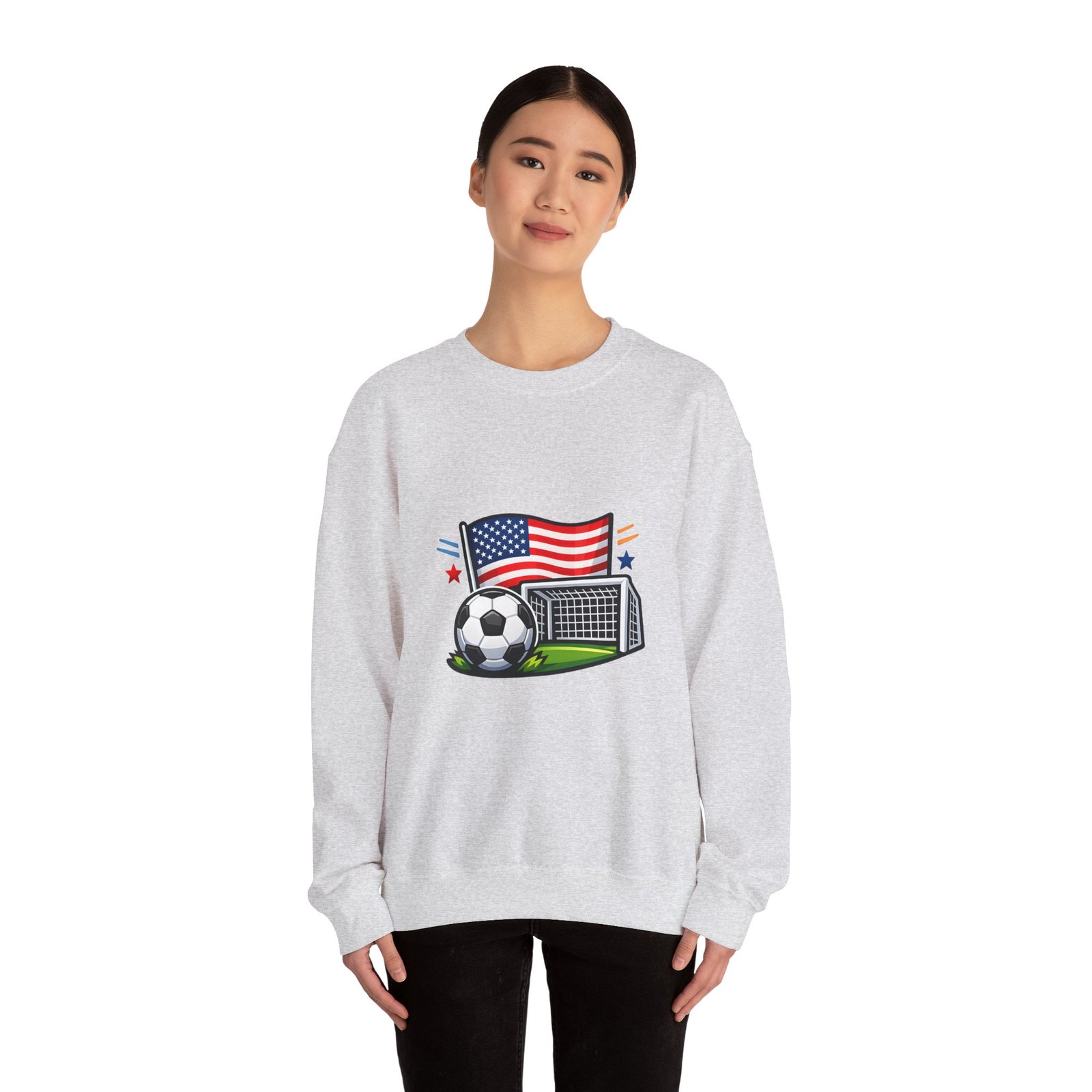 This cozy crewneck brings a quiet confidence to game day and beyond. Soft, medium‑weight fleece drapes comfortably over shoulders while a crisp soccer-and-American-flag graphic centers attention without shouting. Wear it to warm up before a match, watch the kids play from the sidelines, or layer under a jacket for chilly evening practices. The tubular knit and ribbed collar keep the silhouette tidy, and tear-away neck label means no scratchy interruptions — just relaxed comfort that lasts through seasons of play.