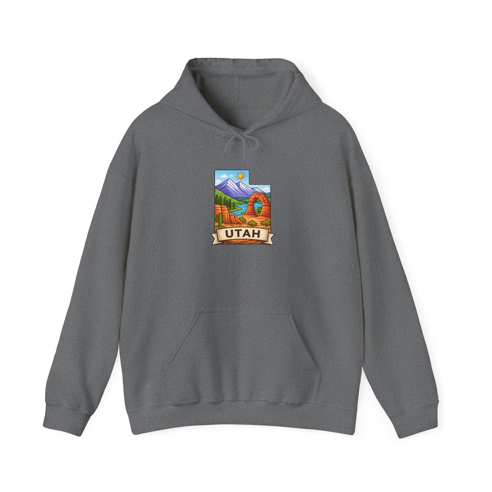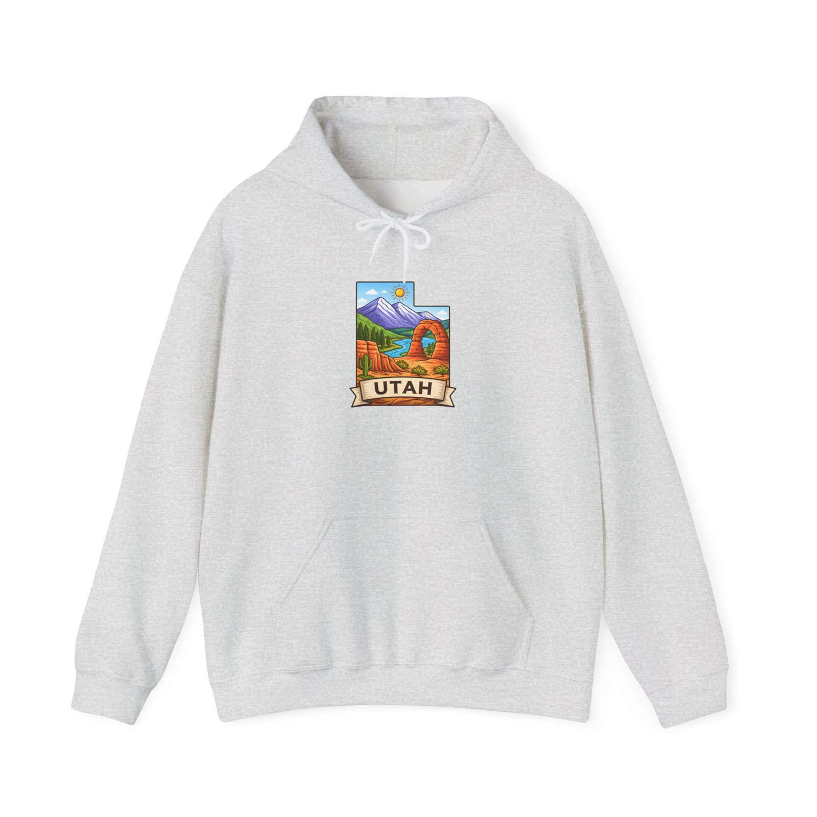 Lightweight warmth meets road-trip charm. This hoodie carries a hand-painted Utah scene—red arches, desert ridgelines and a wide sky—centered on a clean white canvas. Slip it on after a trail day or while mapping out the next route. The roomy kangaroo pocket and double-lined hood feel familiar and protective, while the subtle art on the chest keeps the vibe adventurous but easygoing. It layers without bulk and pairs naturally with hiking boots, denim, or campfire evenings under stars.