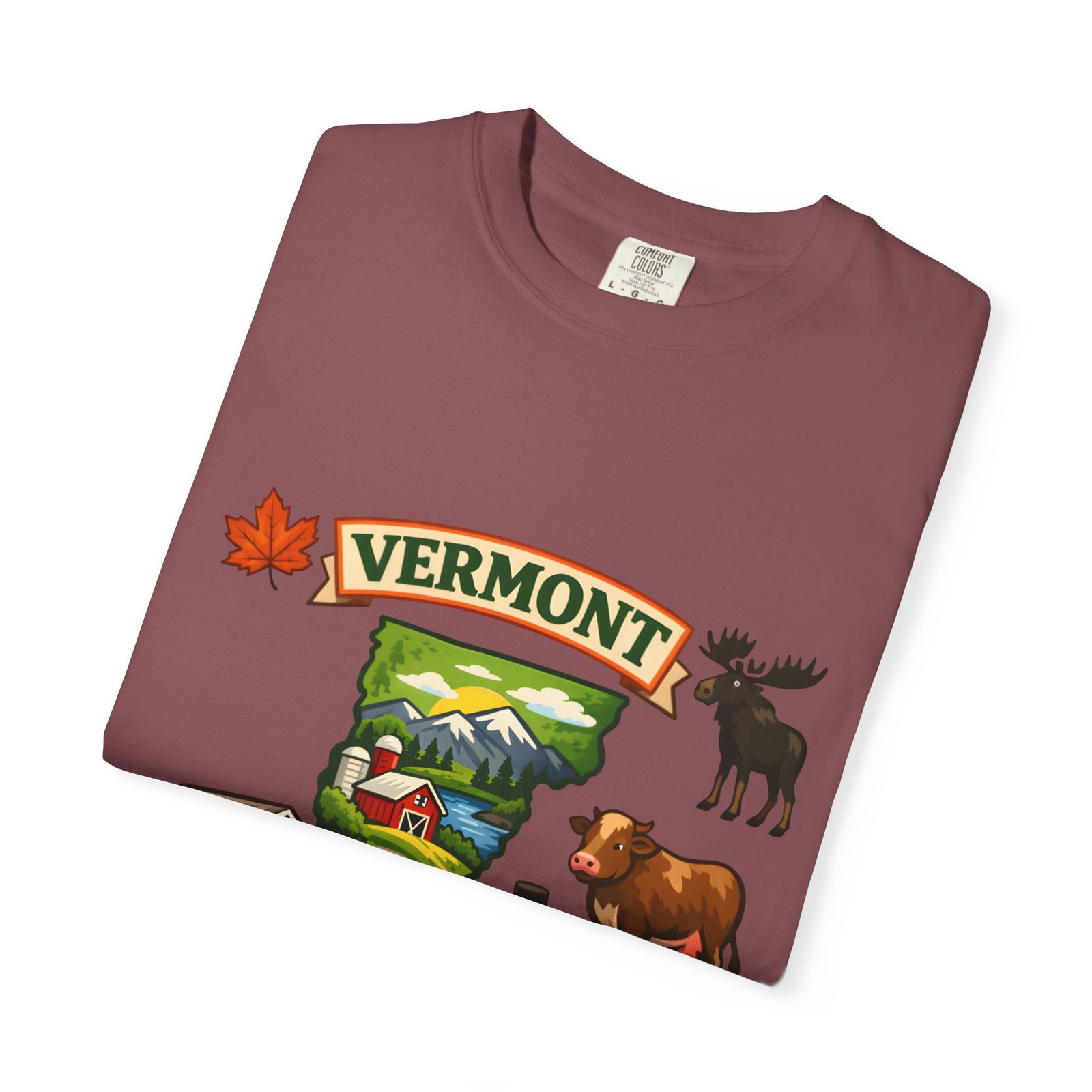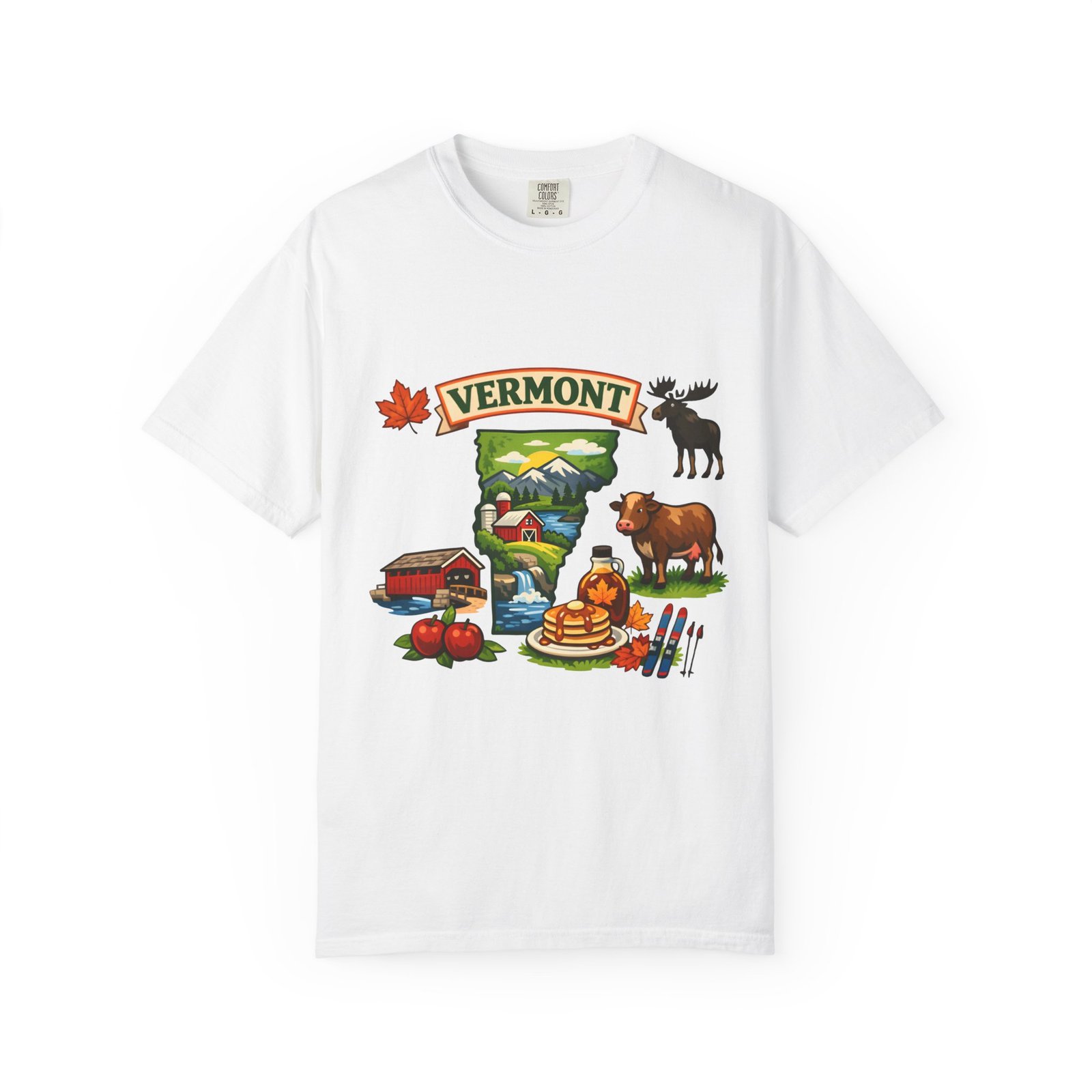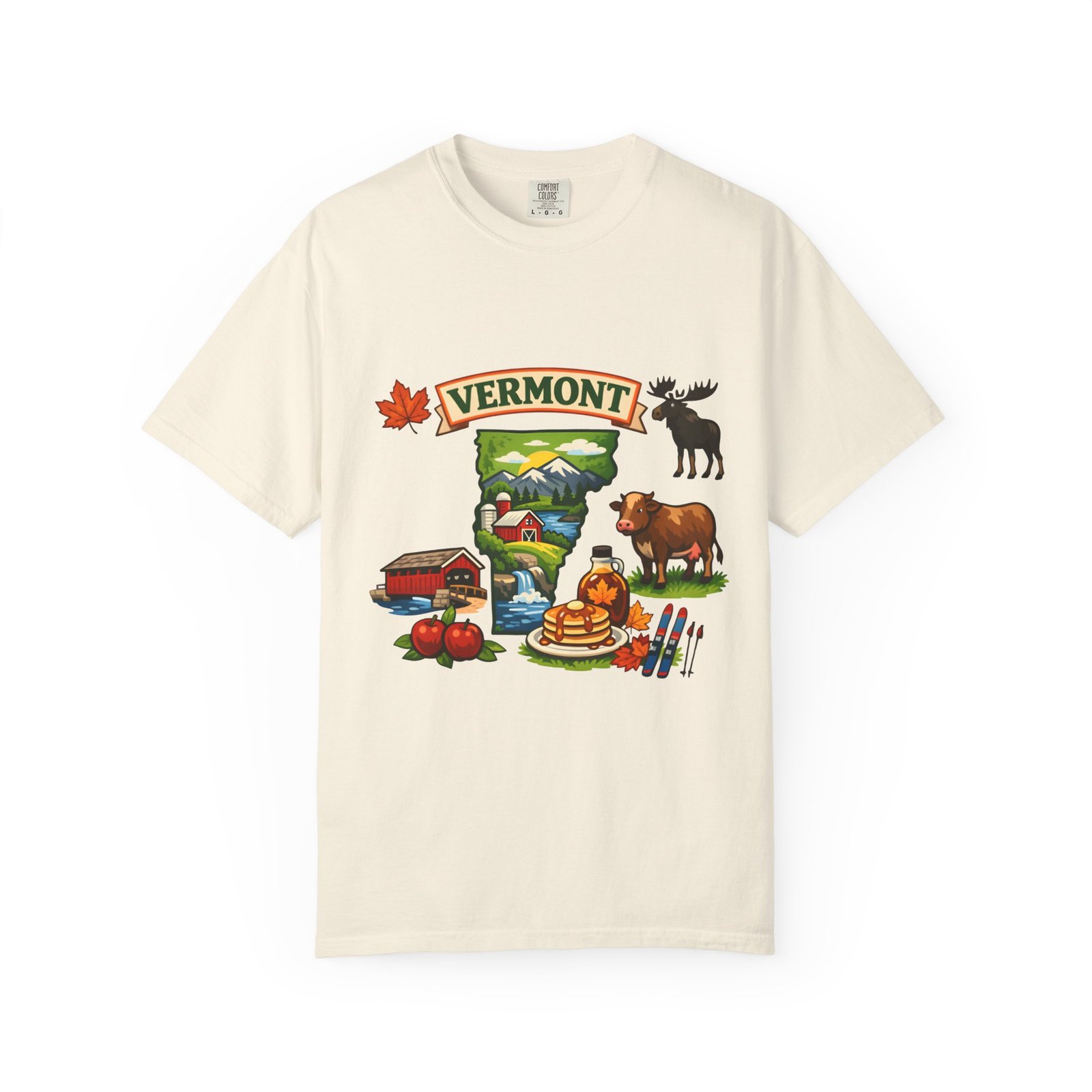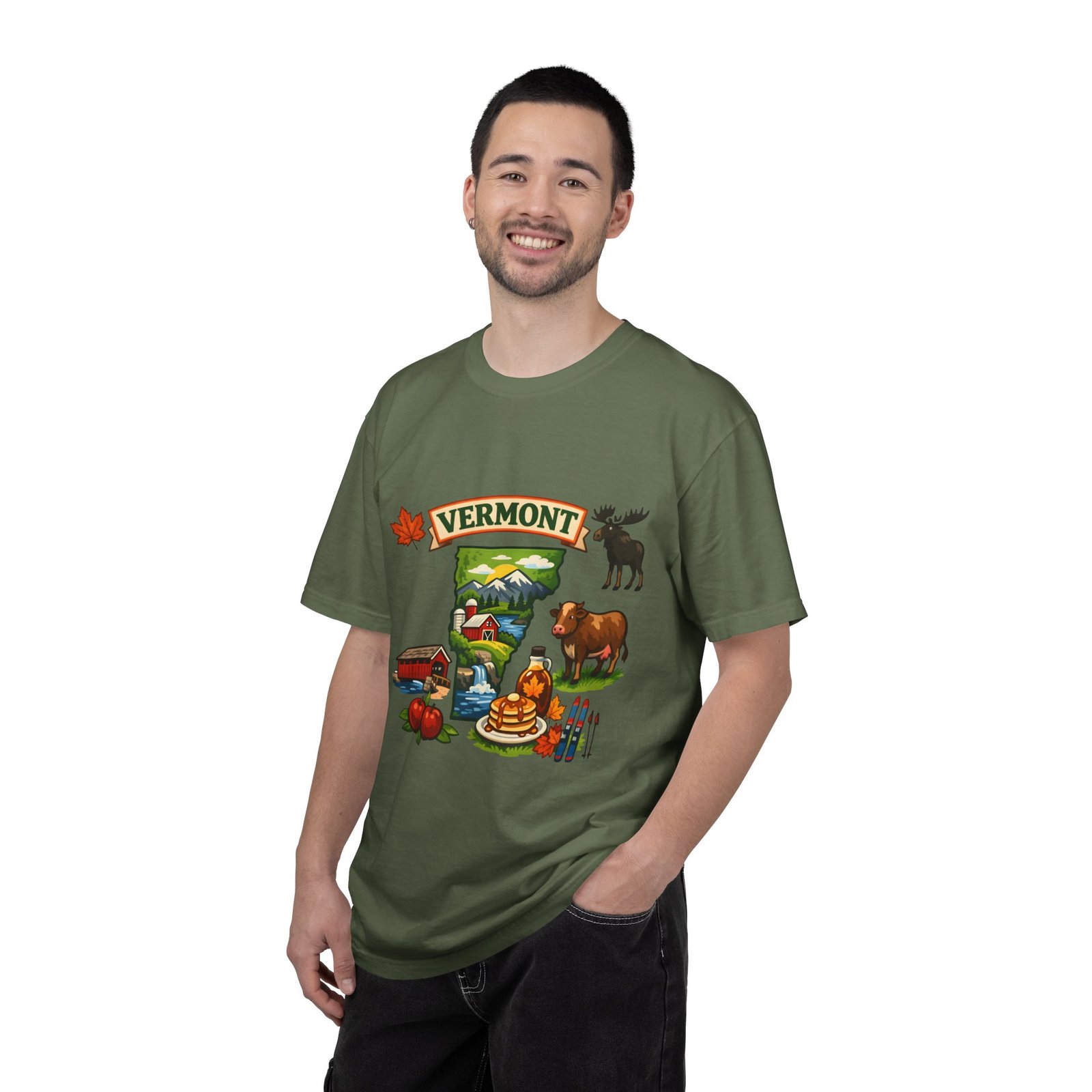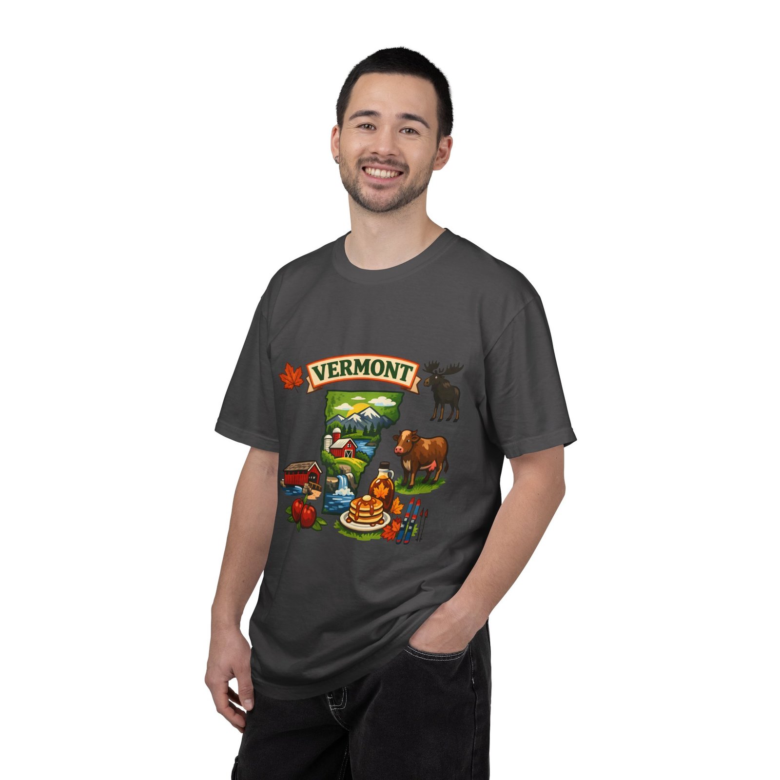 This relaxed, garment-dyed tee carries a warm, small-state charm — bright, slightly vintage illustrations of rolling hills, a maple leaf, a moose, a cow, a red barn, maple syrup and pancakes form a cozy Vermont collage at the chest. The heavier 6.1 oz cotton and soft post-dye finish give the shirt a lived-in feel from day one. Wear it on cool mornings at the farmers’ market, at a maple-sugaring weekend, or while driving backcountry roads with a thermos in the cup holder. The image feels like a friendly postcard: familiar, homey, and quietly proud. Because the tee is roomy and pre-shrunk, it layers easily under flannel or stands alone with worn jeans. If you collect state moments, love hands-on weekends in the country, or simply want a casual reminder of woodsmoke and syrup, this shirt slips into that life without fuss.