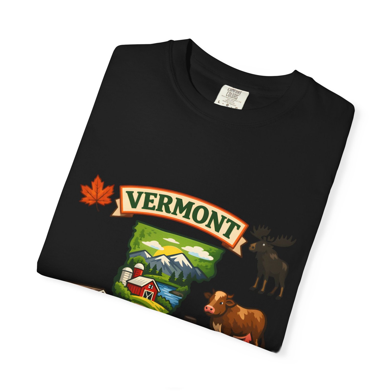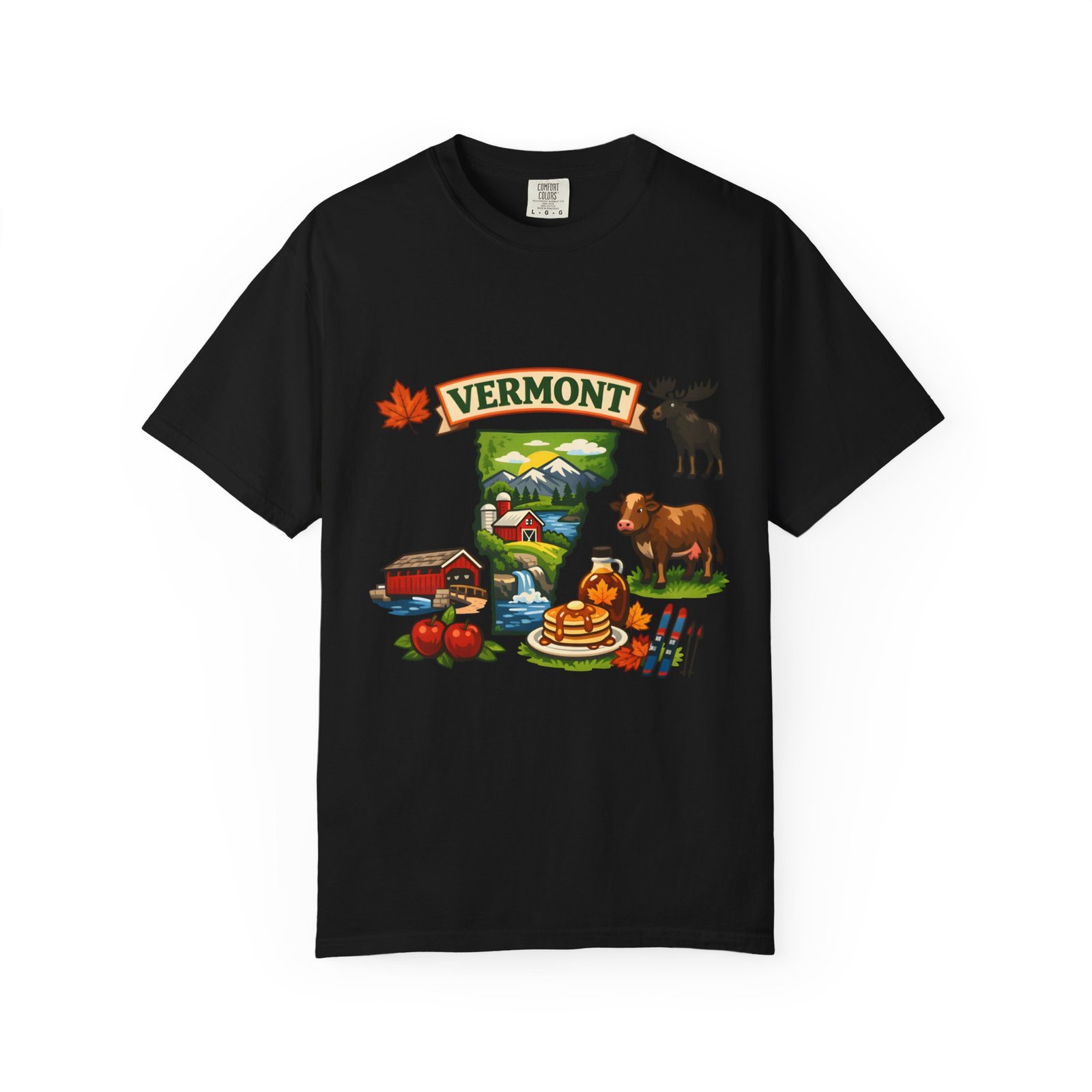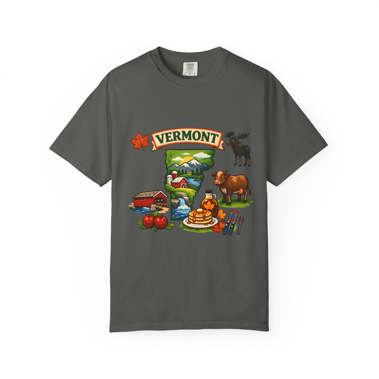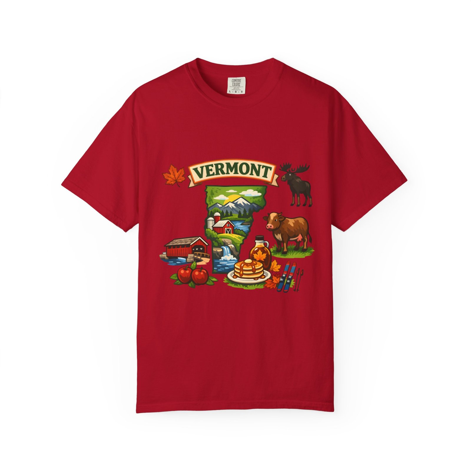 This relaxed, garment-dyed tee carries a warm, small-state charm — bright, slightly vintage illustrations of rolling hills, a maple leaf, a moose, a cow, a red barn, maple syrup and pancakes form a cozy Vermont collage at the chest. The heavier 6.1 oz cotton and soft post-dye finish give the shirt a lived-in feel from day one. Wear it on cool mornings at the farmers’ market, at a maple-sugaring weekend, or while driving backcountry roads with a thermos in the cup holder. The image feels like a friendly postcard: familiar, homey, and quietly proud. Because the tee is roomy and pre-shrunk, it layers easily under flannel or stands alone with worn jeans. If you collect state moments, love hands-on weekends in the country, or simply want a casual reminder of woodsmoke and syrup, this shirt slips into that life without fuss.