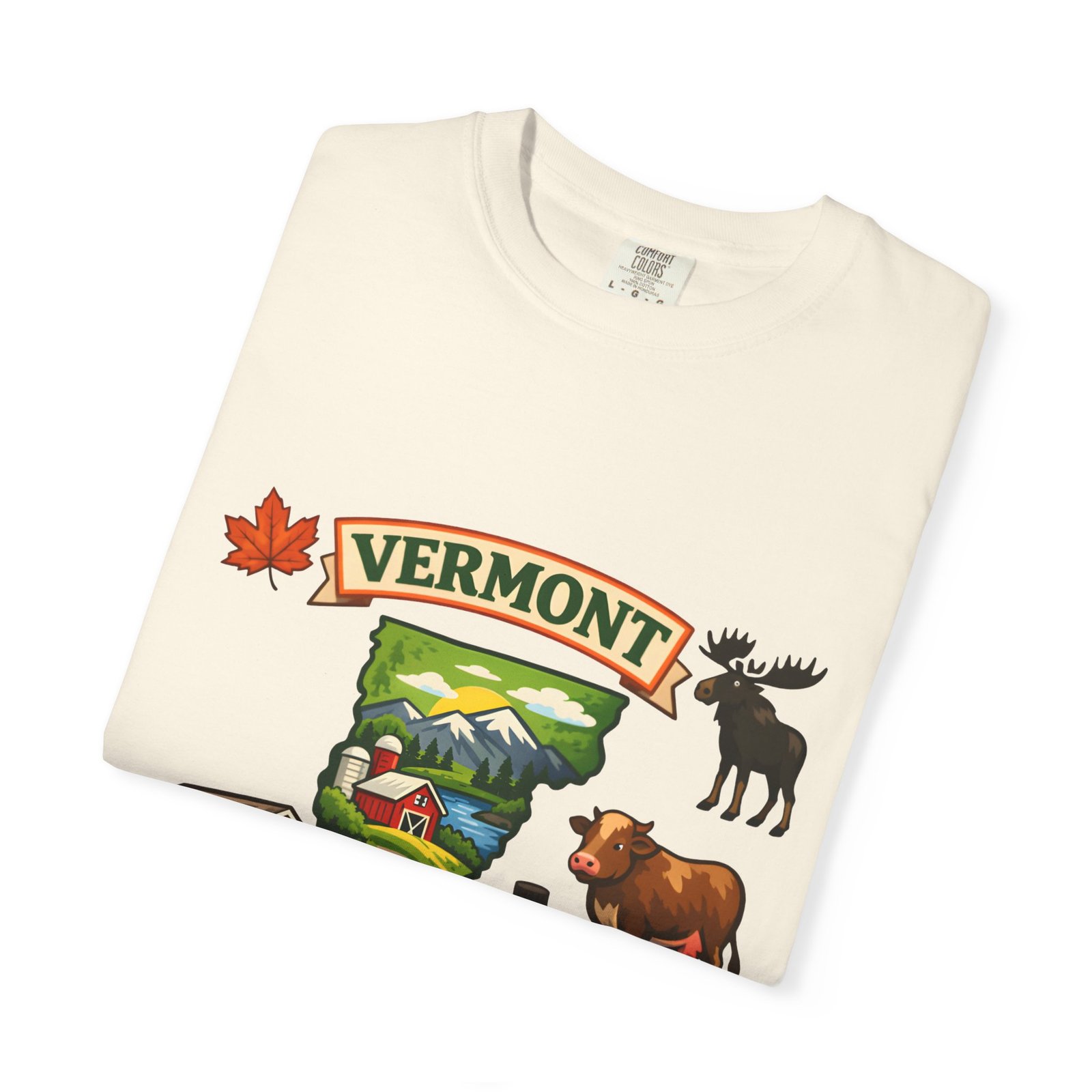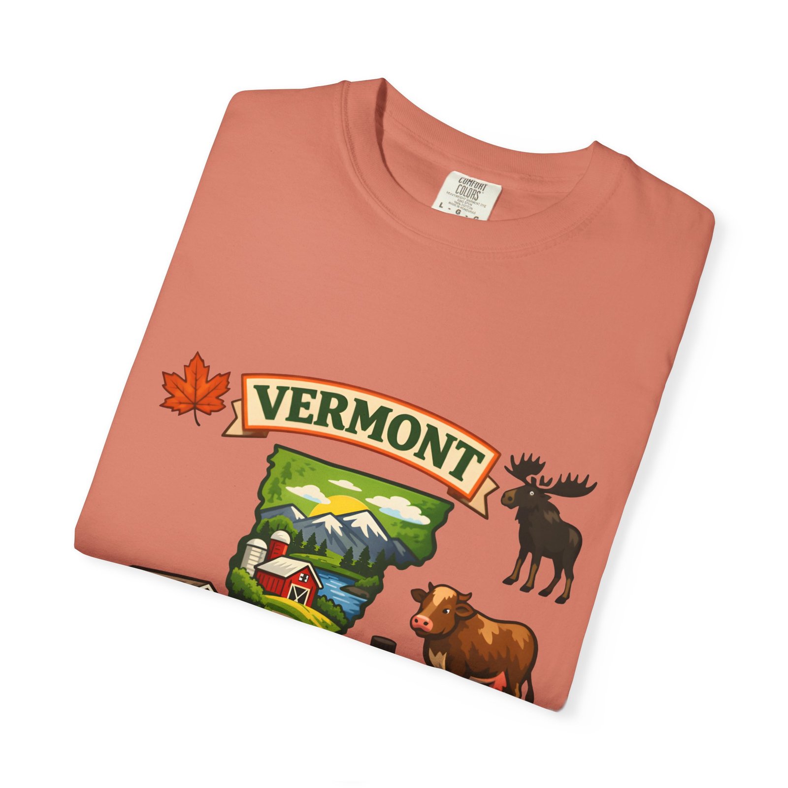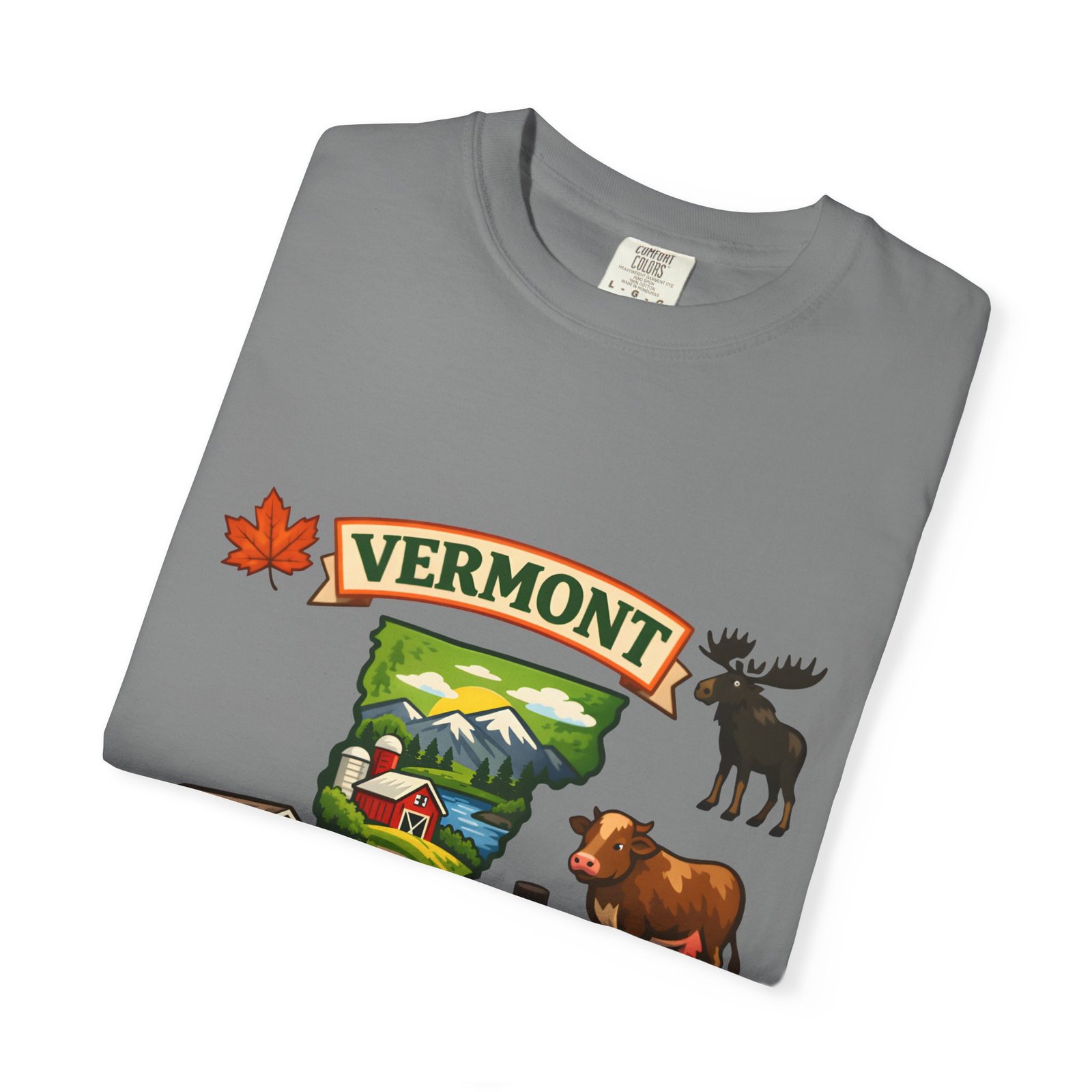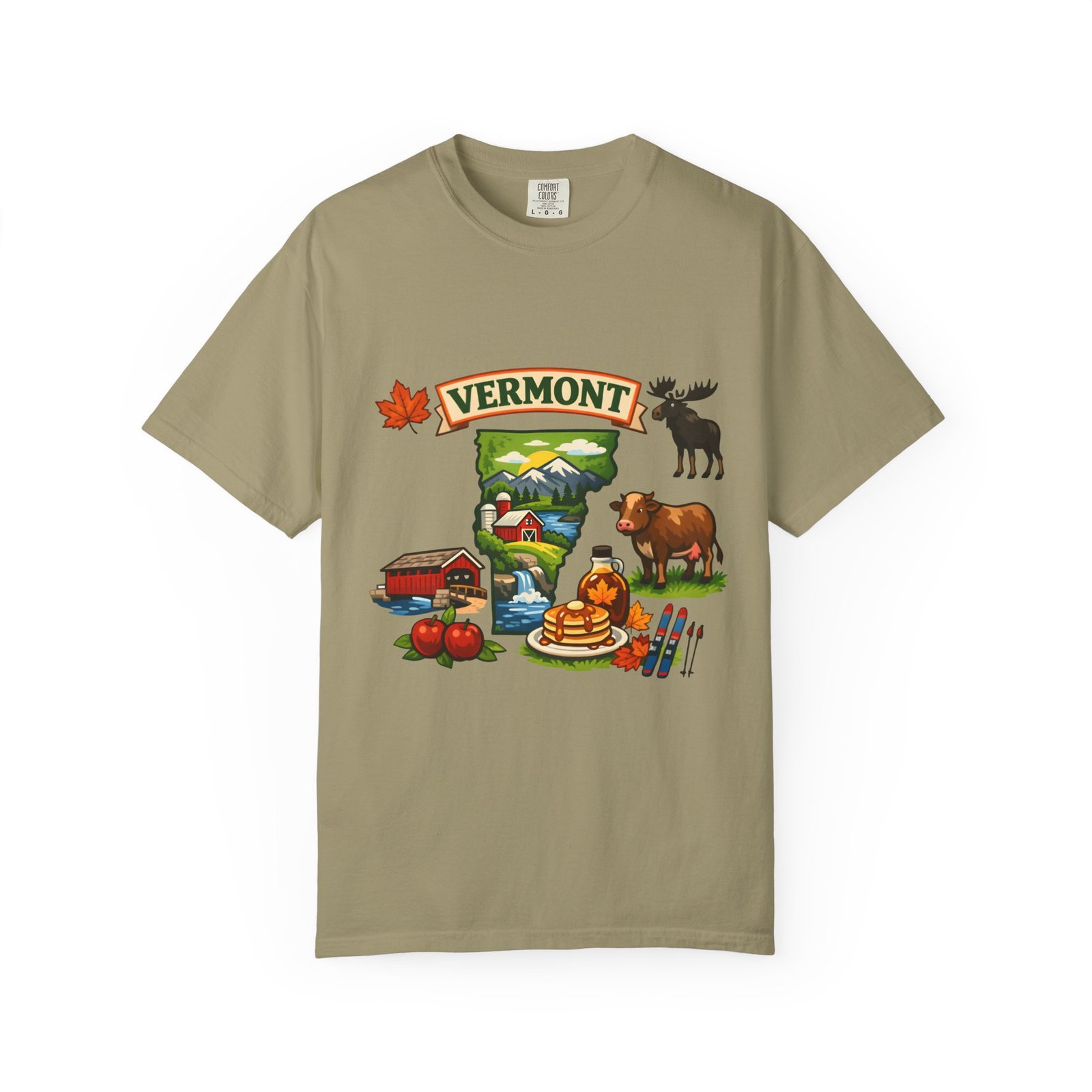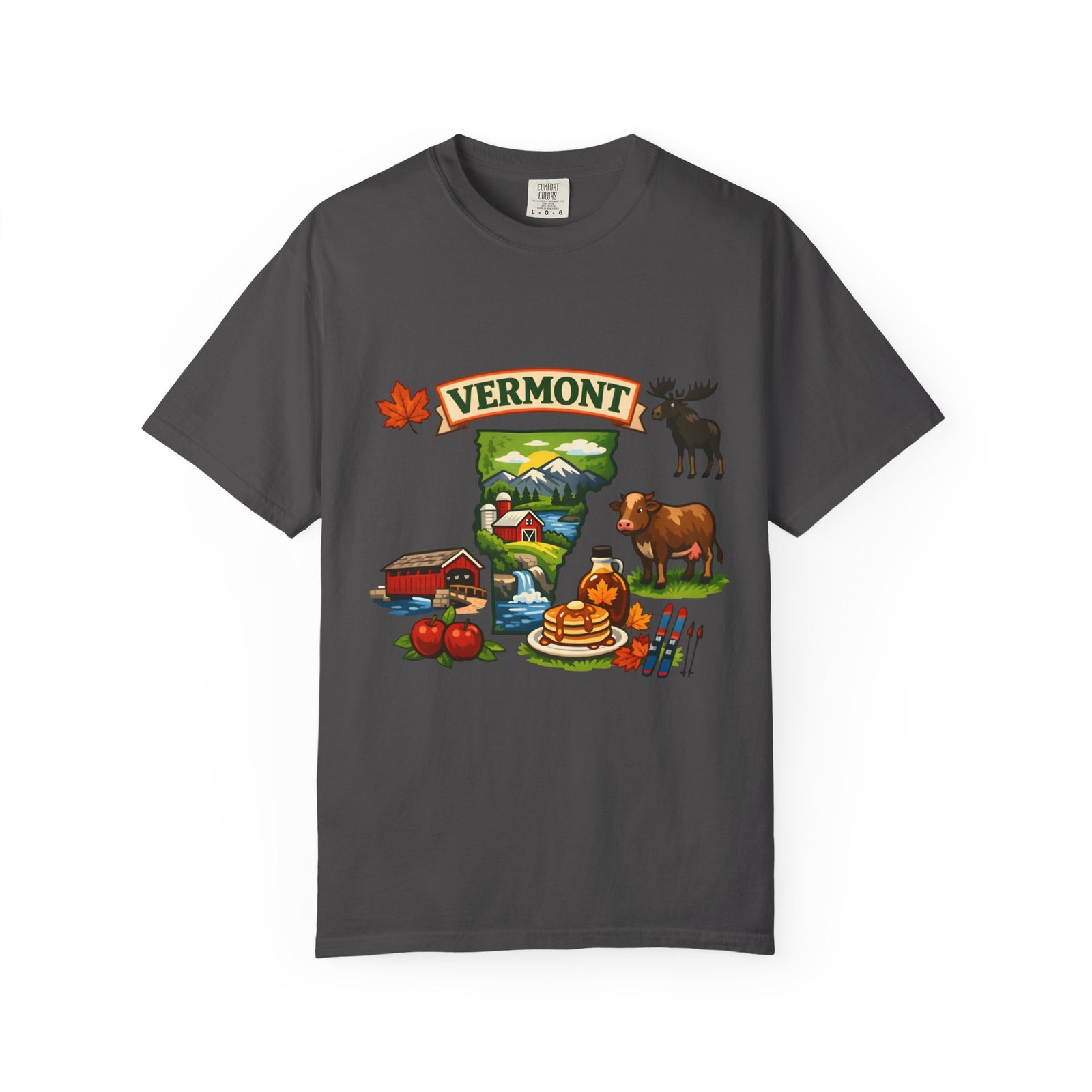 This relaxed, garment-dyed tee carries a warm, small-state charm — bright, slightly vintage illustrations of rolling hills, a maple leaf, a moose, a cow, a red barn, maple syrup and pancakes form a cozy Vermont collage at the chest. The heavier 6.1 oz cotton and soft post-dye finish give the shirt a lived-in feel from day one. Wear it on cool mornings at the farmers’ market, at a maple-sugaring weekend, or while driving backcountry roads with a thermos in the cup holder. The image feels like a friendly postcard: familiar, homey, and quietly proud. Because the tee is roomy and pre-shrunk, it layers easily under flannel or stands alone with worn jeans. If you collect state moments, love hands-on weekends in the country, or simply want a casual reminder of woodsmoke and syrup, this shirt slips into that life without fuss.