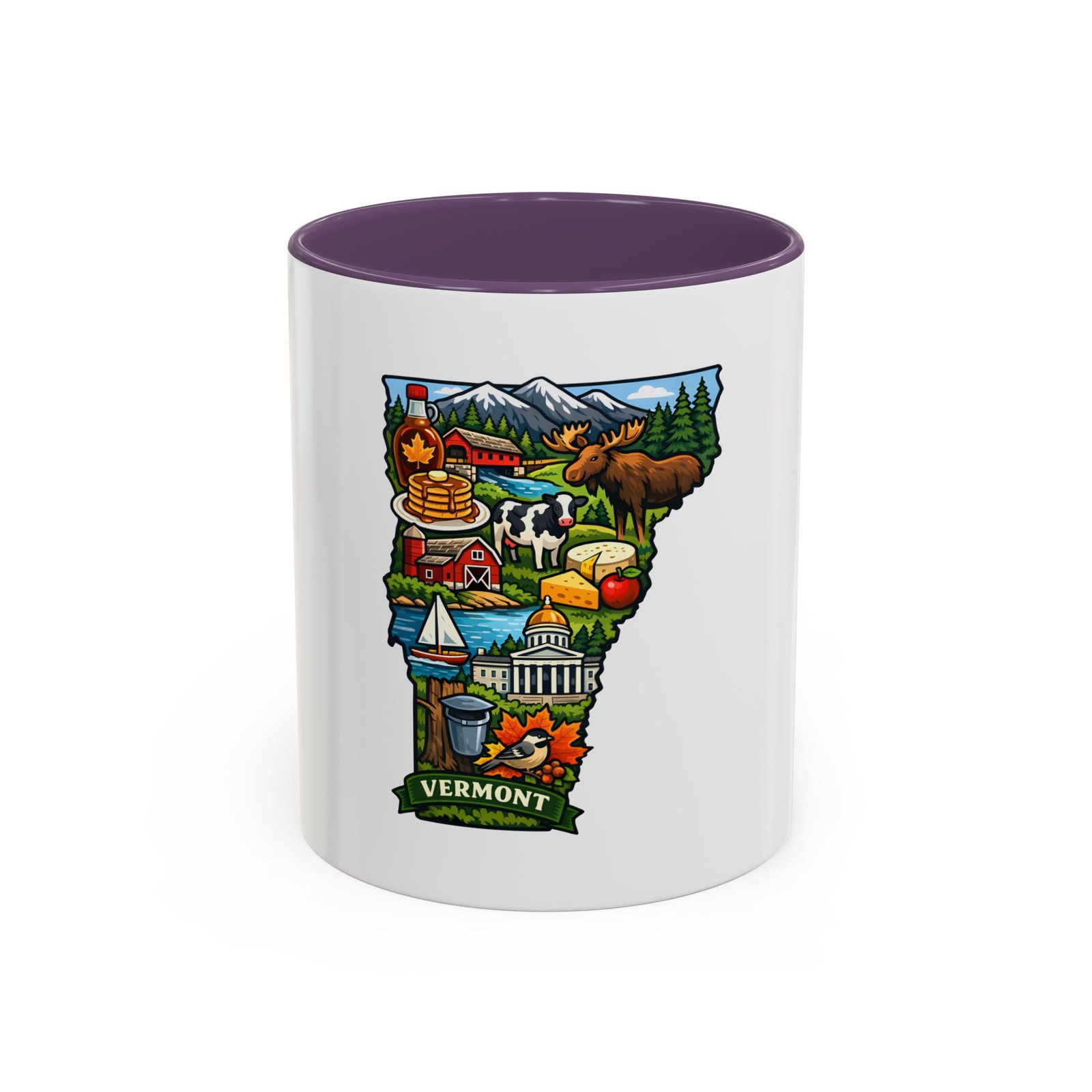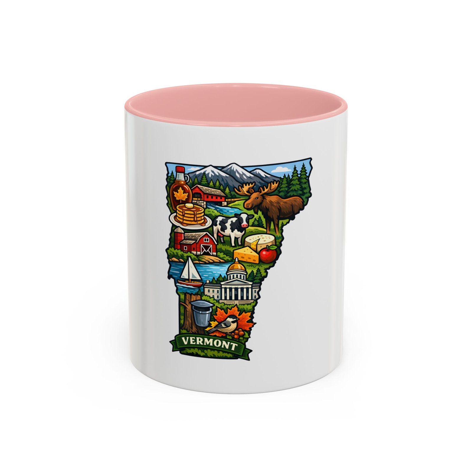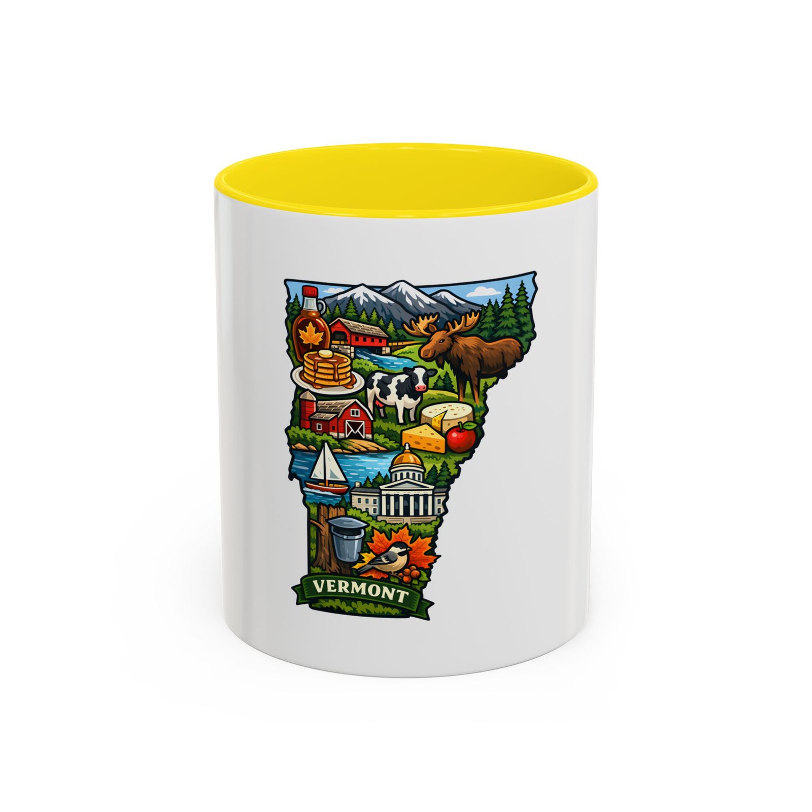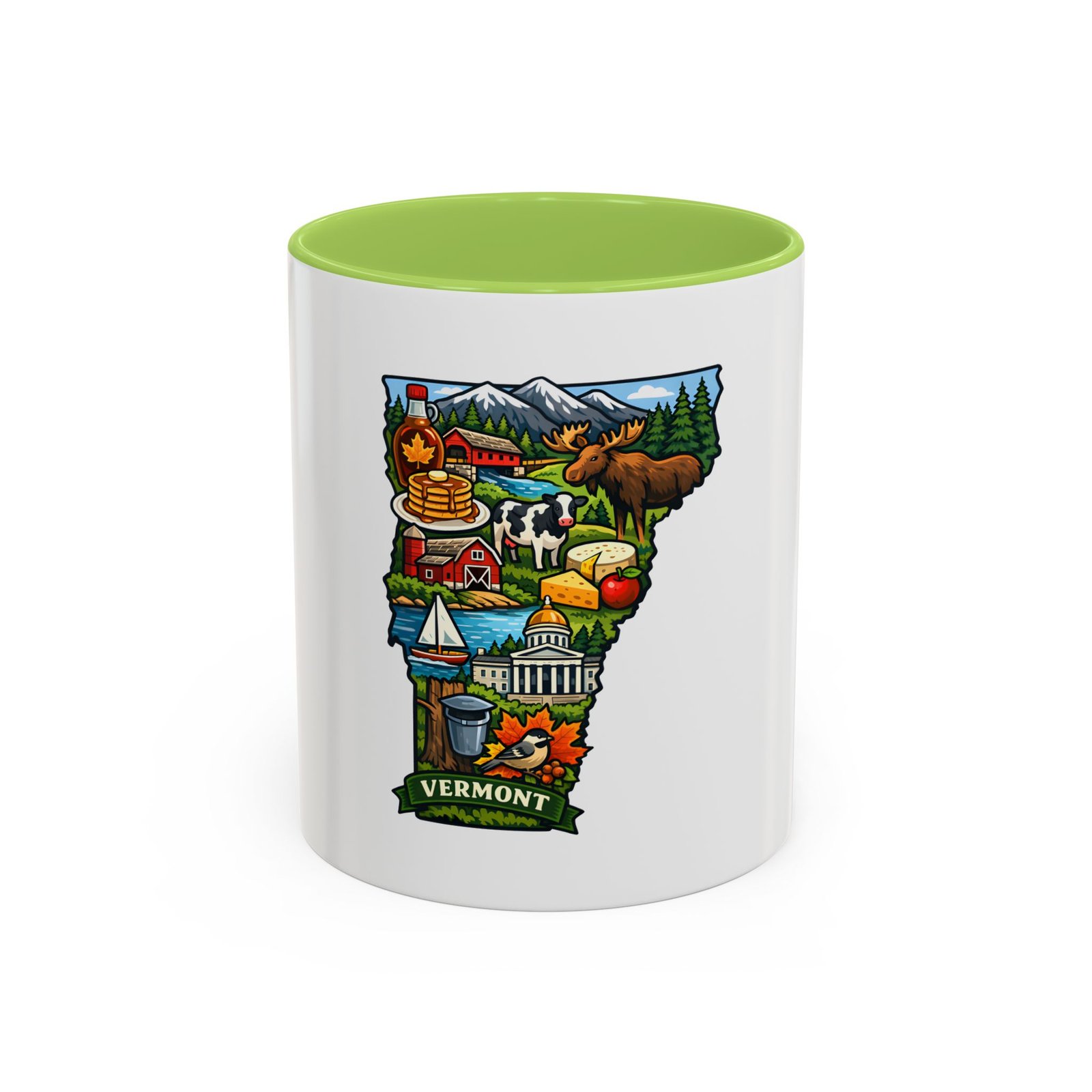 Wake up to Vermont. This ceramic mug carries a bright, illustrated map of the Green Mountain State—pancakes and maple syrup, cows in green pastures, the state capitol dome, sailboats and fall leaves—framed by a contrasting colored interior and handle. It sits warm in your hands with a glossy finish and C-shaped grip, turning an ordinary coffee moment into a little piece of home or a reminder of mountain mornings and lake afternoons. Durable printing keeps the colors lively through daily use, and the microwave- and dishwasher-safe construction makes it an easy companion for busy mornings or relaxed weekend sips.