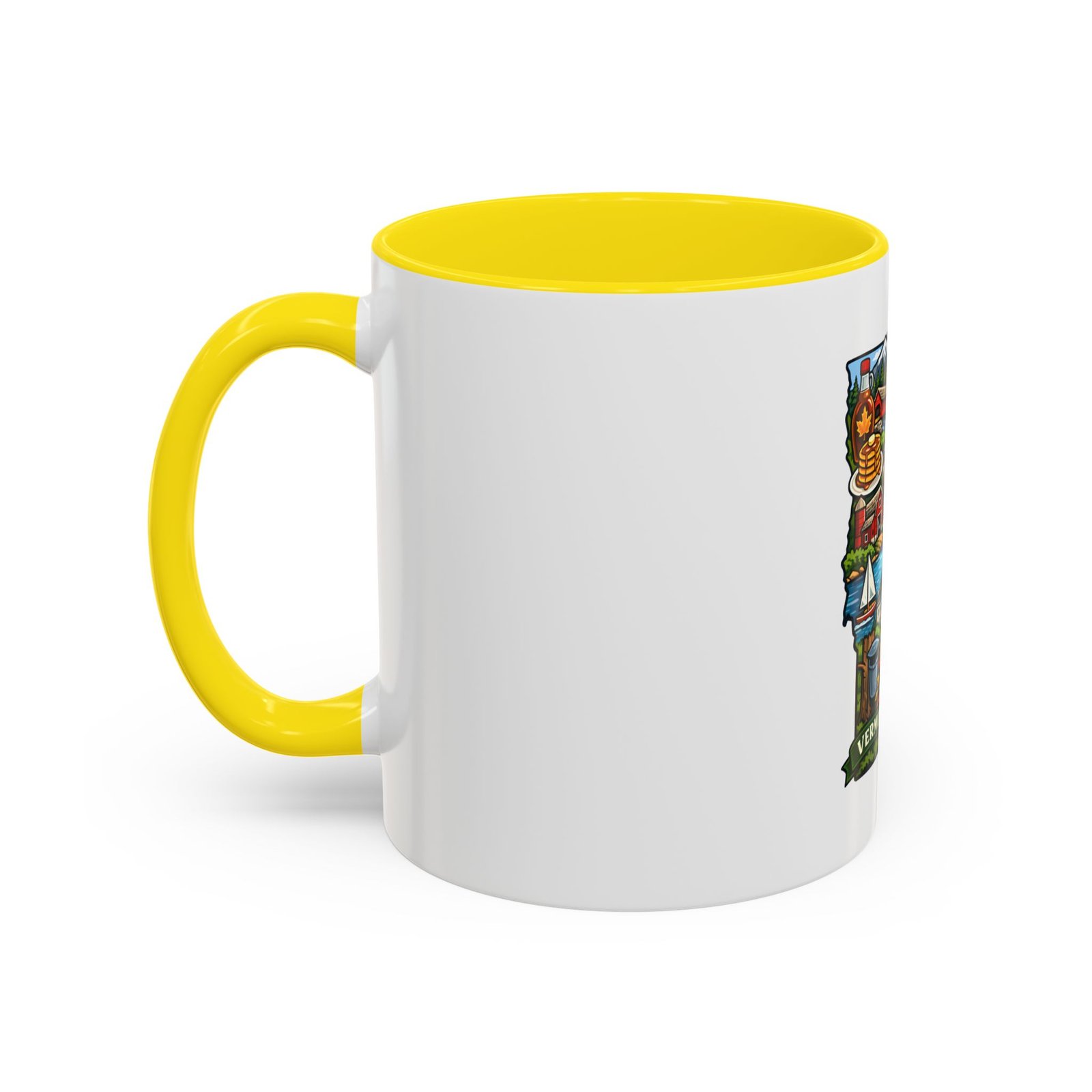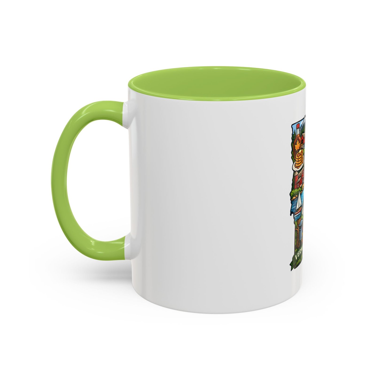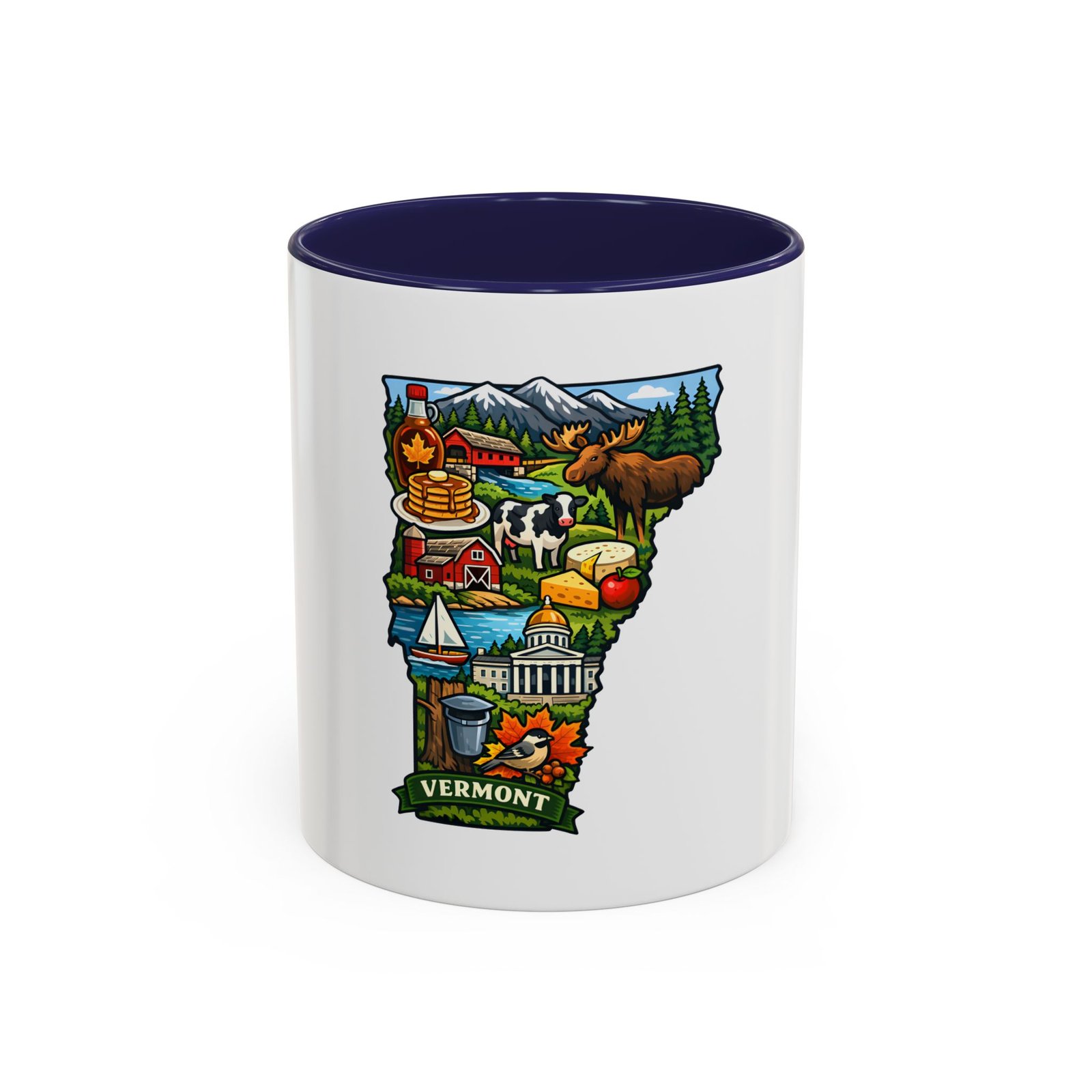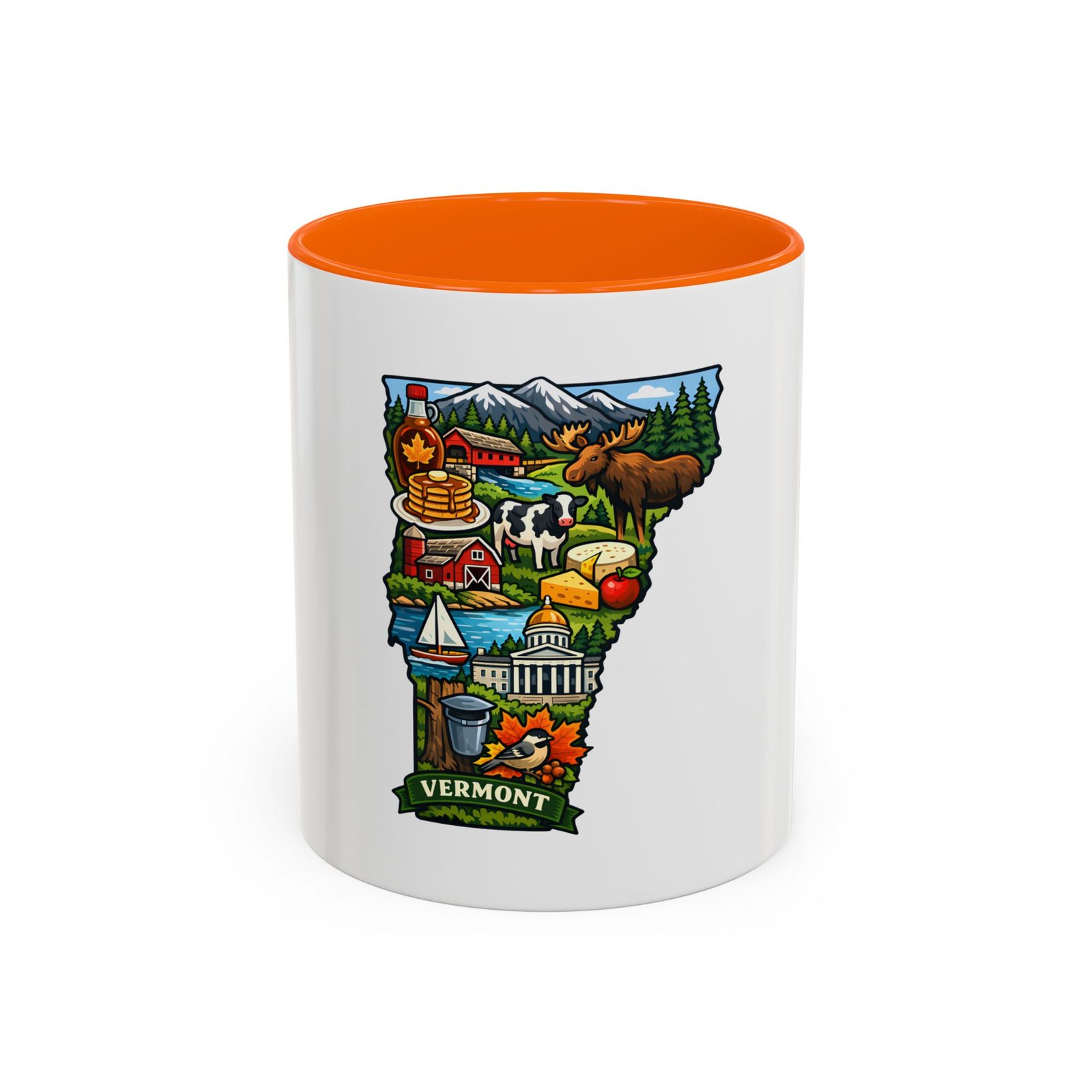 Wake up to Vermont. This ceramic mug carries a bright, illustrated map of the Green Mountain State—pancakes and maple syrup, cows in green pastures, the state capitol dome, sailboats and fall leaves—framed by a contrasting colored interior and handle. It sits warm in your hands with a glossy finish and C-shaped grip, turning an ordinary coffee moment into a little piece of home or a reminder of mountain mornings and lake afternoons. Durable printing keeps the colors lively through daily use, and the microwave- and dishwasher-safe construction makes it an easy companion for busy mornings or relaxed weekend sips.