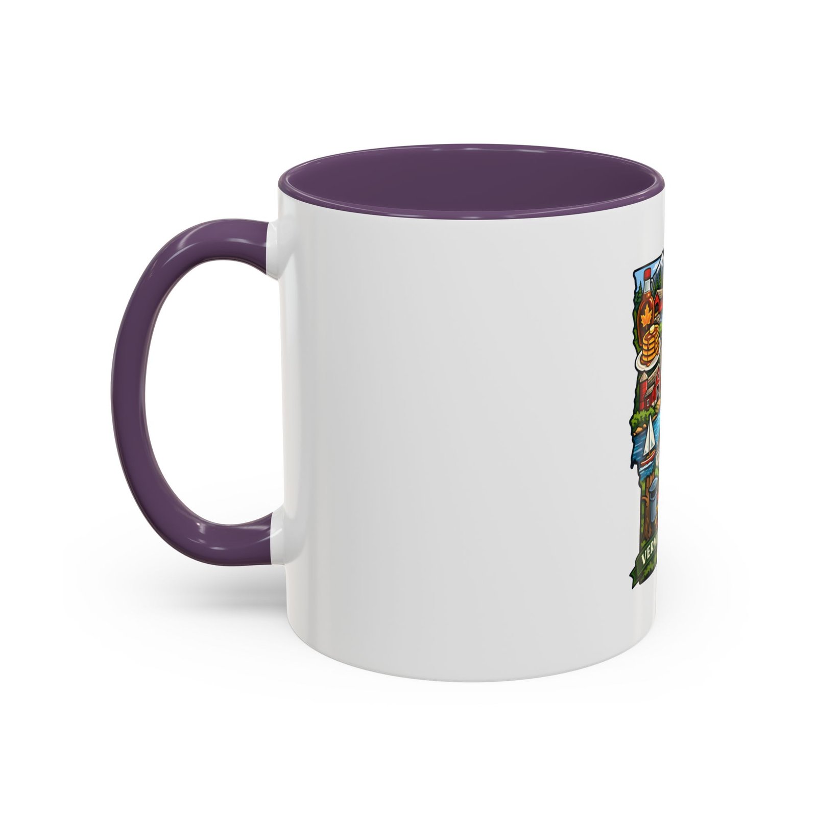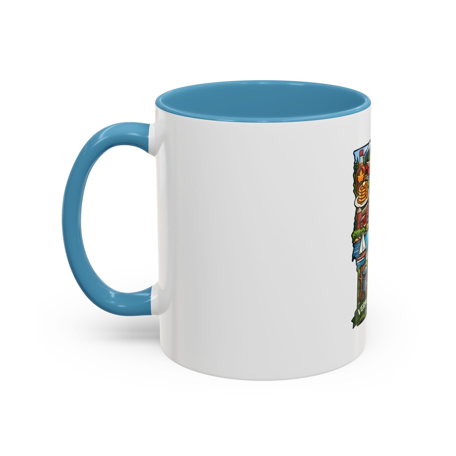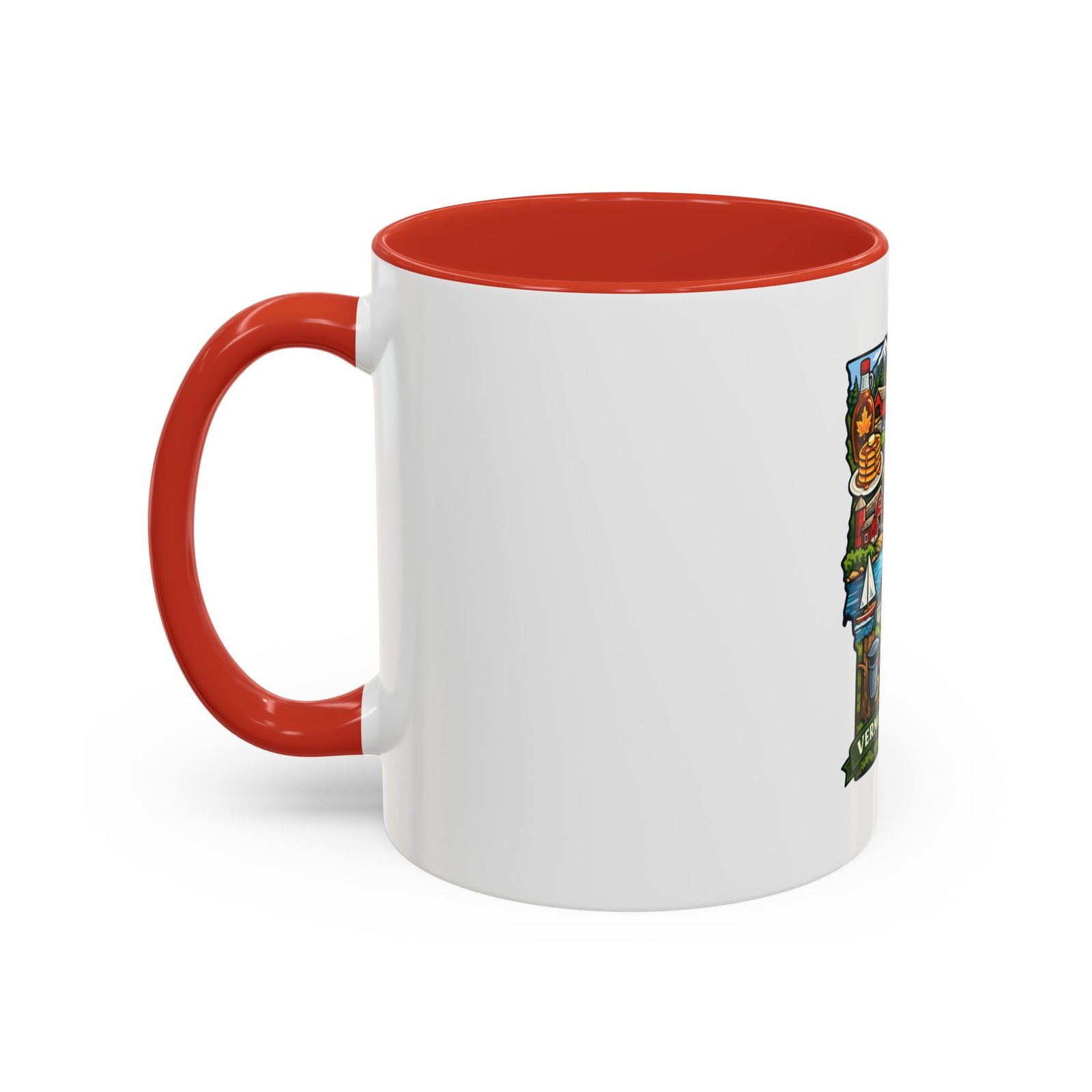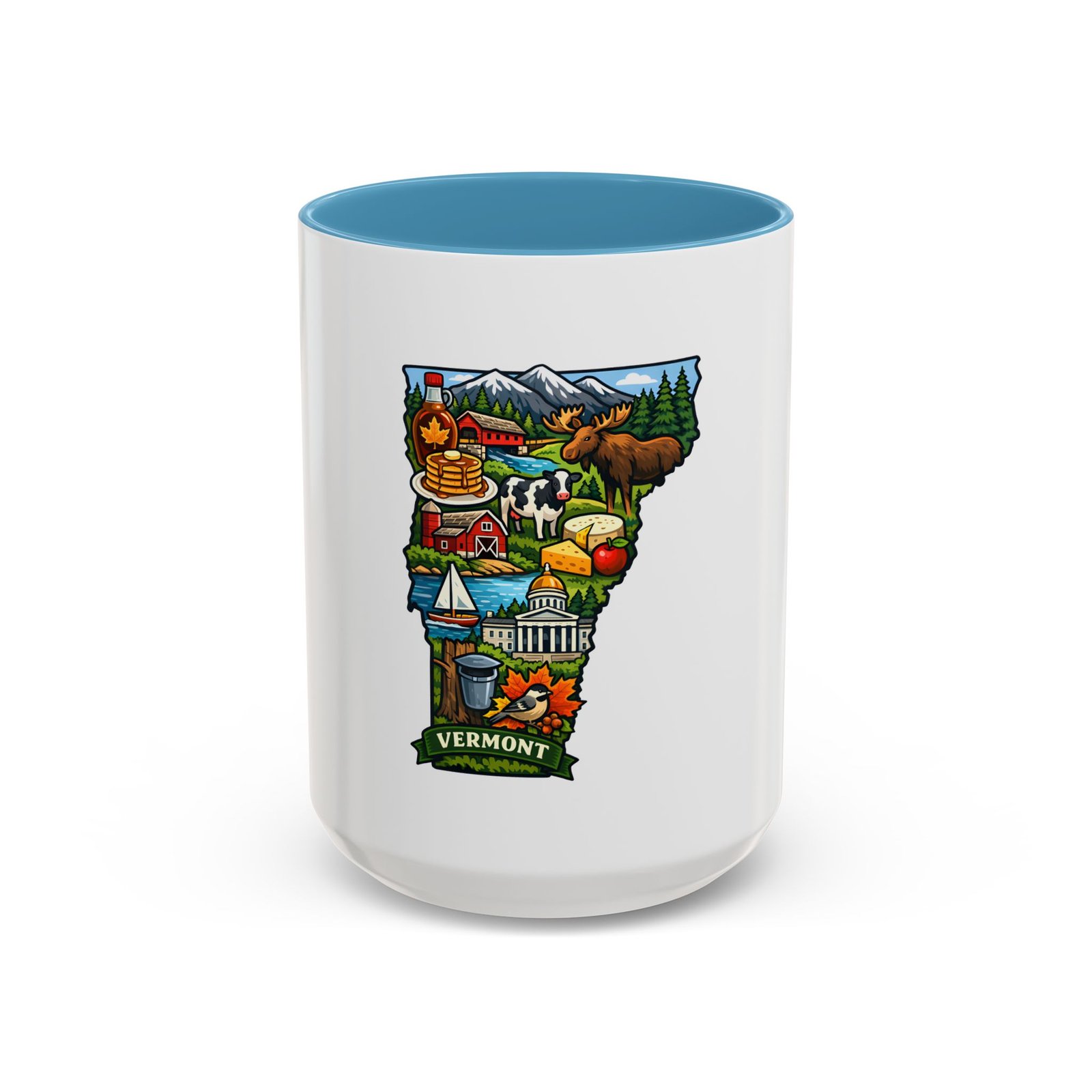 Wake up to Vermont. This ceramic mug carries a bright, illustrated map of the Green Mountain State—pancakes and maple syrup, cows in green pastures, the state capitol dome, sailboats and fall leaves—framed by a contrasting colored interior and handle. It sits warm in your hands with a glossy finish and C-shaped grip, turning an ordinary coffee moment into a little piece of home or a reminder of mountain mornings and lake afternoons. Durable printing keeps the colors lively through daily use, and the microwave- and dishwasher-safe construction makes it an easy companion for busy mornings or relaxed weekend sips.