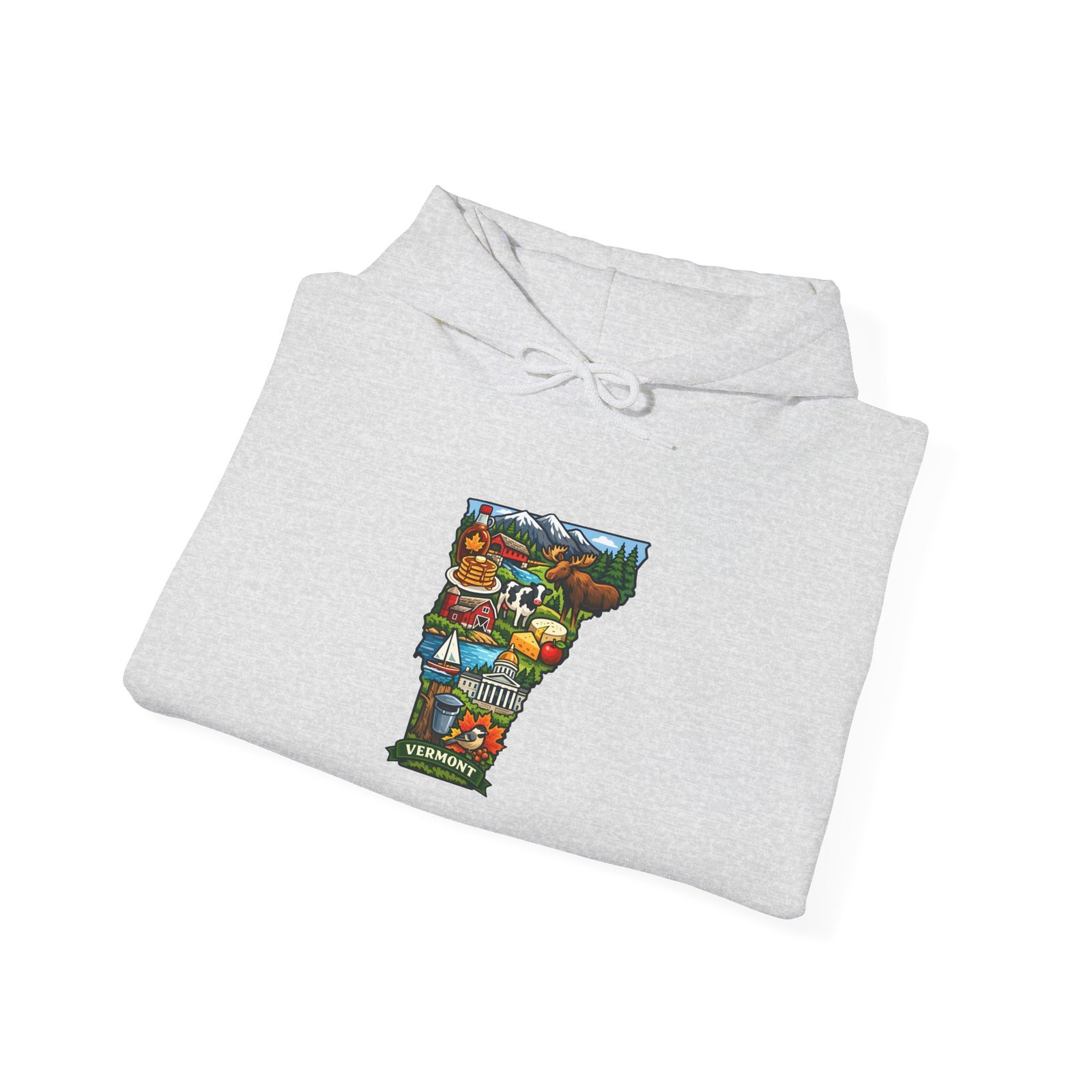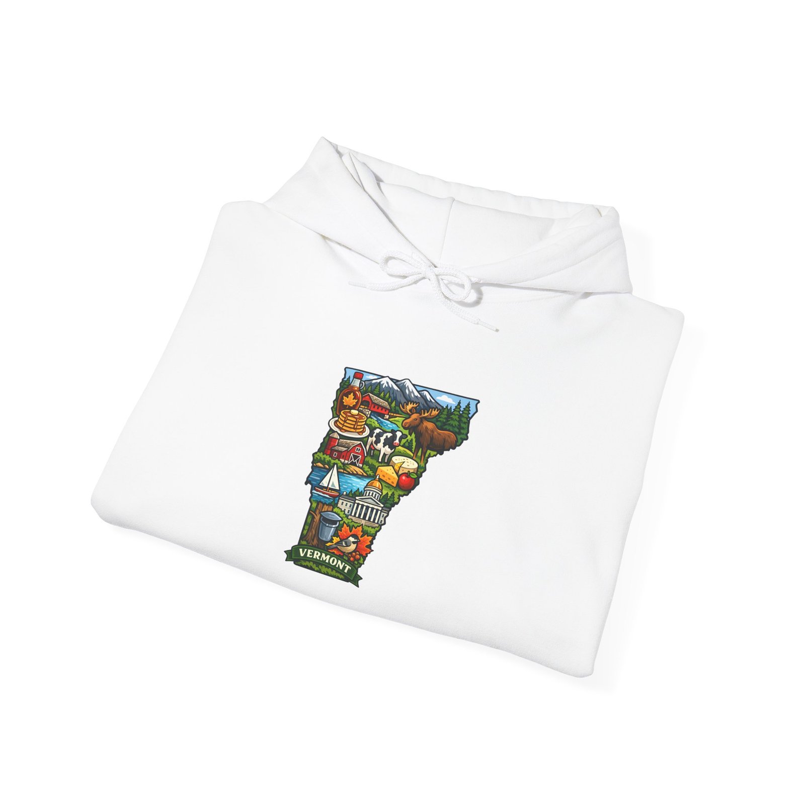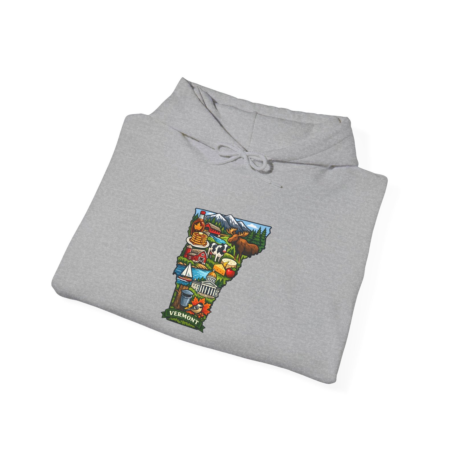 This cozy hooded sweatshirt carries a small, colorful Vermont-themed illustration at the chest — a quiet nod to mountain farms, maple sugaring, and winding country roads. The medium-heavy 50/50 cotton-poly blend gives it a soft, warm hand and enough structure to hold the print’s vivid detail. The double-lined hood and color-matched drawcord add everyday durability, while the roomy kangaroo pocket keeps hands warm and secures small essentials. It’s built to be lived in: layered over tees for chilly morning hikes, worn after a day at the local market, or pulled on for evening bonfires by the lake. The design feels like a brief, familiar story stitched into your wardrobe — subtle, regionally rooted, and steady through seasons.