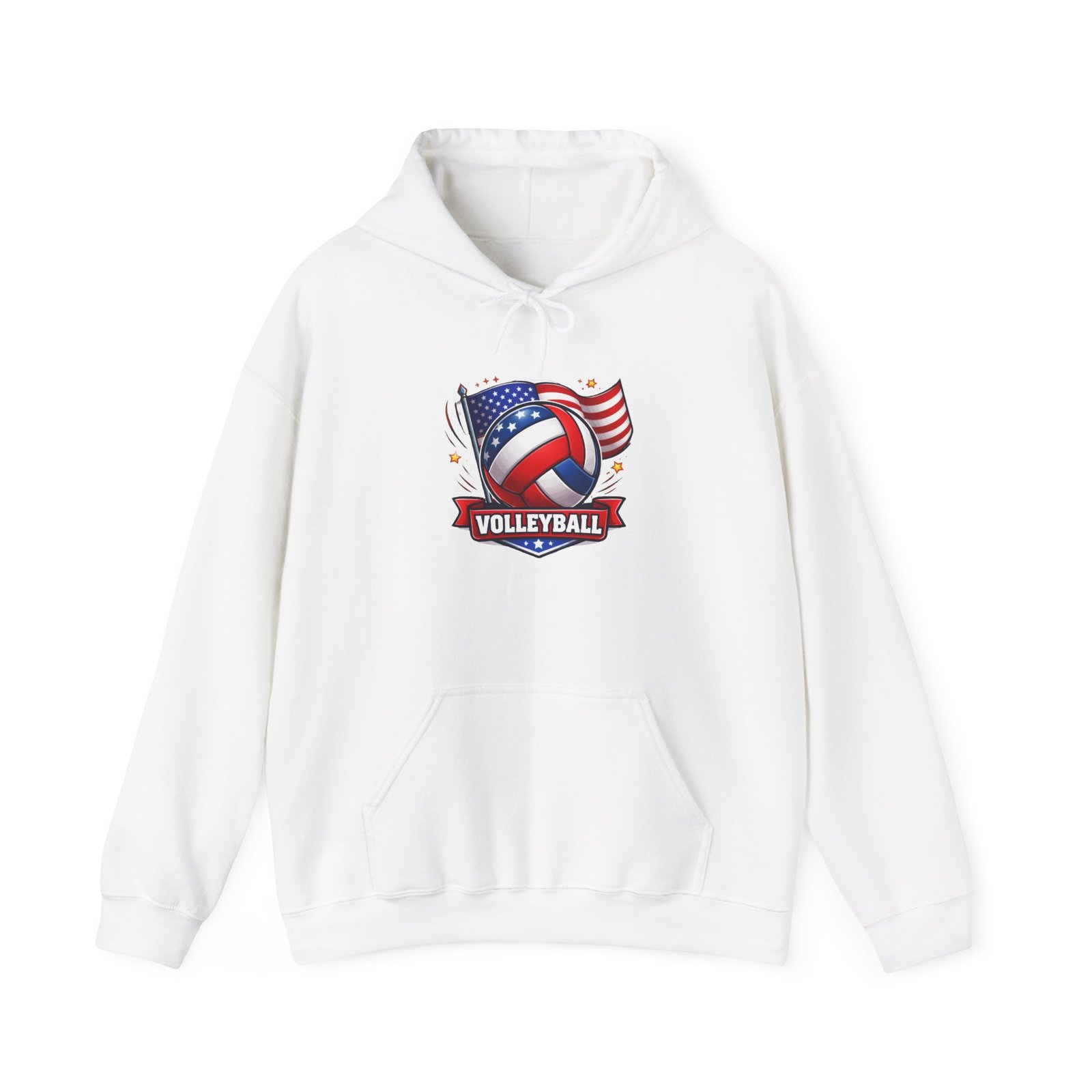 Wear your team spirit on cool evenings with this cozy volleyball hoodie. The soft, medium-heavy cotton-poly blend wraps you in warmth while a bold, patriotic volleyball graphic sits front and center — a quiet declaration of practice nights, weekend matches, and late-night team hangs. The roomy kangaroo pocket and color-matched double-lined hood feel familiar and lived-in the moment you pull it on. It’s durable enough for travel, gentle enough for post-game comfort, and designed with details like tear-away labels and resilient prints that stand up to washes and seasons. Slide into it after a sweaty set, cheer from the sidelines, or toss it over your gear bag — it fits naturally into the rhythm of a volleyball life.
