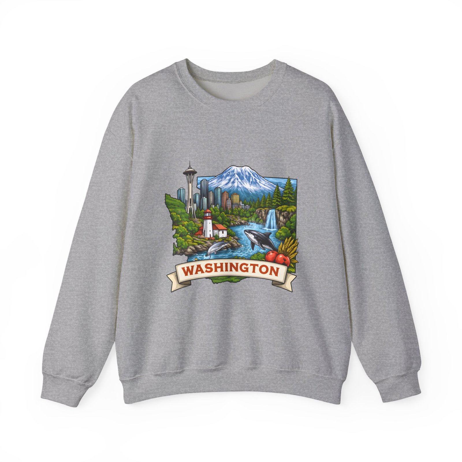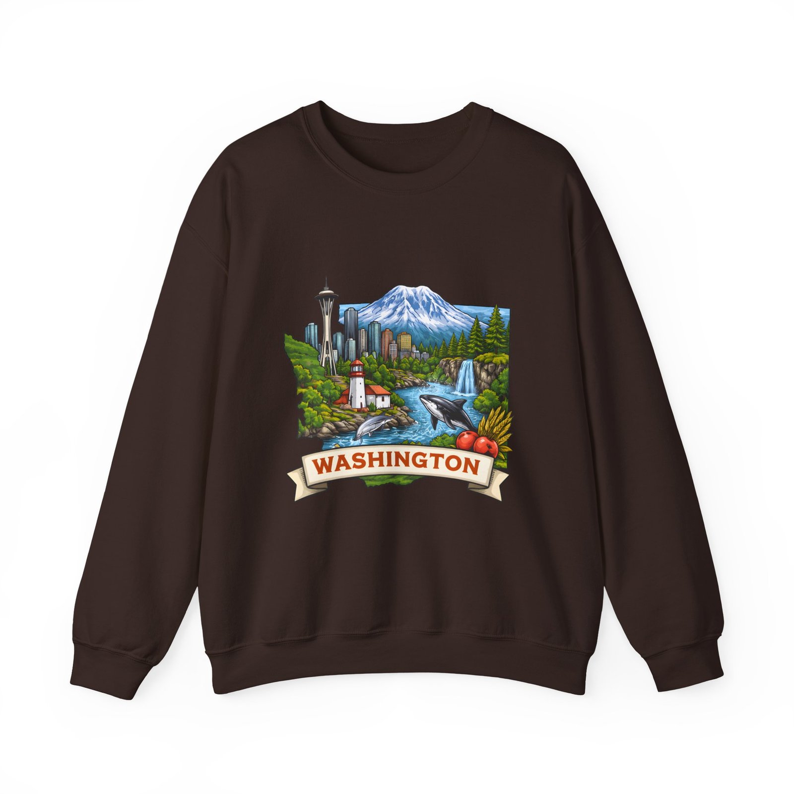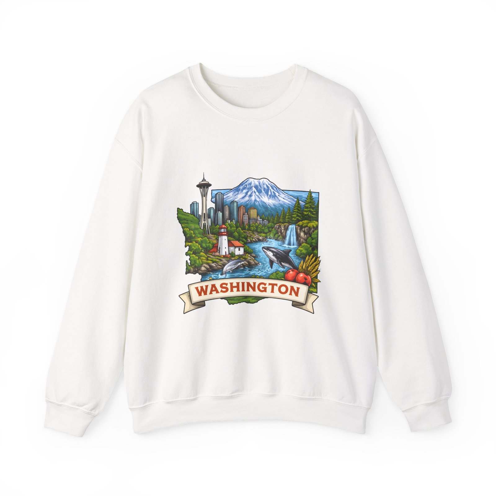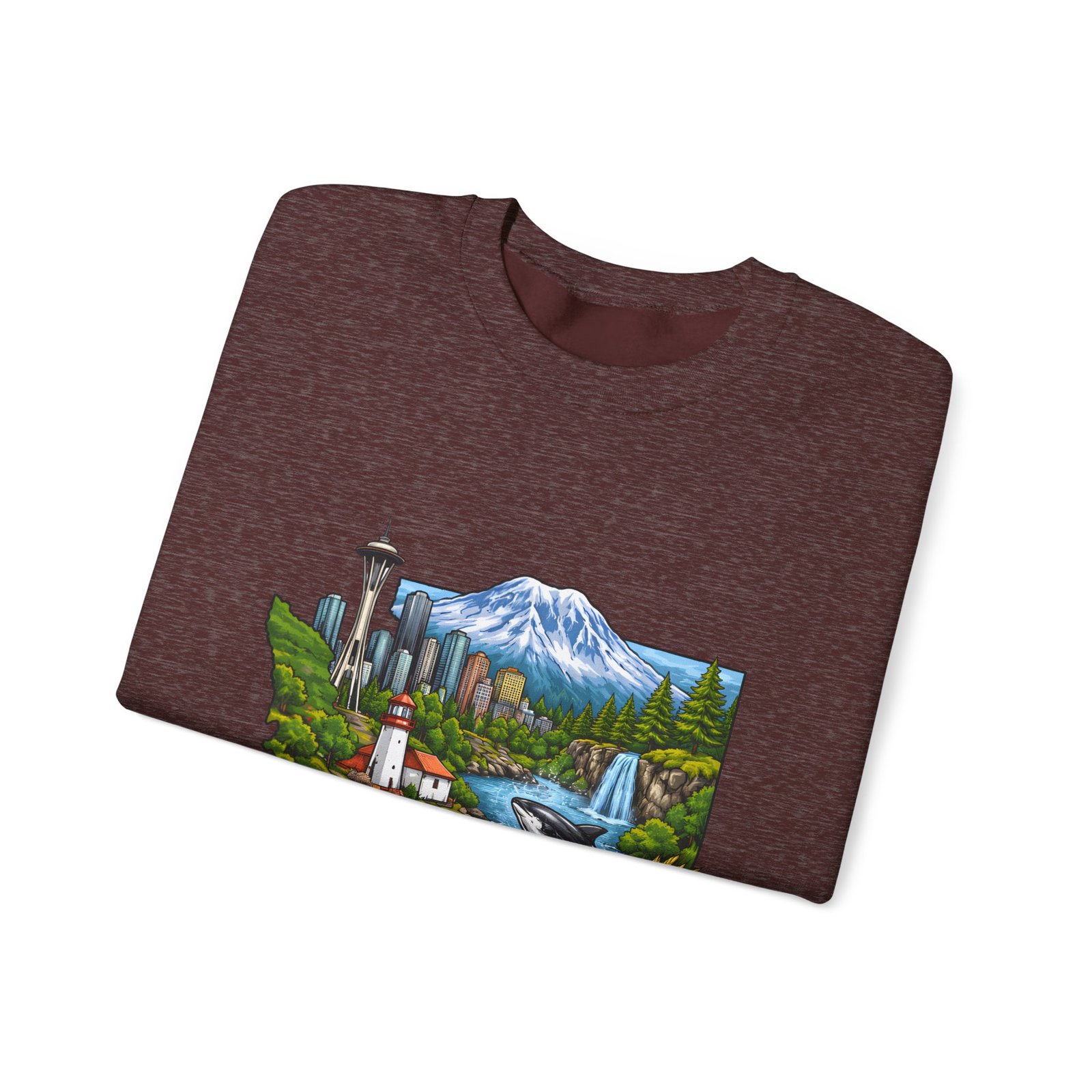 Washington State Crewneck Sweatshirt — Scenic Mount Rainier & Seattle Skyline Graphic