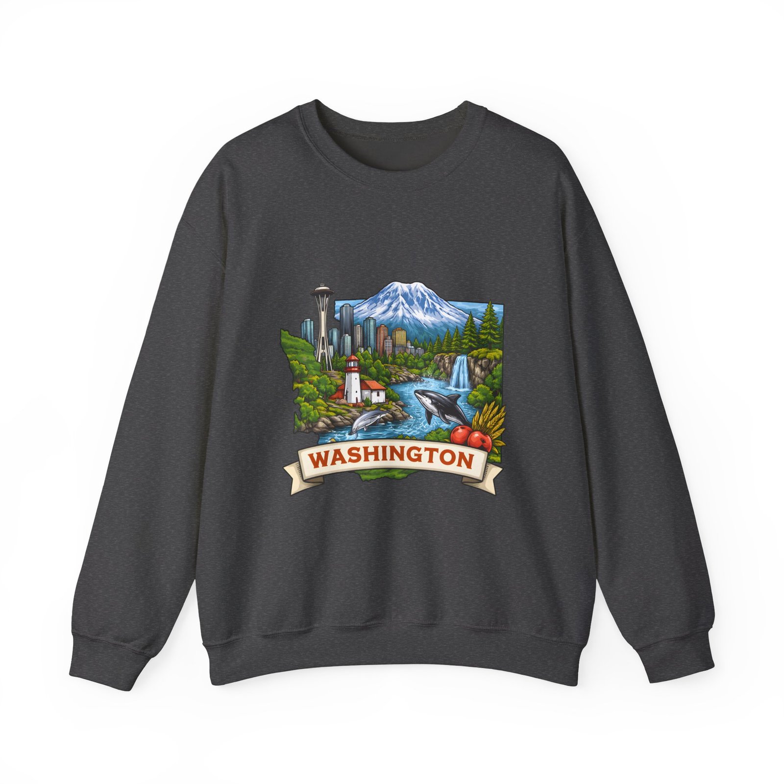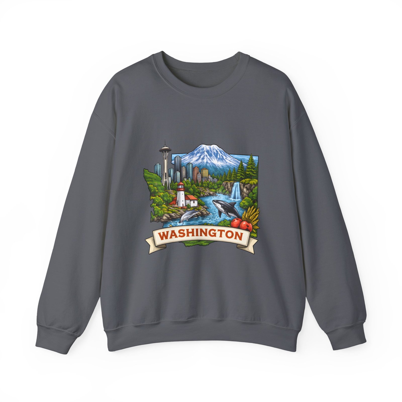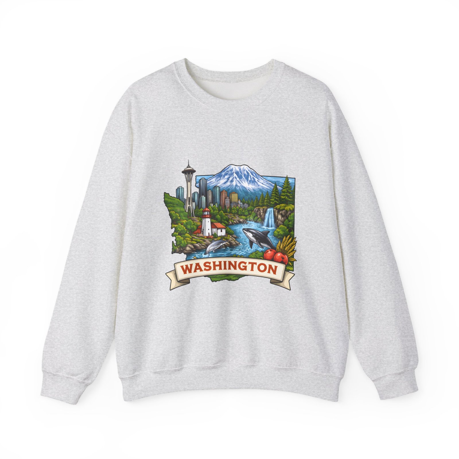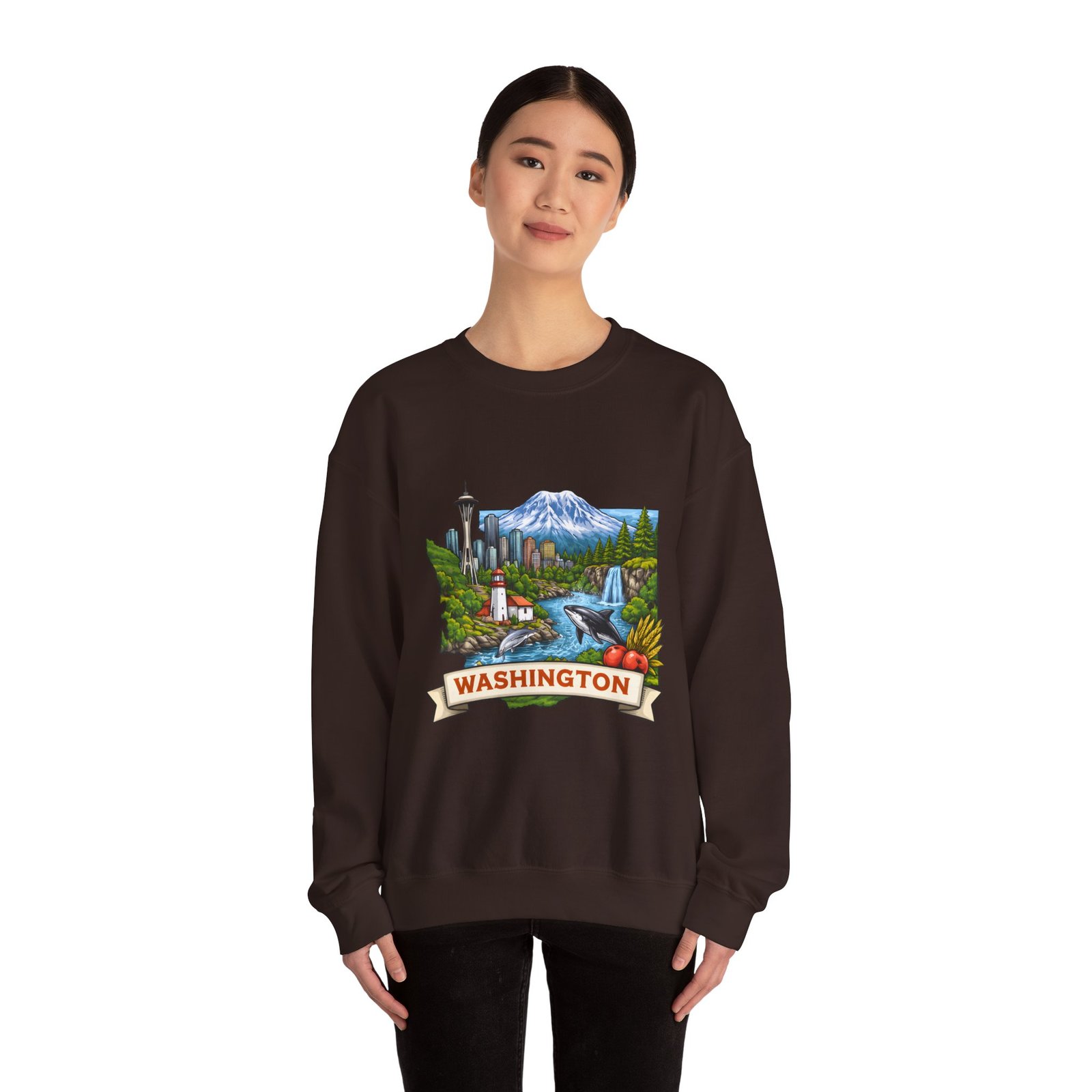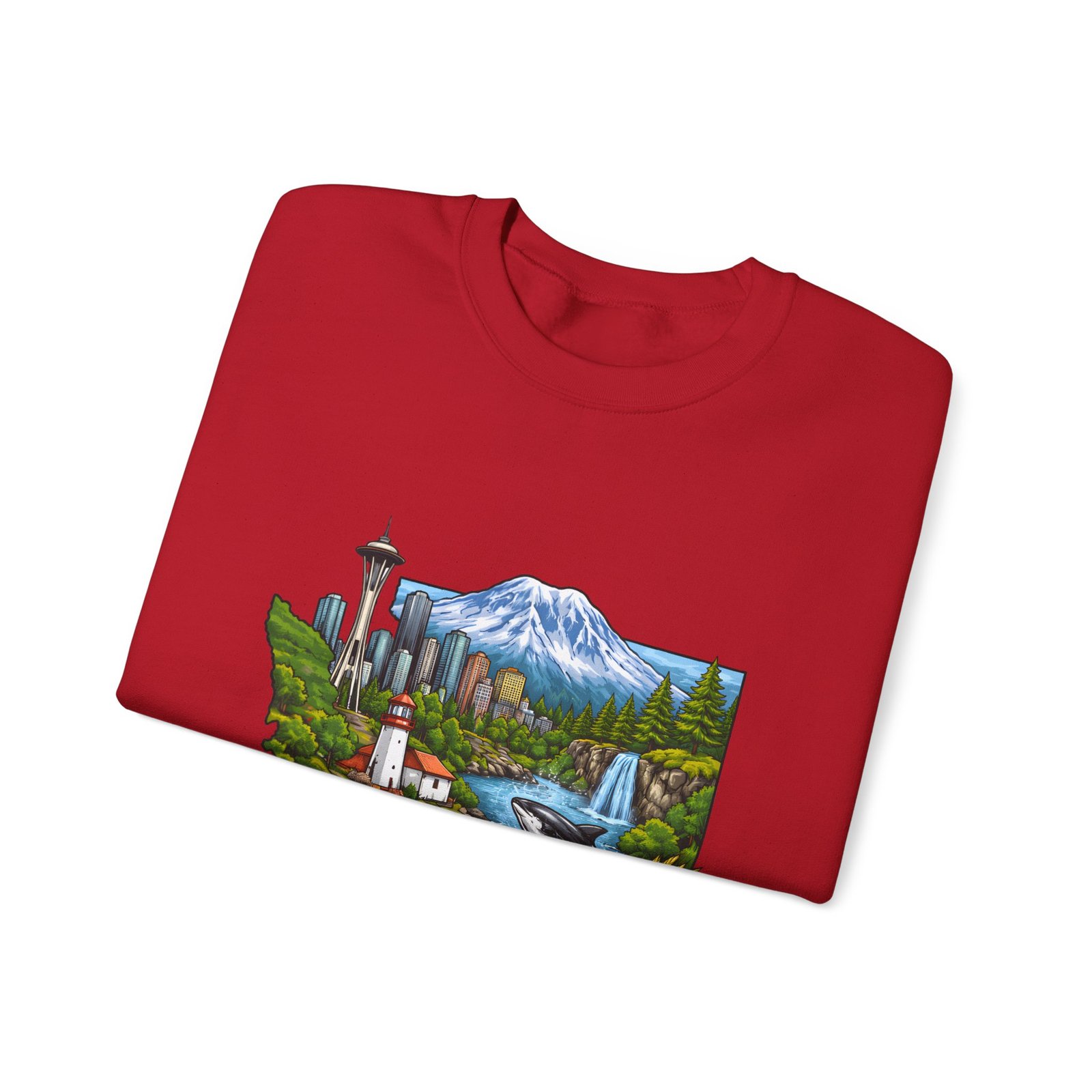 Washington State Crewneck Sweatshirt — Scenic Mount Rainier & Seattle Skyline Graphic