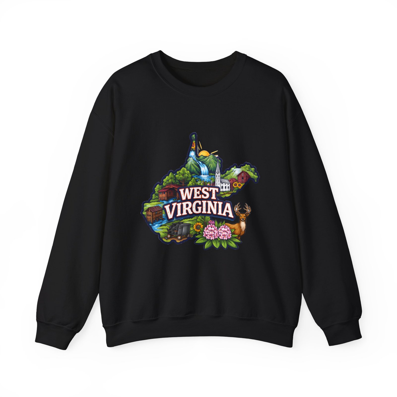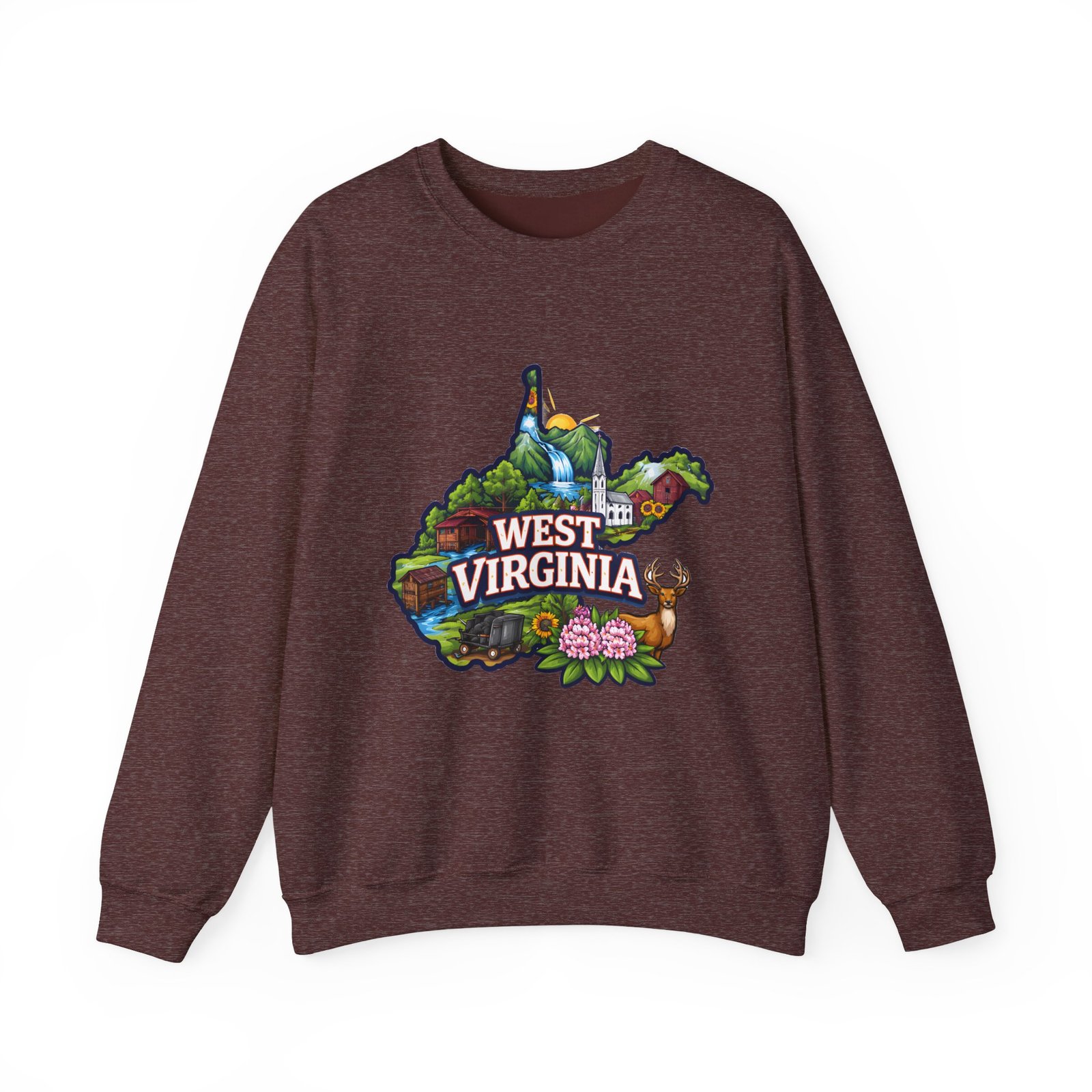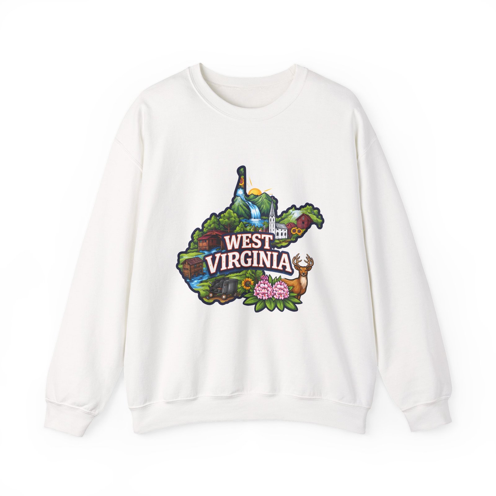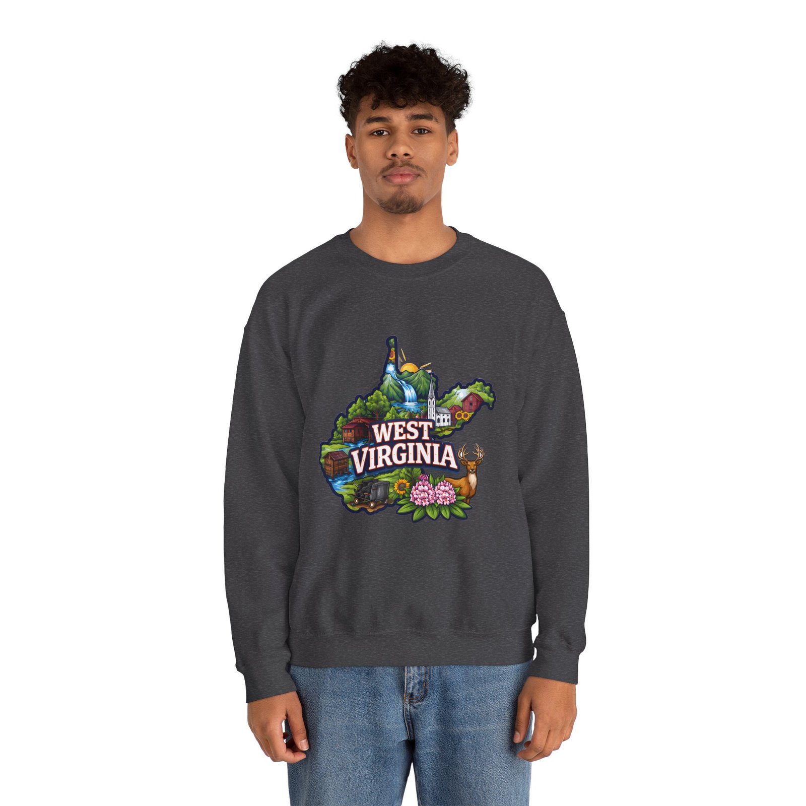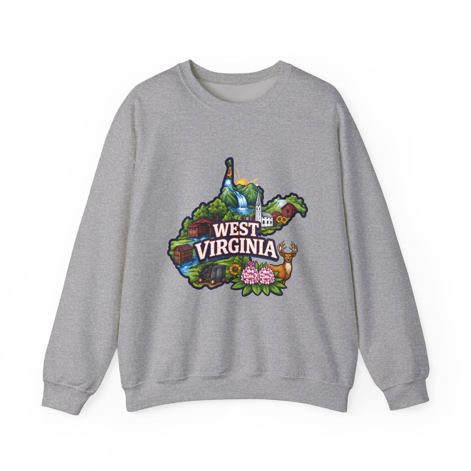 Soft, warm, and quietly familiar — this crewneck carries a map-shaped illustration of West Virginia, layered with waterfalls, rolling hills, wildflowers, and a friendly deer. It feels like a slow morning on a backroad: the woolly comfort of a lived-in sweatshirt, the steady weight that keeps you cozy through cool hikes, porch coffee sessions, and long drives home. The artwork sits centered on the chest, bright but not shouty, celebrating place and memory rather than trend. Built to wear and last, the sweatshirt’s knit construction and reinforced seams give a lived-in comfort that only gets better with time.