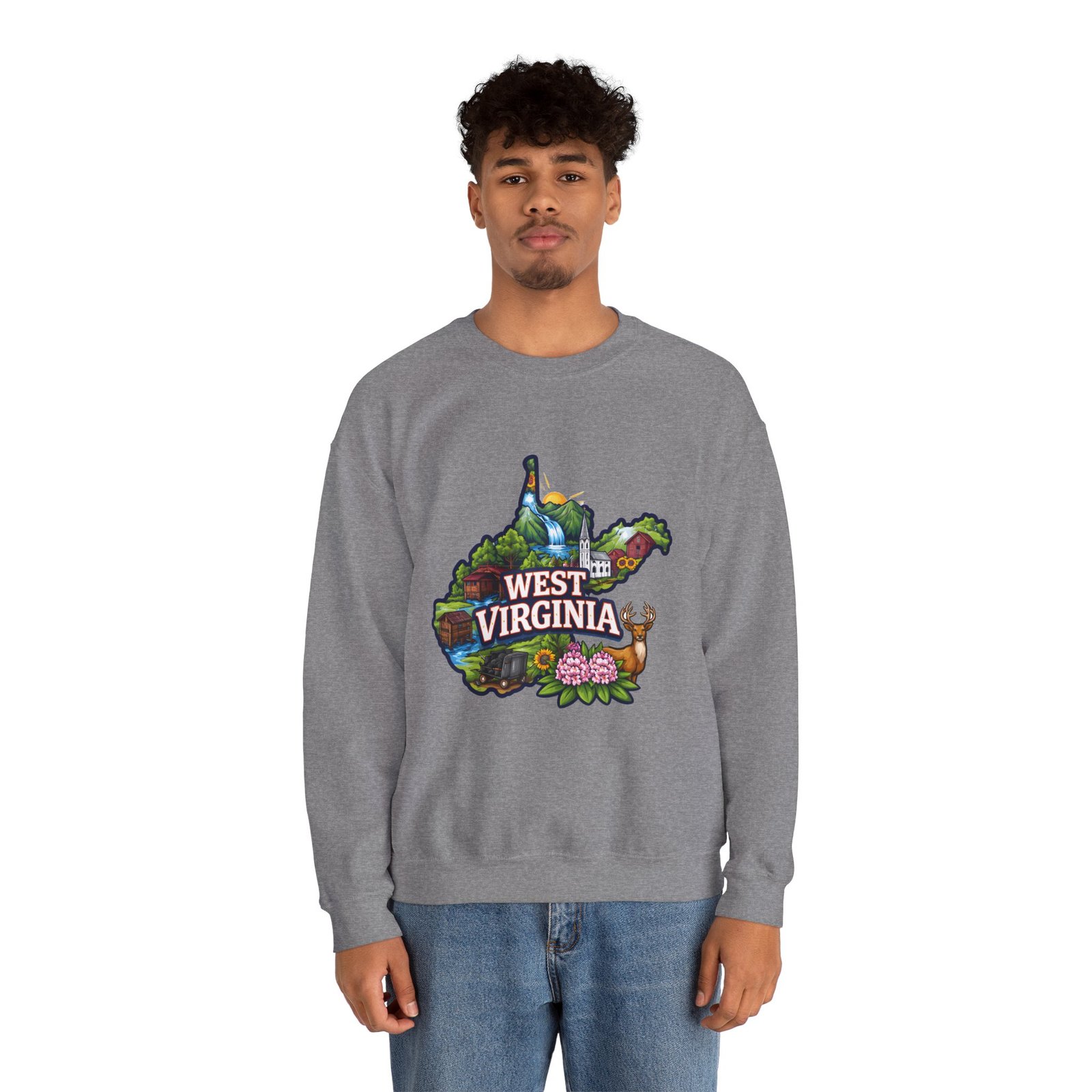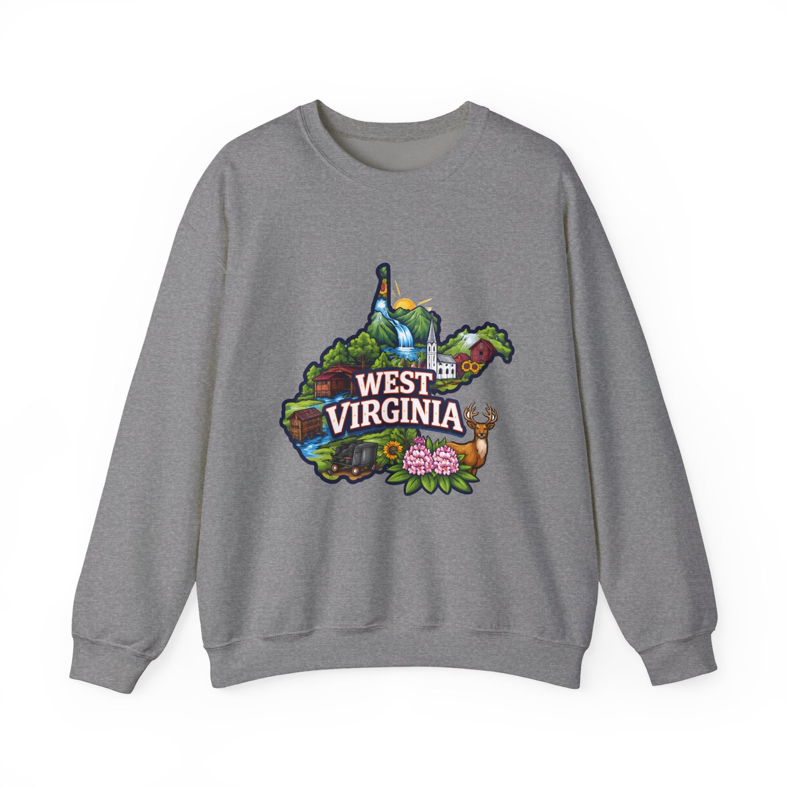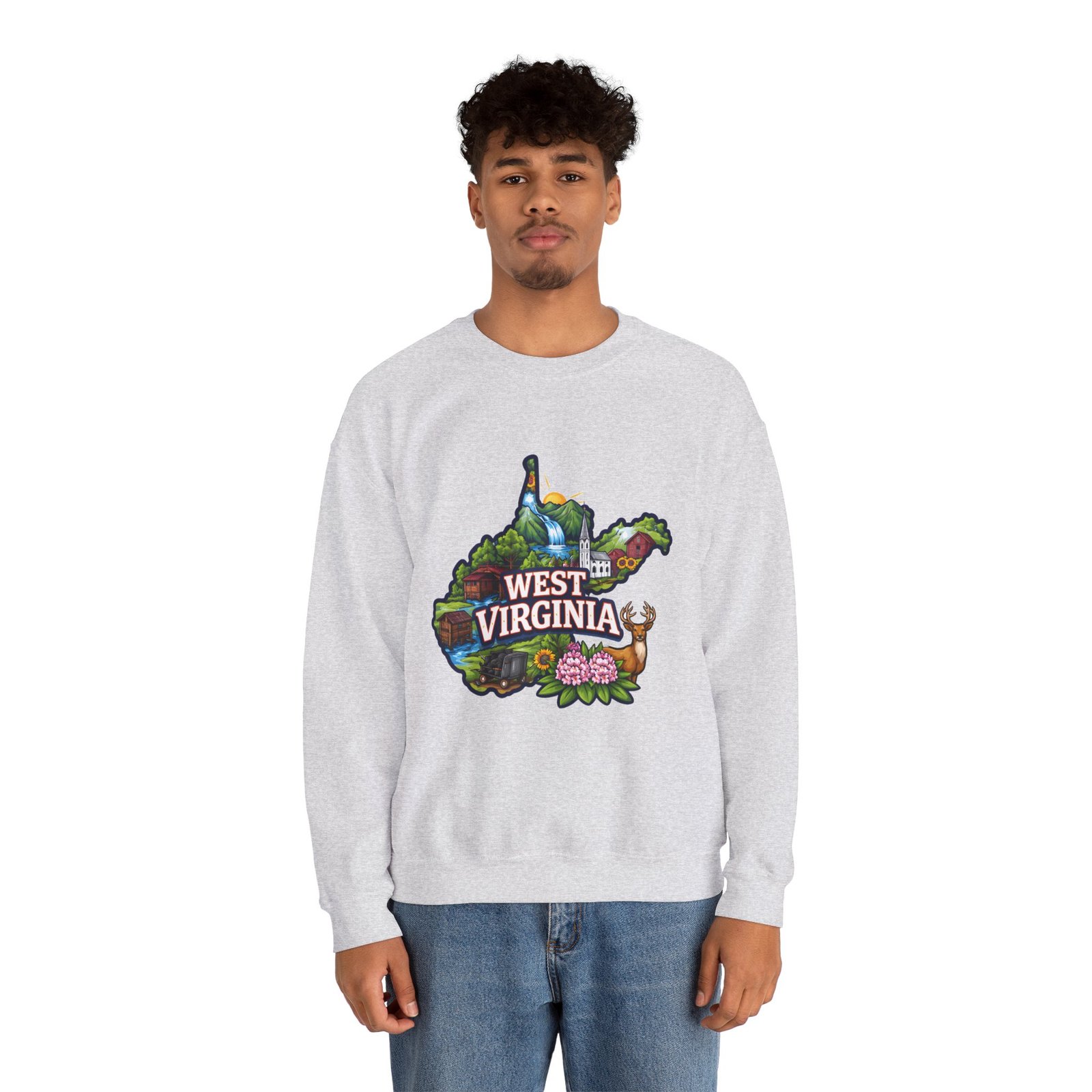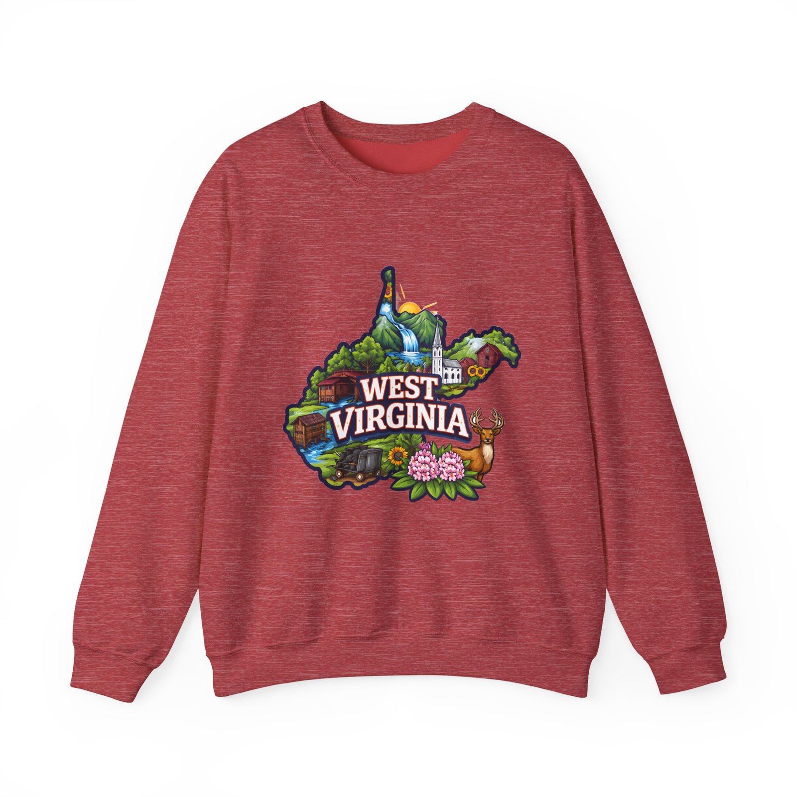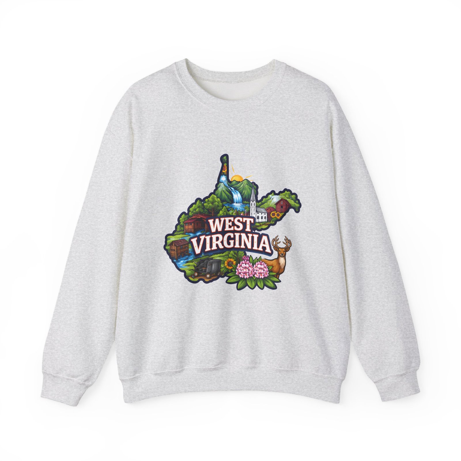Soft, warm, and quietly familiar — this crewneck carries a map-shaped illustration of West Virginia, layered with waterfalls, rolling hills, wildflowers, and a friendly deer. It feels like a slow morning on a backroad: the woolly comfort of a lived-in sweatshirt, the steady weight that keeps you cozy through cool hikes, porch coffee sessions, and long drives home. The artwork sits centered on the chest, bright but not shouty, celebrating place and memory rather than trend. Built to wear and last, the sweatshirt’s knit construction and reinforced seams give a lived-in comfort that only gets better with time.