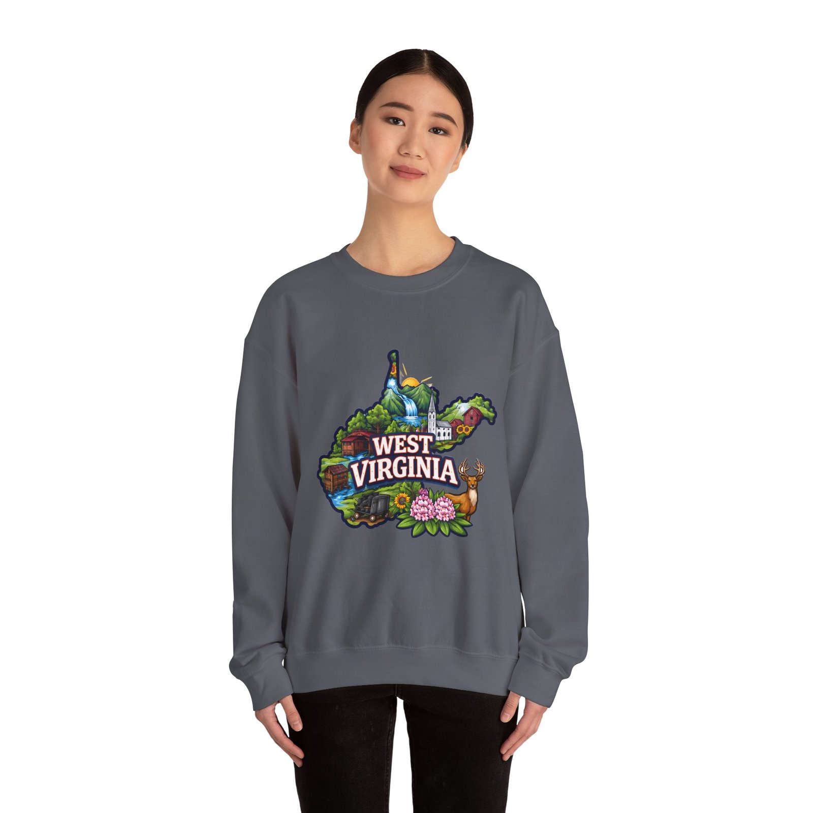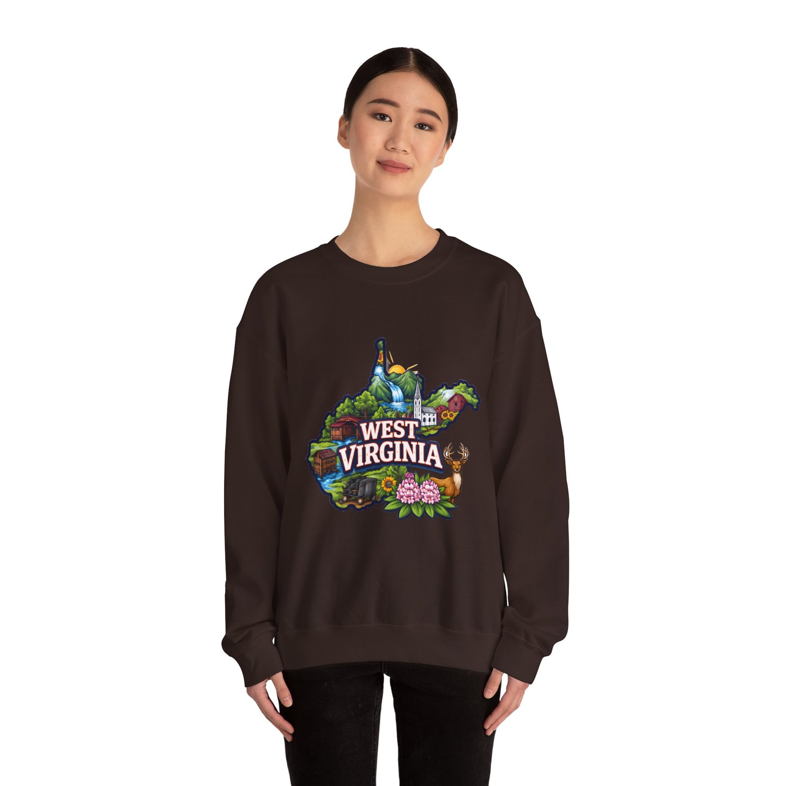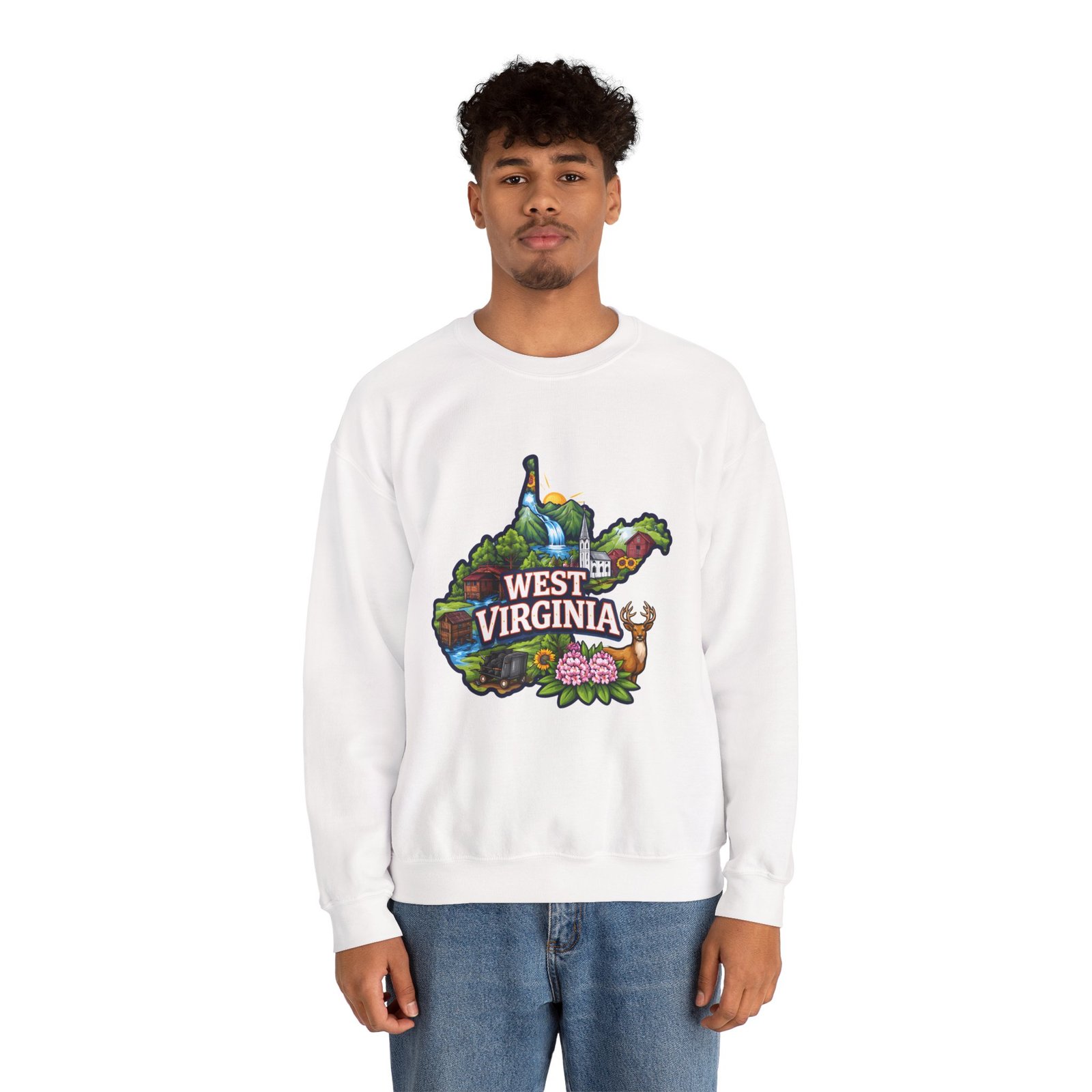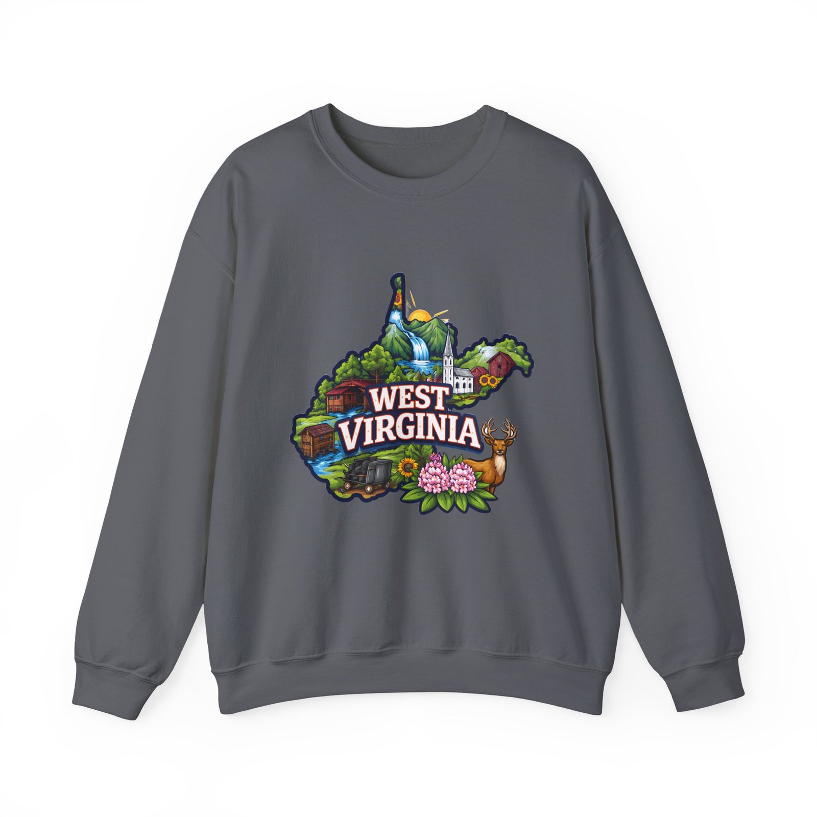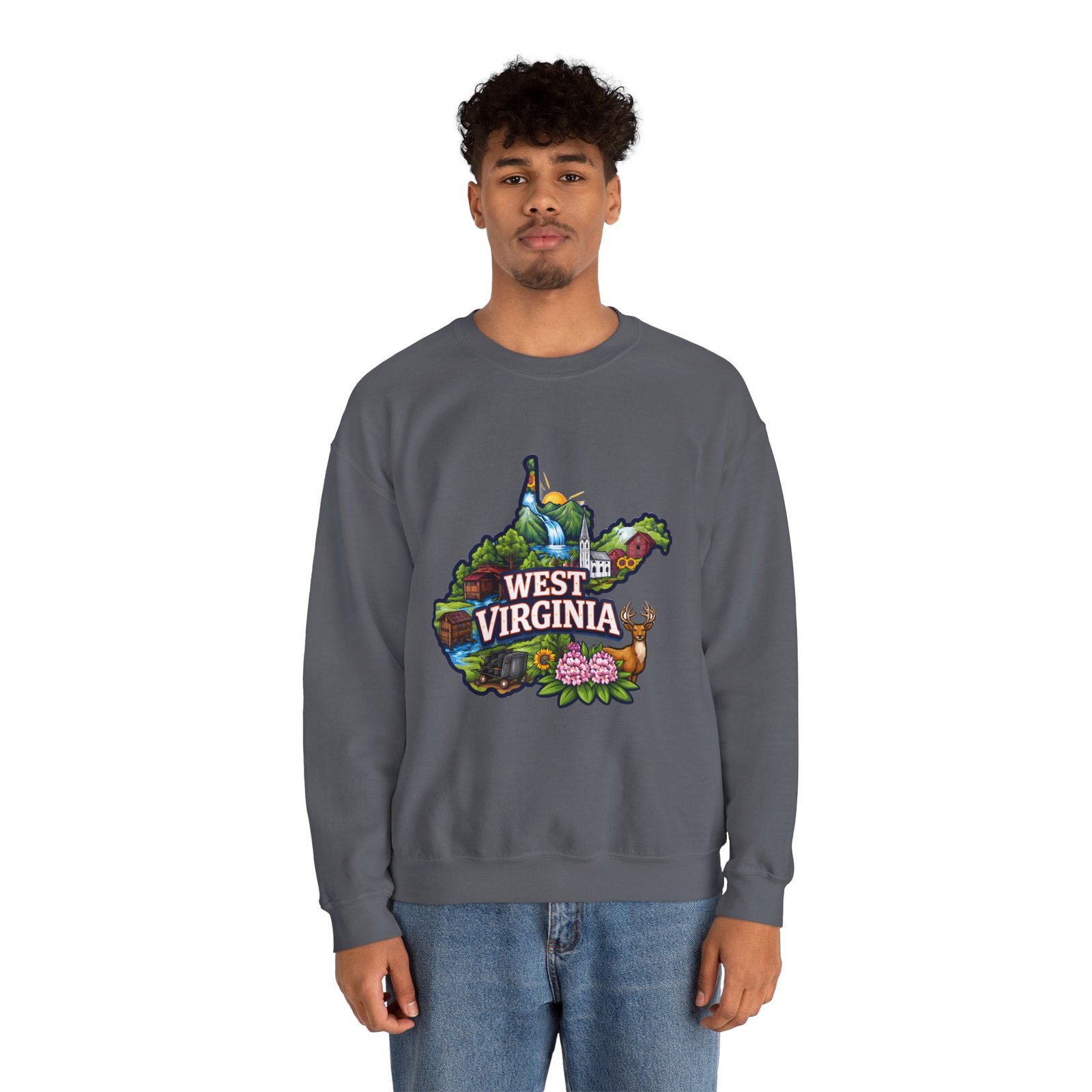 Soft, warm, and quietly familiar — this crewneck carries a map-shaped illustration of West Virginia, layered with waterfalls, rolling hills, wildflowers, and a friendly deer. It feels like a slow morning on a backroad: the woolly comfort of a lived-in sweatshirt, the steady weight that keeps you cozy through cool hikes, porch coffee sessions, and long drives home. The artwork sits centered on the chest, bright but not shouty, celebrating place and memory rather than trend. Built to wear and last, the sweatshirt’s knit construction and reinforced seams give a lived-in comfort that only gets better with time.