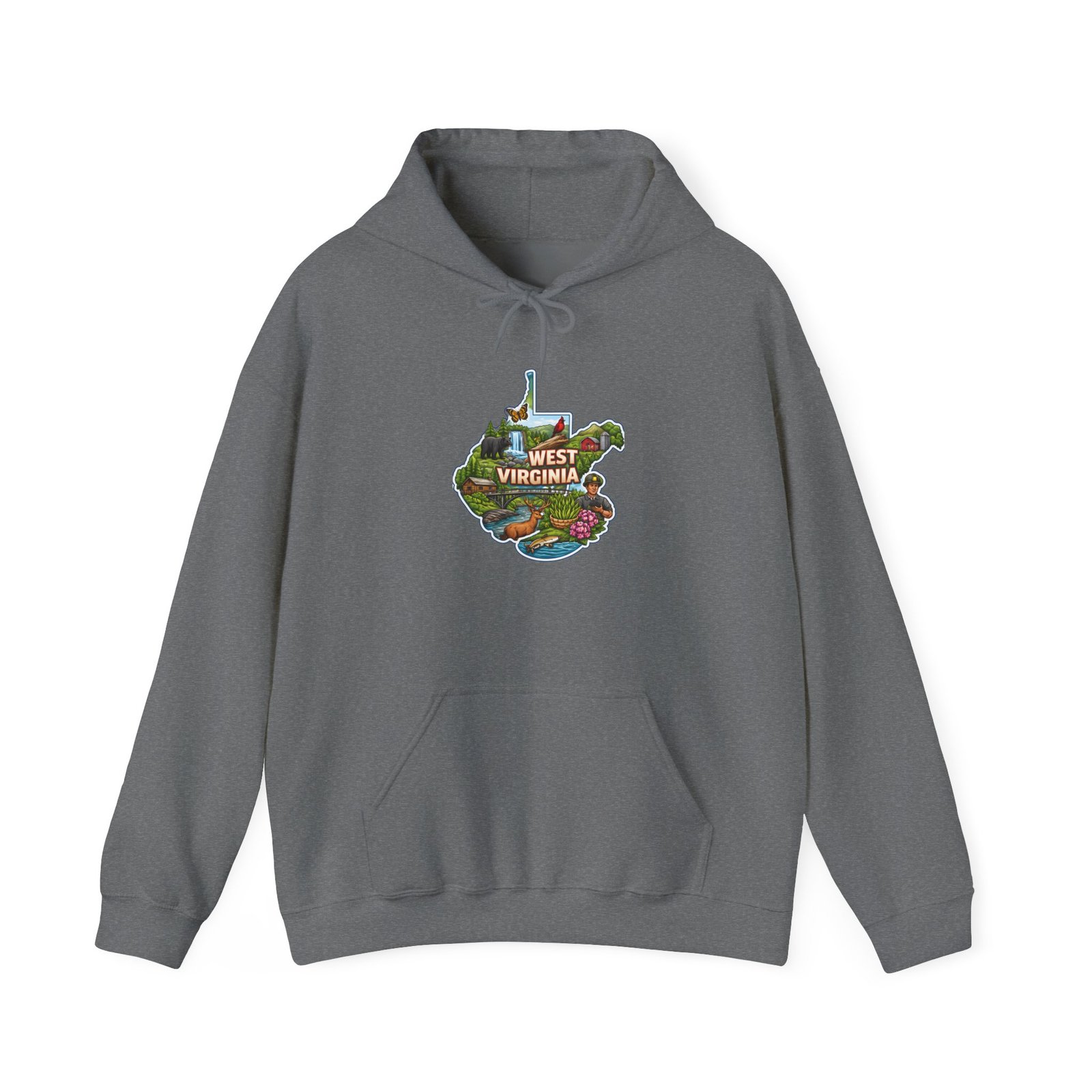 This cozy hoodie carries a tiny, vibrant map of West Virginia right over the heart — rolling green hills, winding rivers, and a scatter of local landmarks captured in a warm, illustrated patch. It feels like slipping into an evening on the porch after a day of hiking: soft against your skin, comfortably heavy, and quietly proud. Wear it on cool mornings driving back from the trailhead, at low-key local festivals, or when you want to carry a piece of home with you. The roomy kangaroo pocket and double-lined hood keep you sheltered from wind and drizzle, while the subtle map print starts conversations without shouting. For folks who love the state’s landscapes and small-town rhythm, this hoodie fits straight into everyday life — layered over tees, paired with boots, or lounged-in at home.