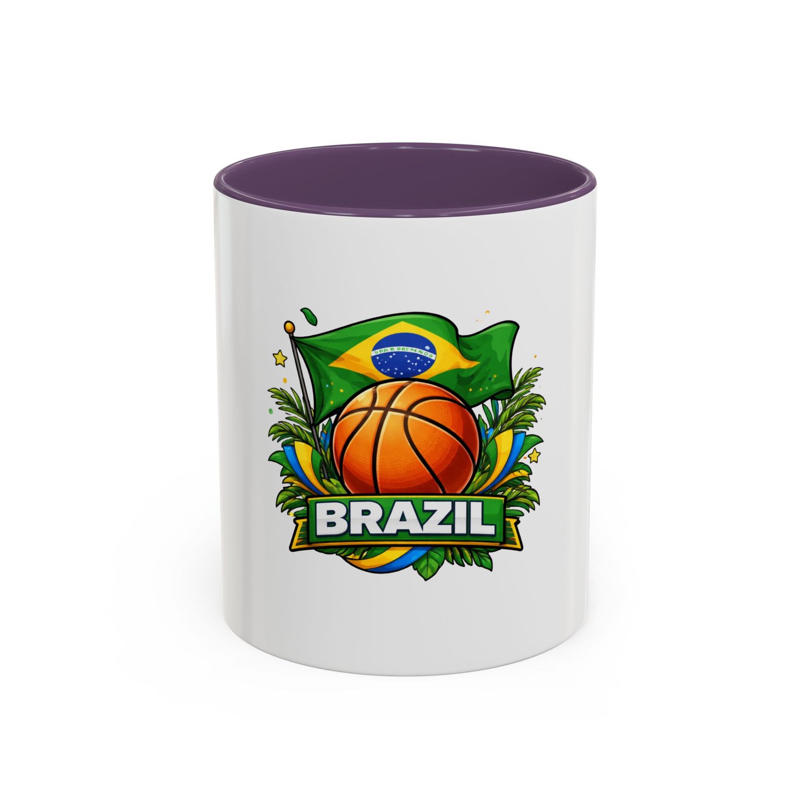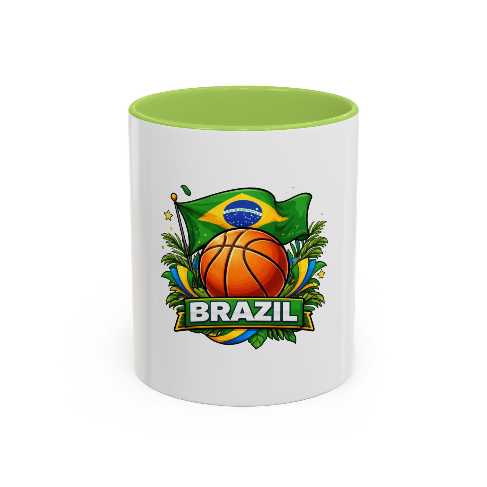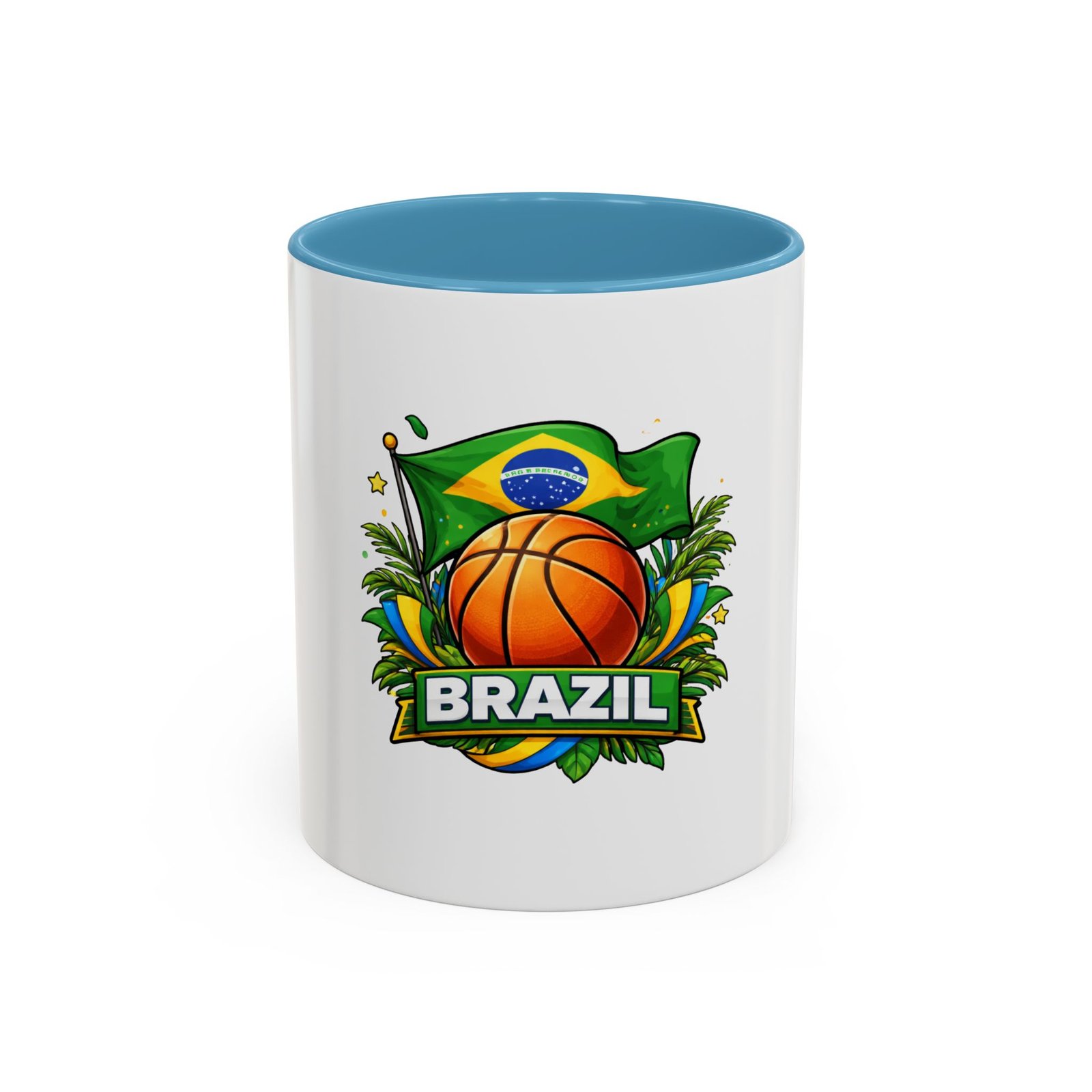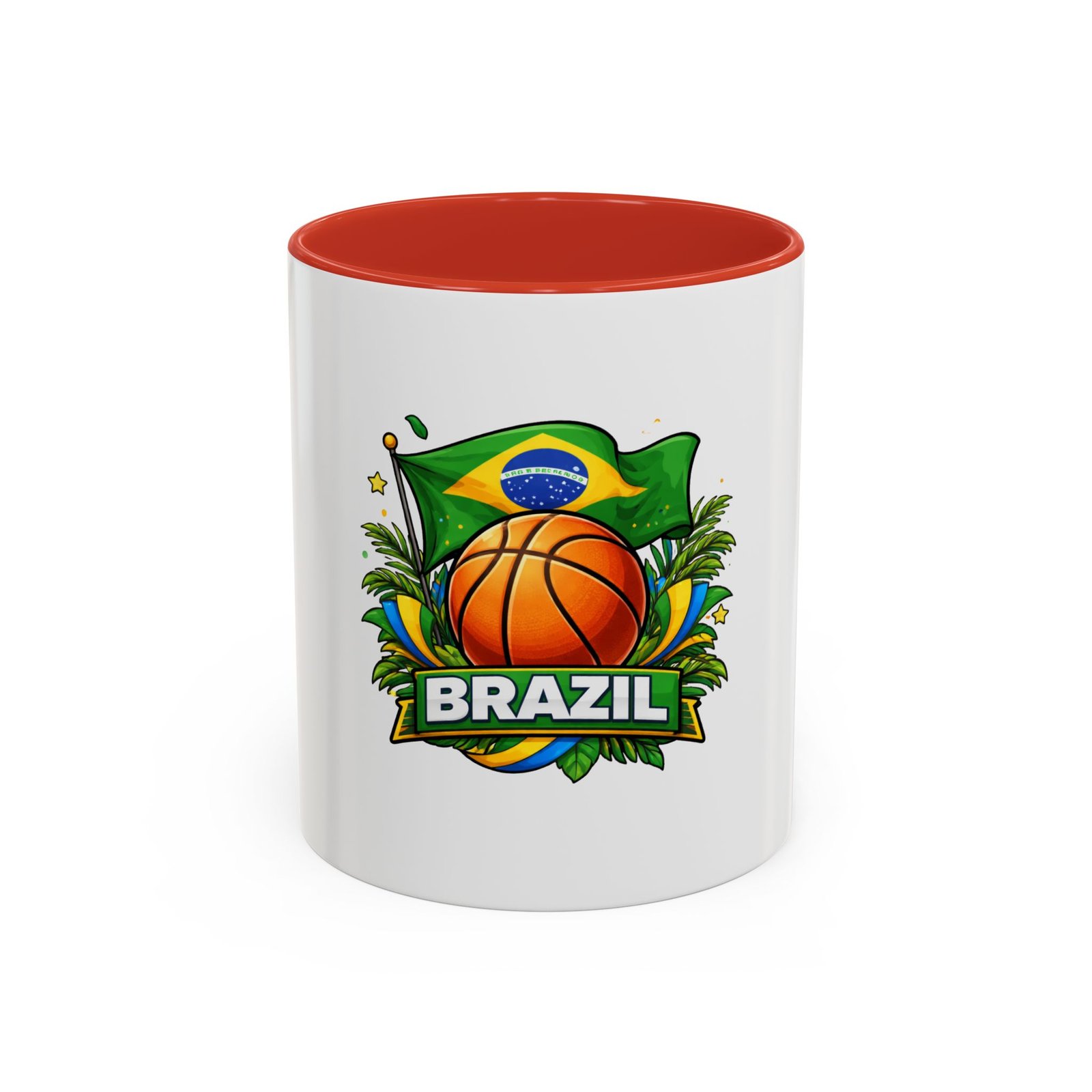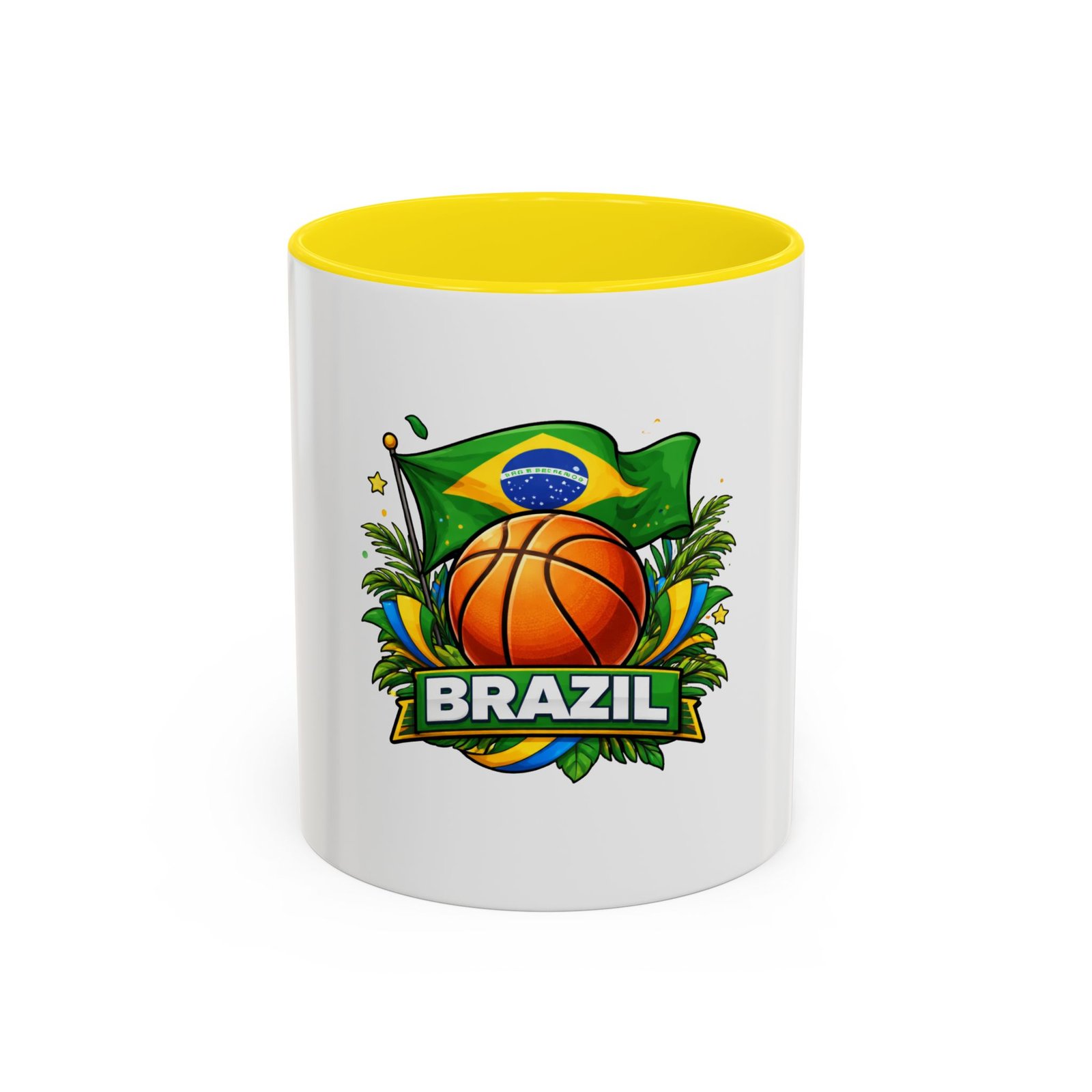 This ceramic accent mug brings Brazil’s vibrant energy to every sip. A bold basketball graphic sits beneath the waving Brazilian flag, framed by tropical leaves and sunlit accents — it feels like a quick trip courtside under warm skies. The colored interior and handle add a playful contrast to the glossy white body, making each morning coffee or late-night cocoa feel celebratory. Durable and bright, it settles easily into the routine of fans who love sport, travel, and lively design. Pack it for game-night gatherings or leave it on a desk where it can spark conversations and small moments of pride.