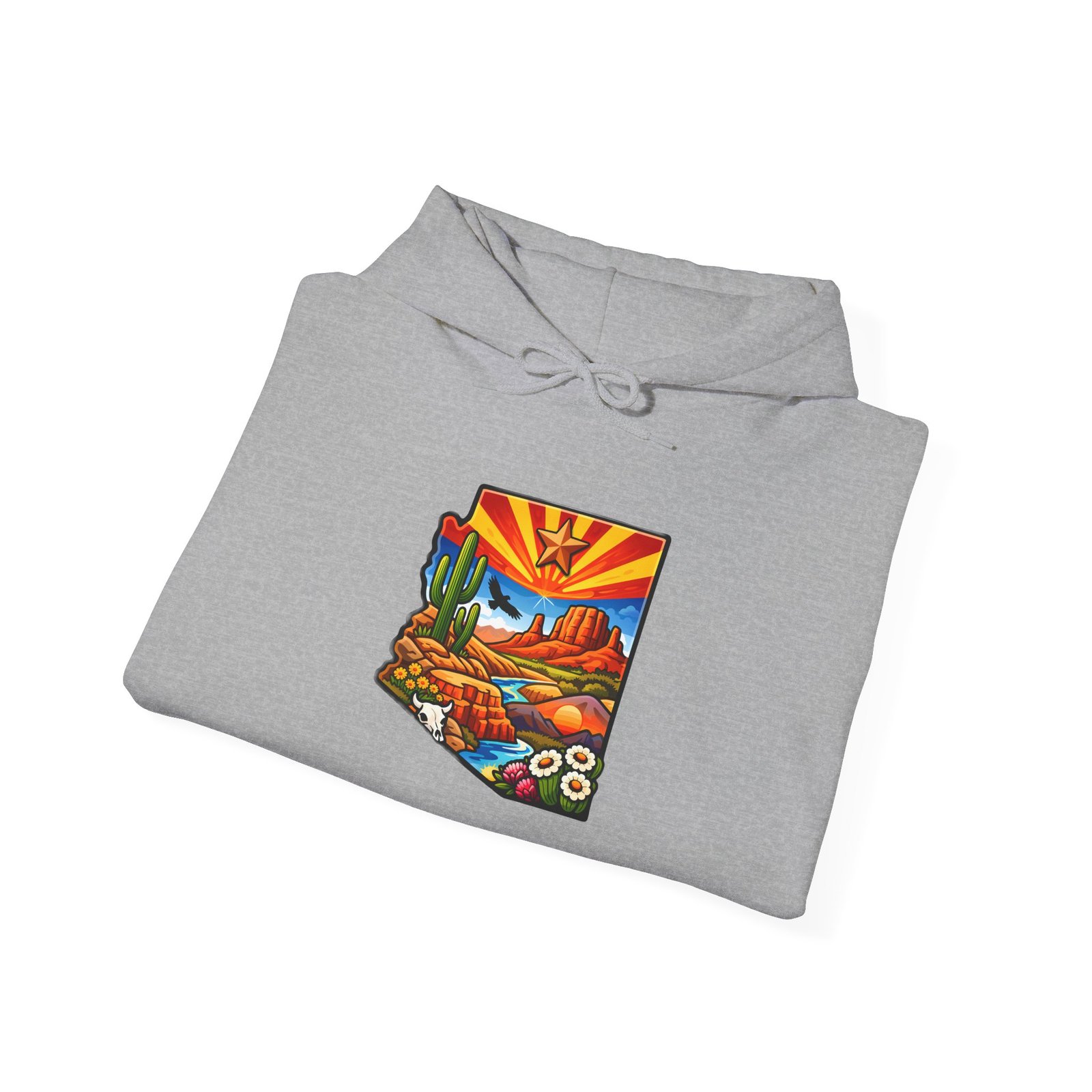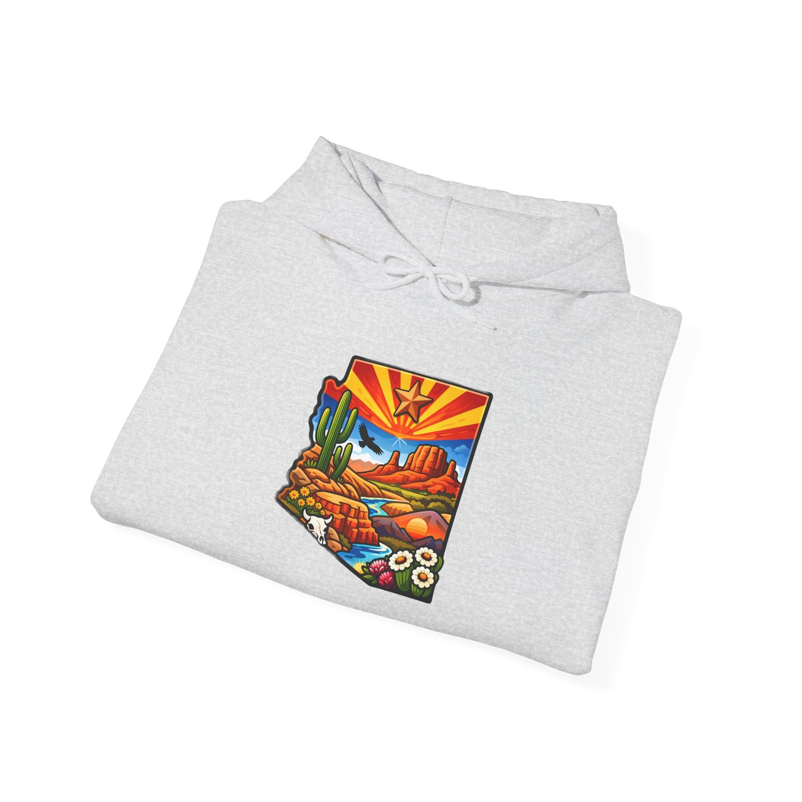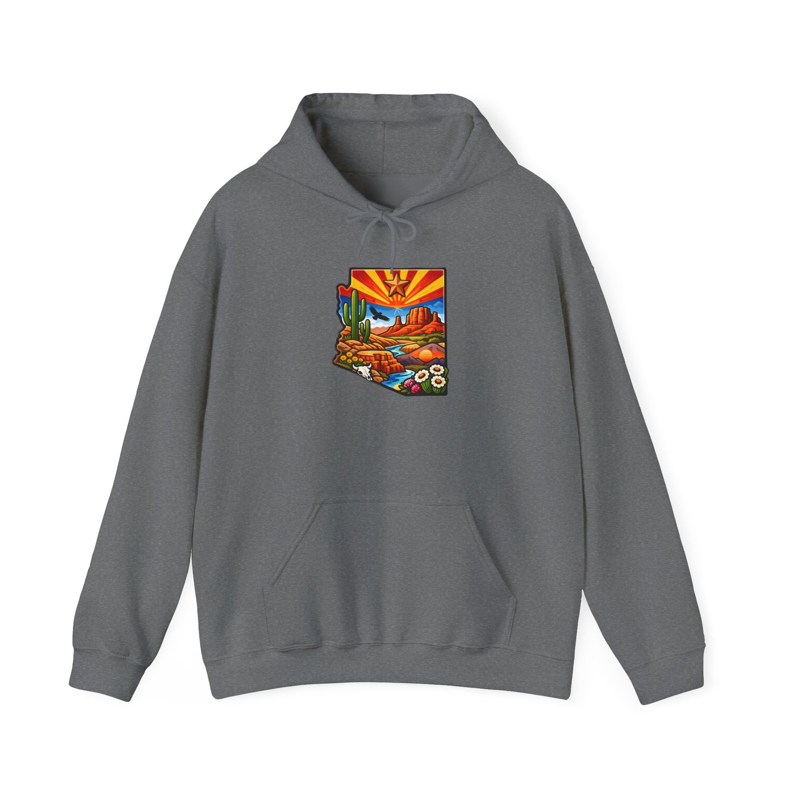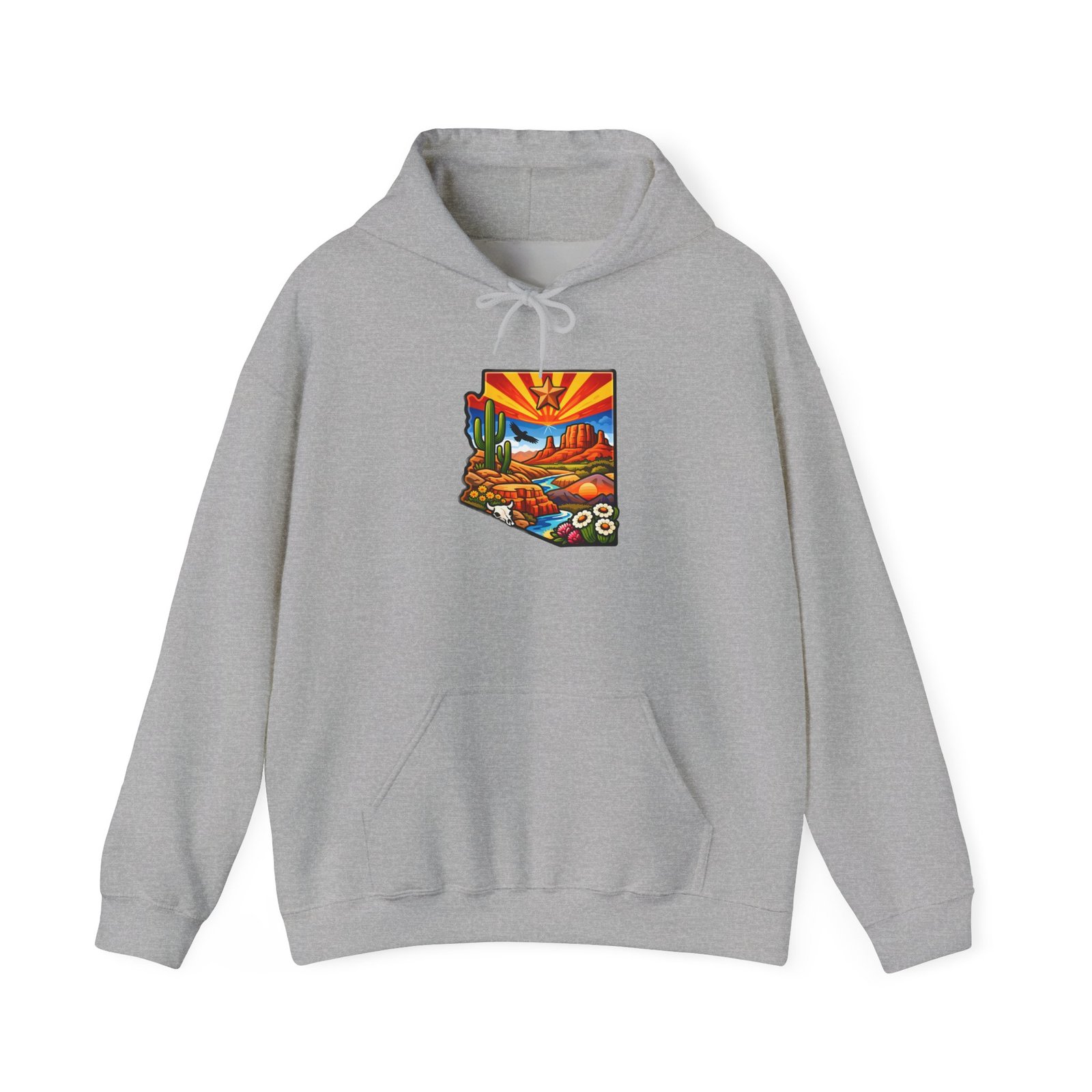 This cozy hooded sweatshirt carries the wide-sky feeling of desert mornings in a warm, wearable form. A vivid, hand-drawn landscape sits over the chest: sunburst skies, saguaro silhouettes, layered red rock mesas and a meandering arroyo dotted with wildflowers. The artwork is bright without being loud — it reads like a postcard from a quiet road trip and brings that same calm energy to everyday wear. The mid-weight fabric holds the print crisp and true, while the double-lined hood and roomy kangaroo pocket invite lingering in cool air or lingering conversations. Wear it on early drives, campsite coffee breaks, or slow Sundays when you want a little bit of horizon with your comfort.