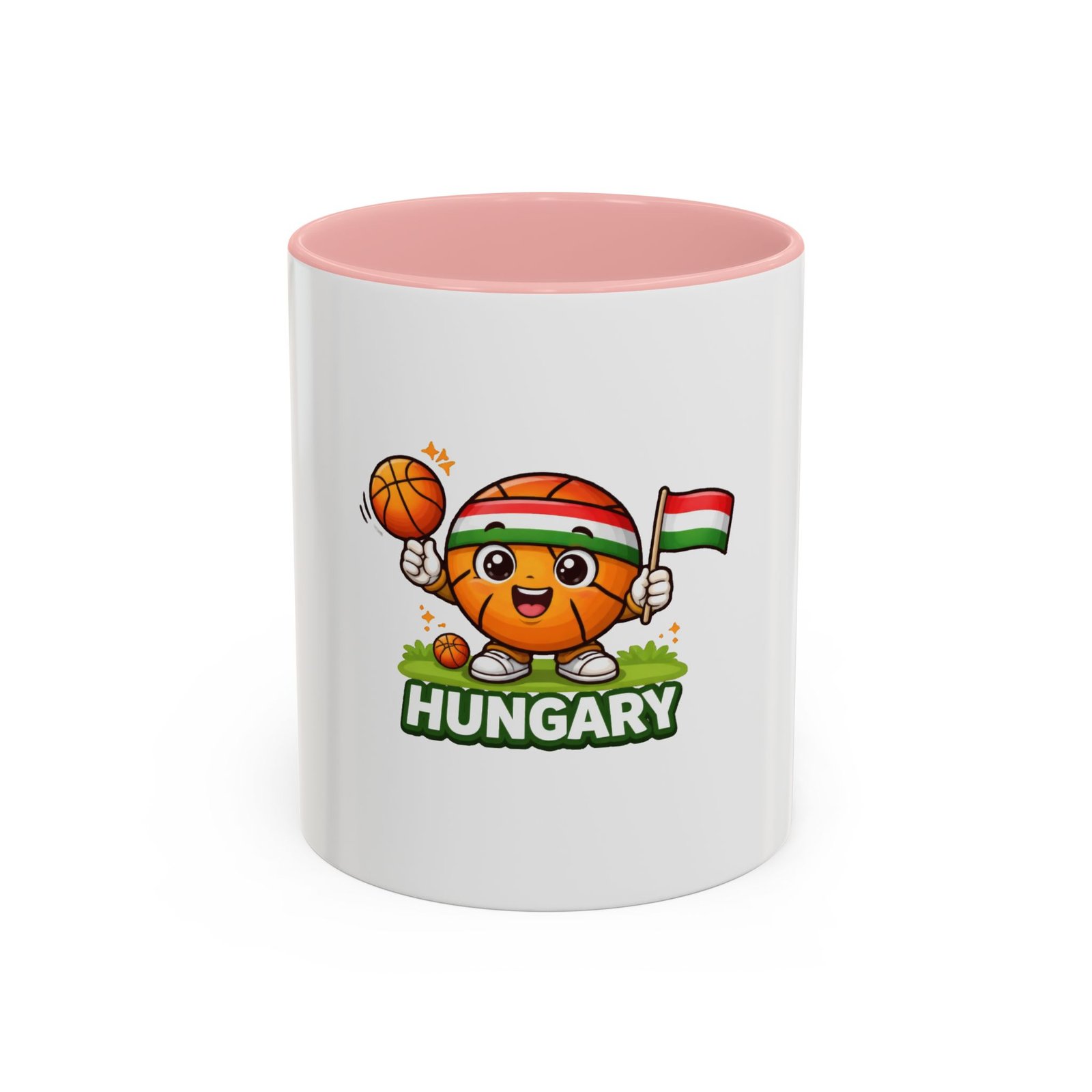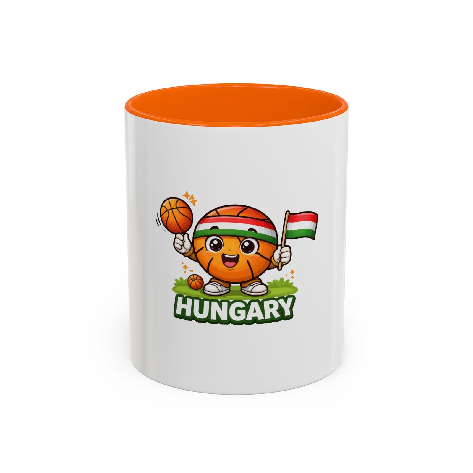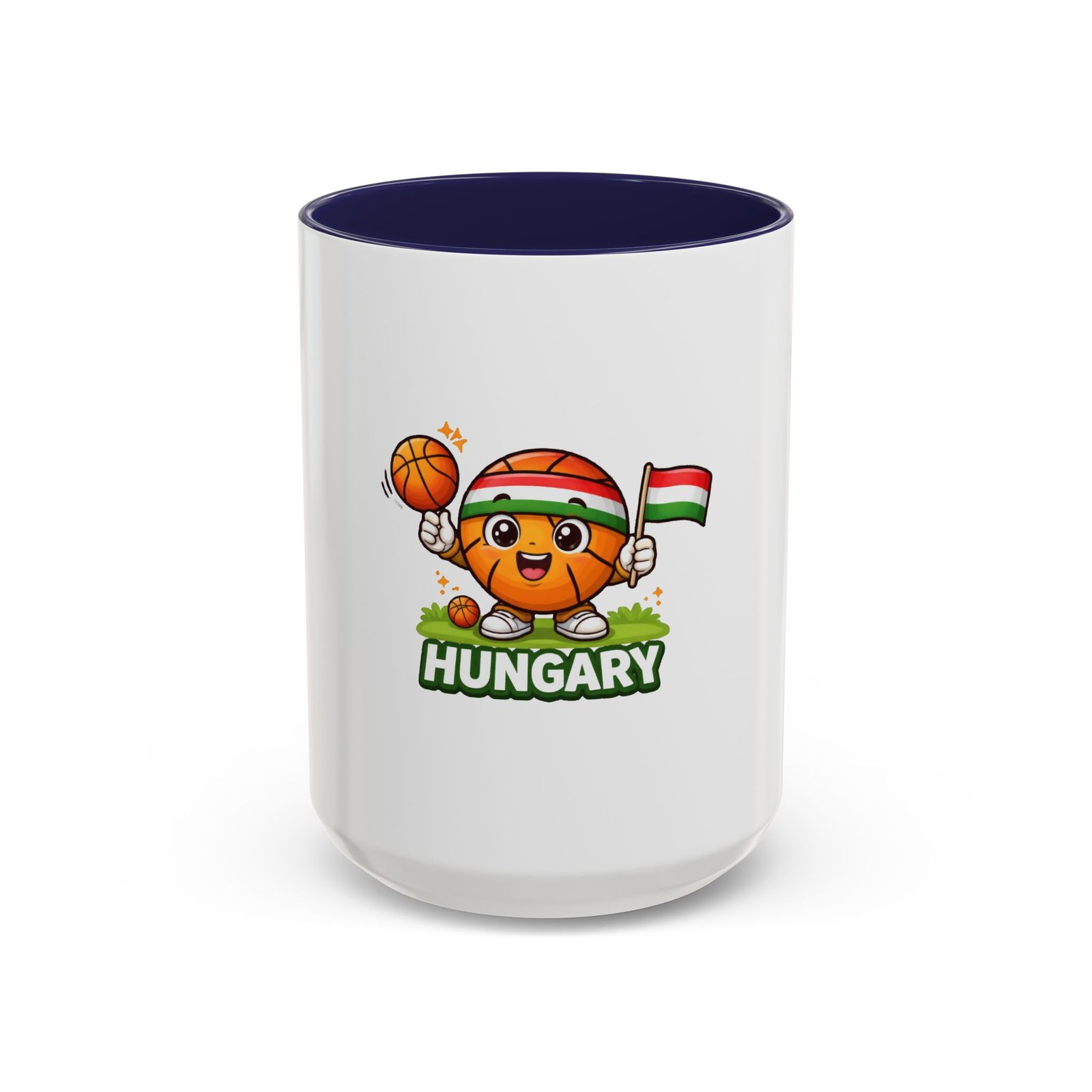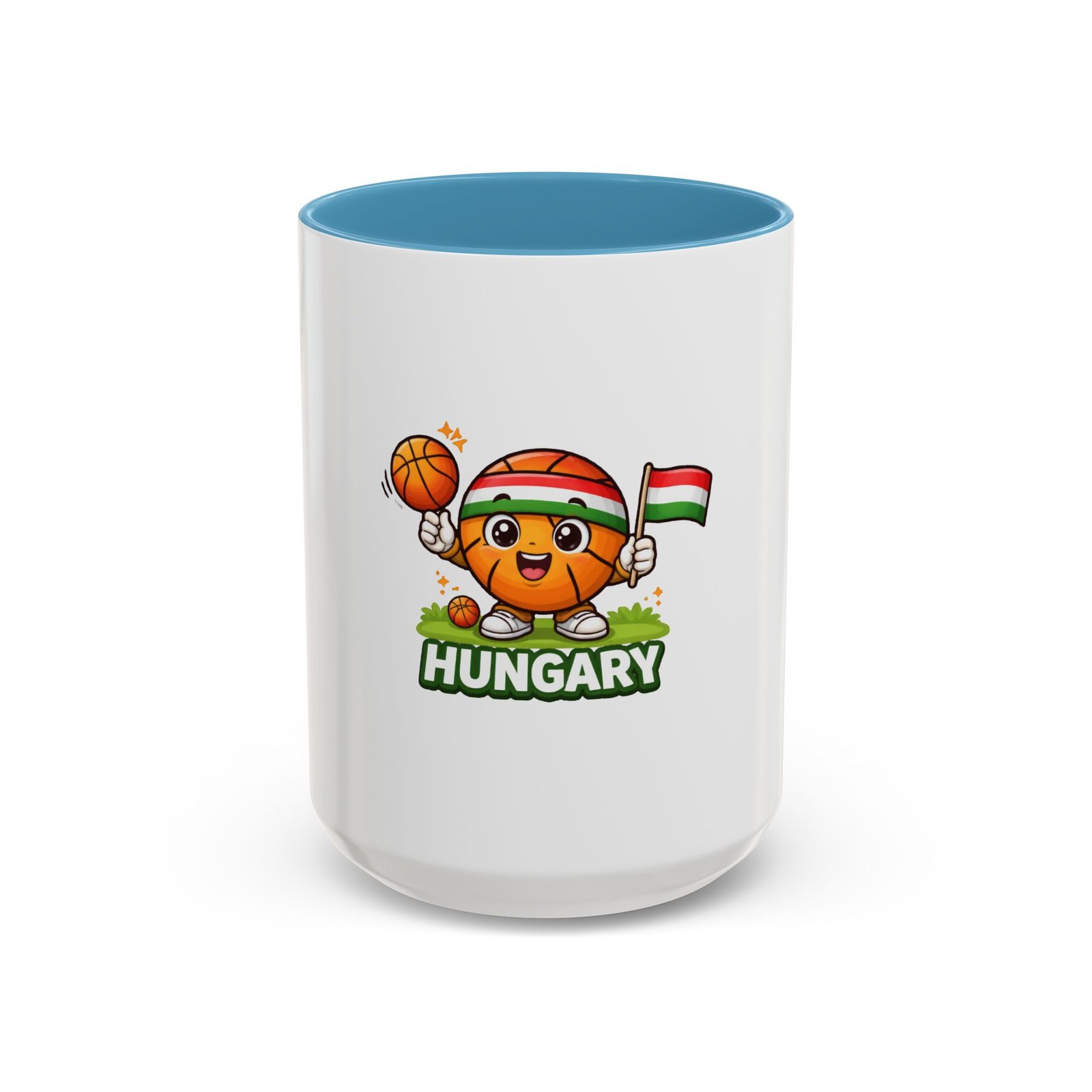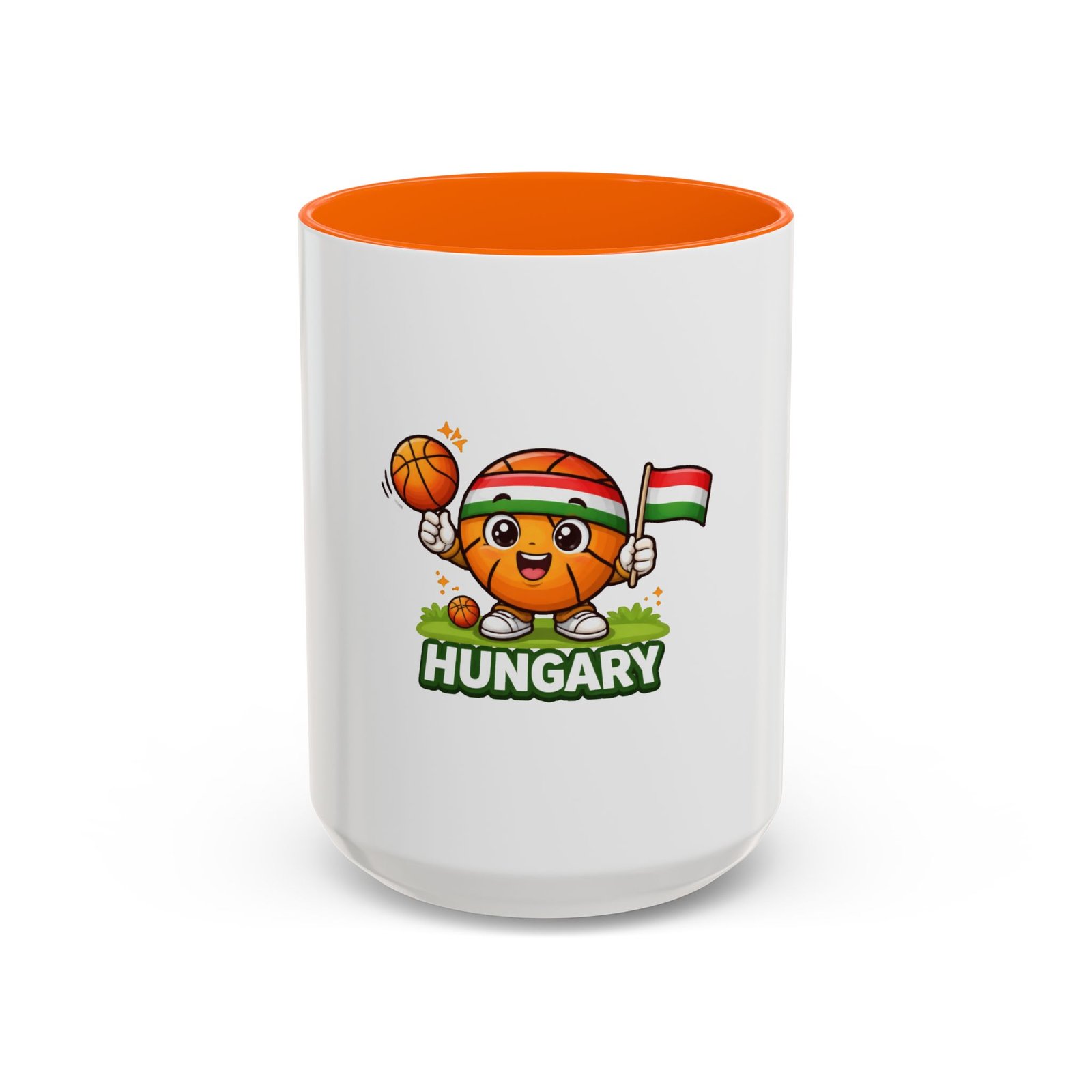 Start mornings with a playful, spirited sip. This ceramic mug pairs a glossy white exterior with a bold colored interior and handle, showcasing a cheerful basketball character waving the Hungarian flag. It brings a lighthearted, sporty energy to everyday routines — whether fueling up before a local game, cheering from the couch, or sharing a laugh with teammates. The vivid print and color-contrast handle make the design pop, while microwave and dishwasher safety keep it practical for daily use.