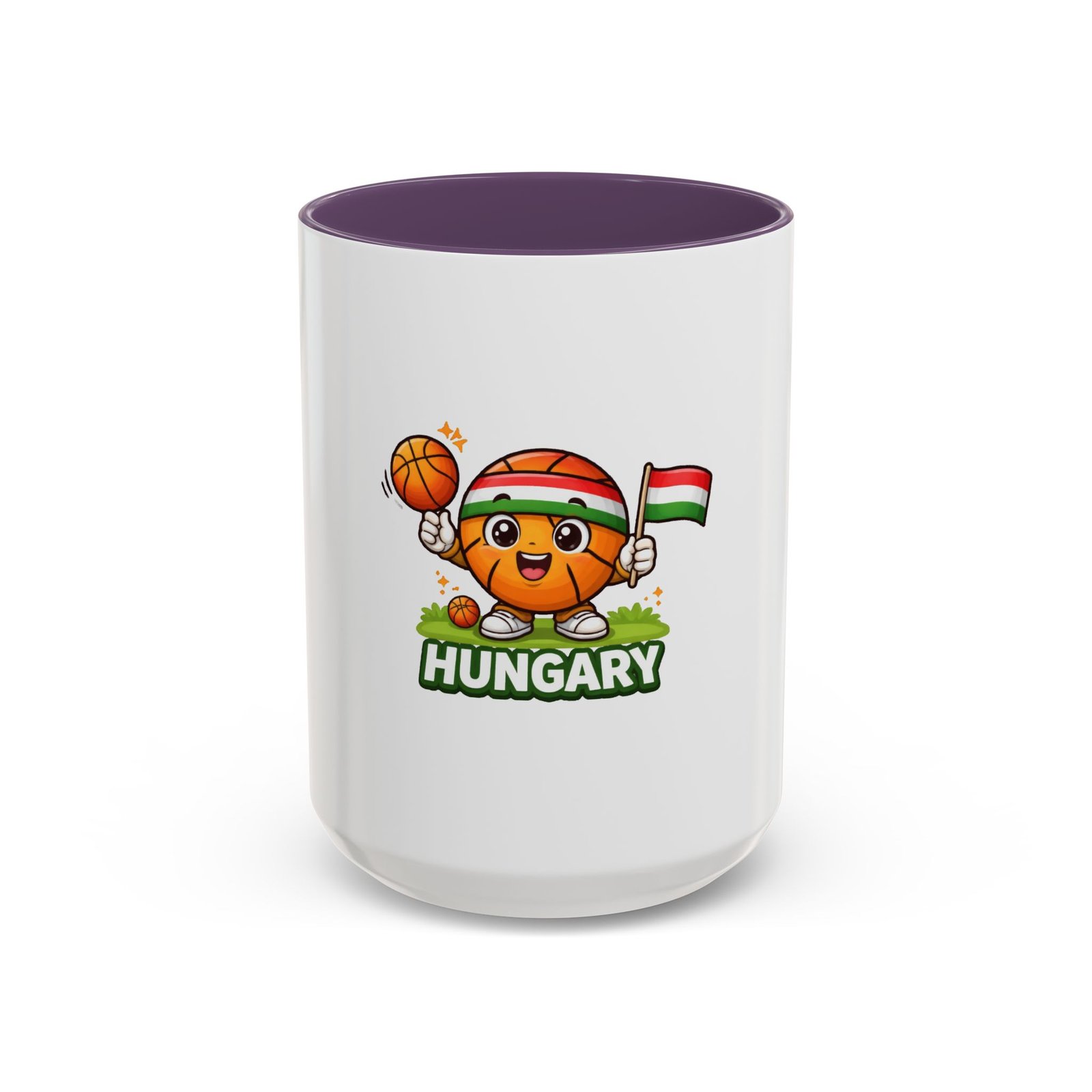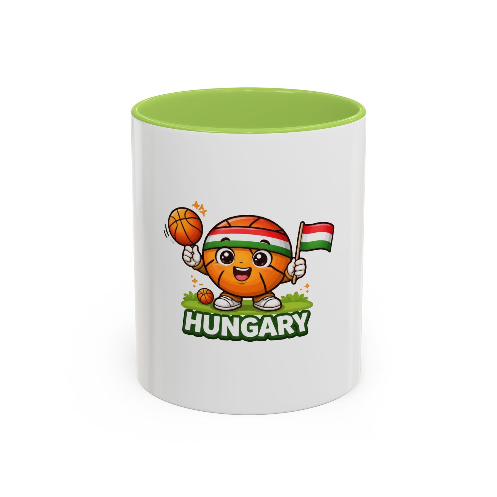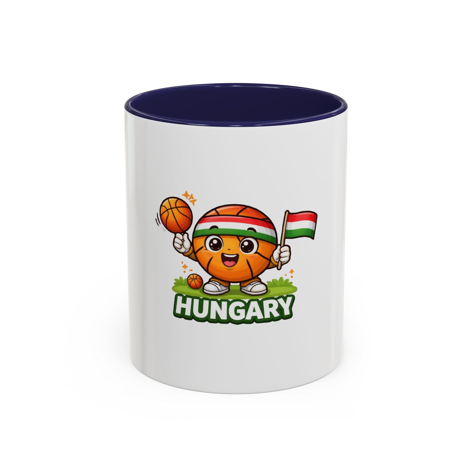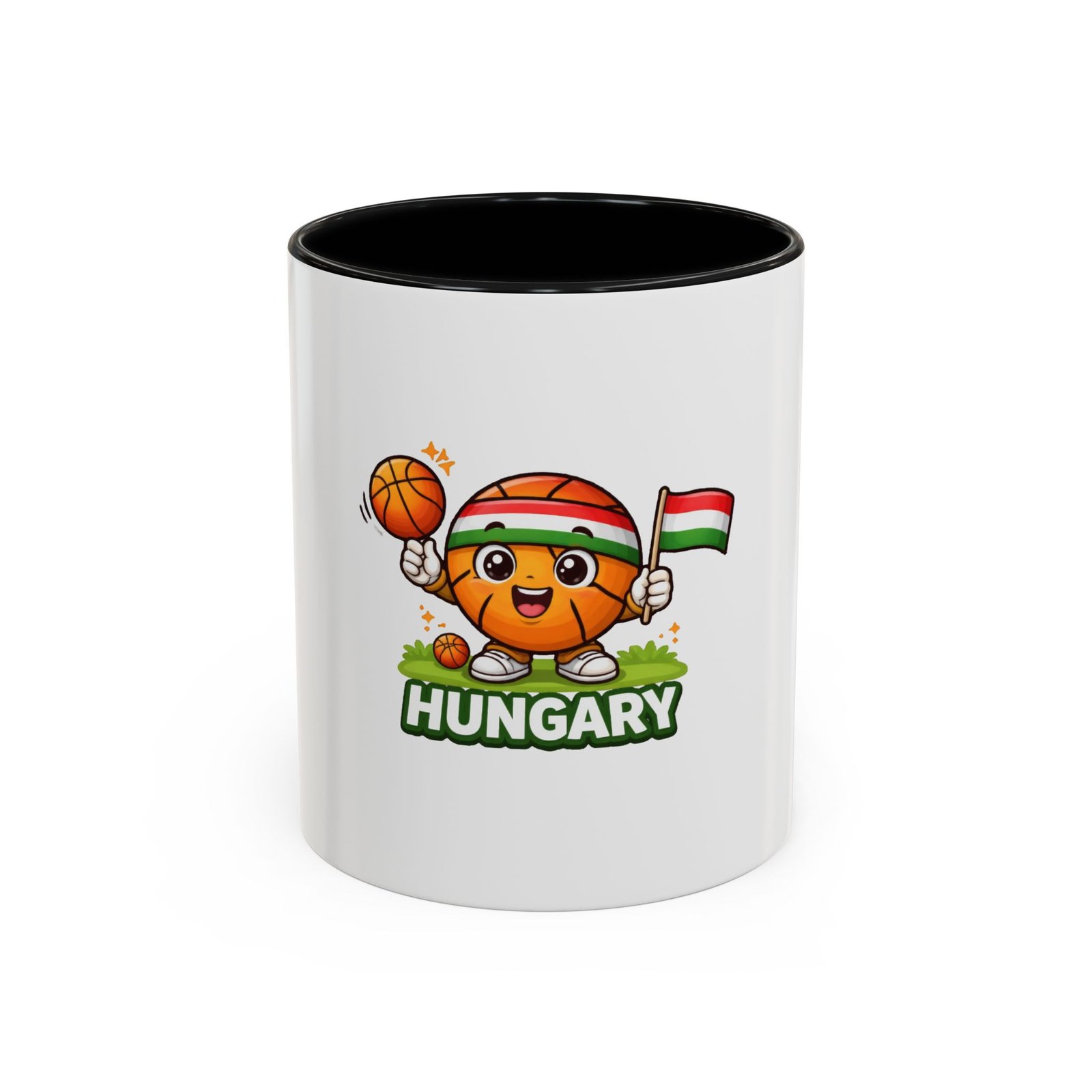 Start mornings with a playful, spirited sip. This ceramic mug pairs a glossy white exterior with a bold colored interior and handle, showcasing a cheerful basketball character waving the Hungarian flag. It brings a lighthearted, sporty energy to everyday routines — whether fueling up before a local game, cheering from the couch, or sharing a laugh with teammates. The vivid print and color-contrast handle make the design pop, while microwave and dishwasher safety keep it practical for daily use.