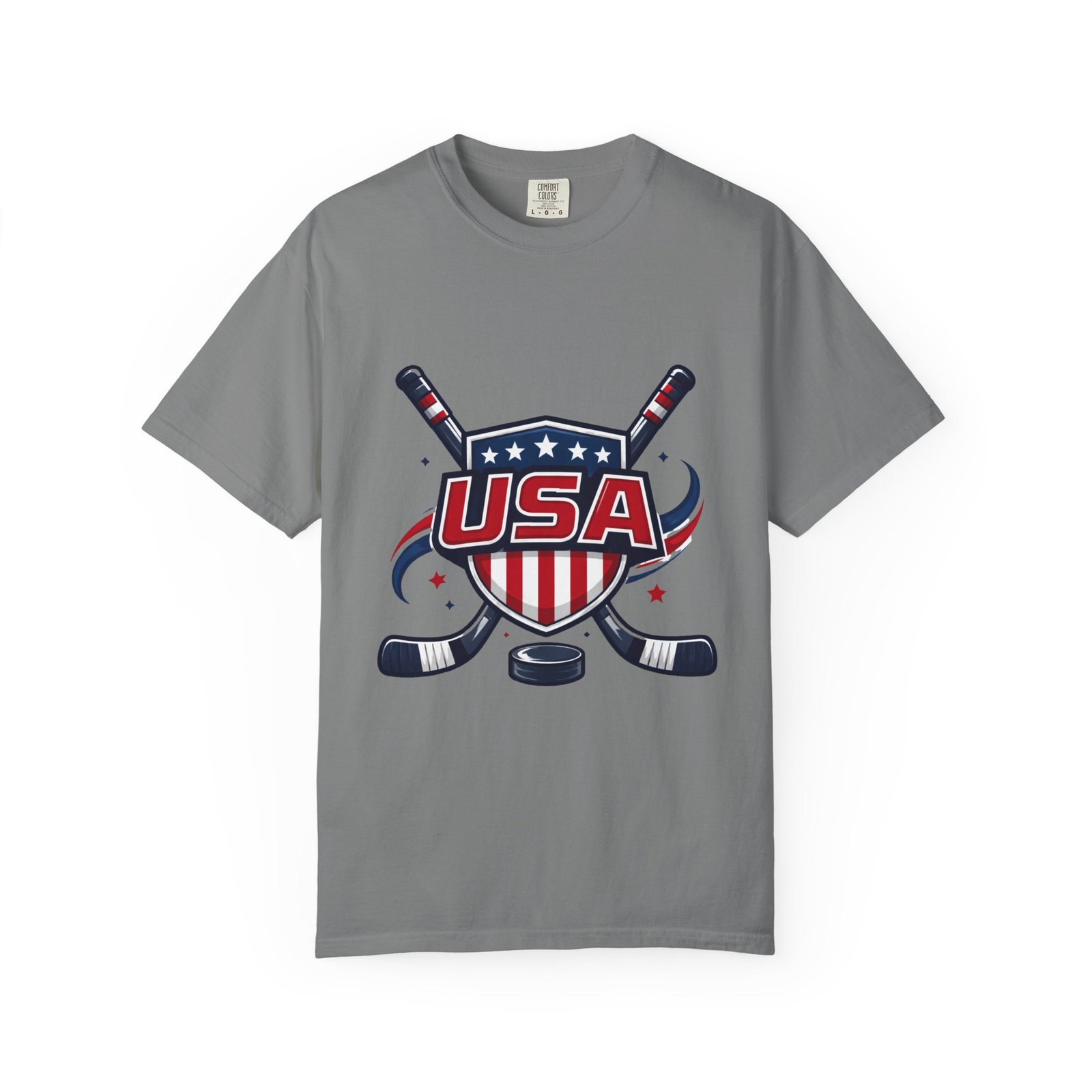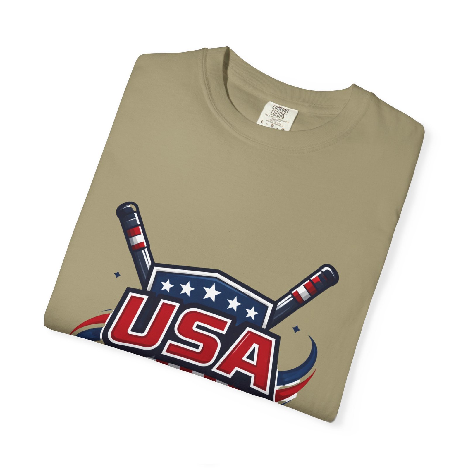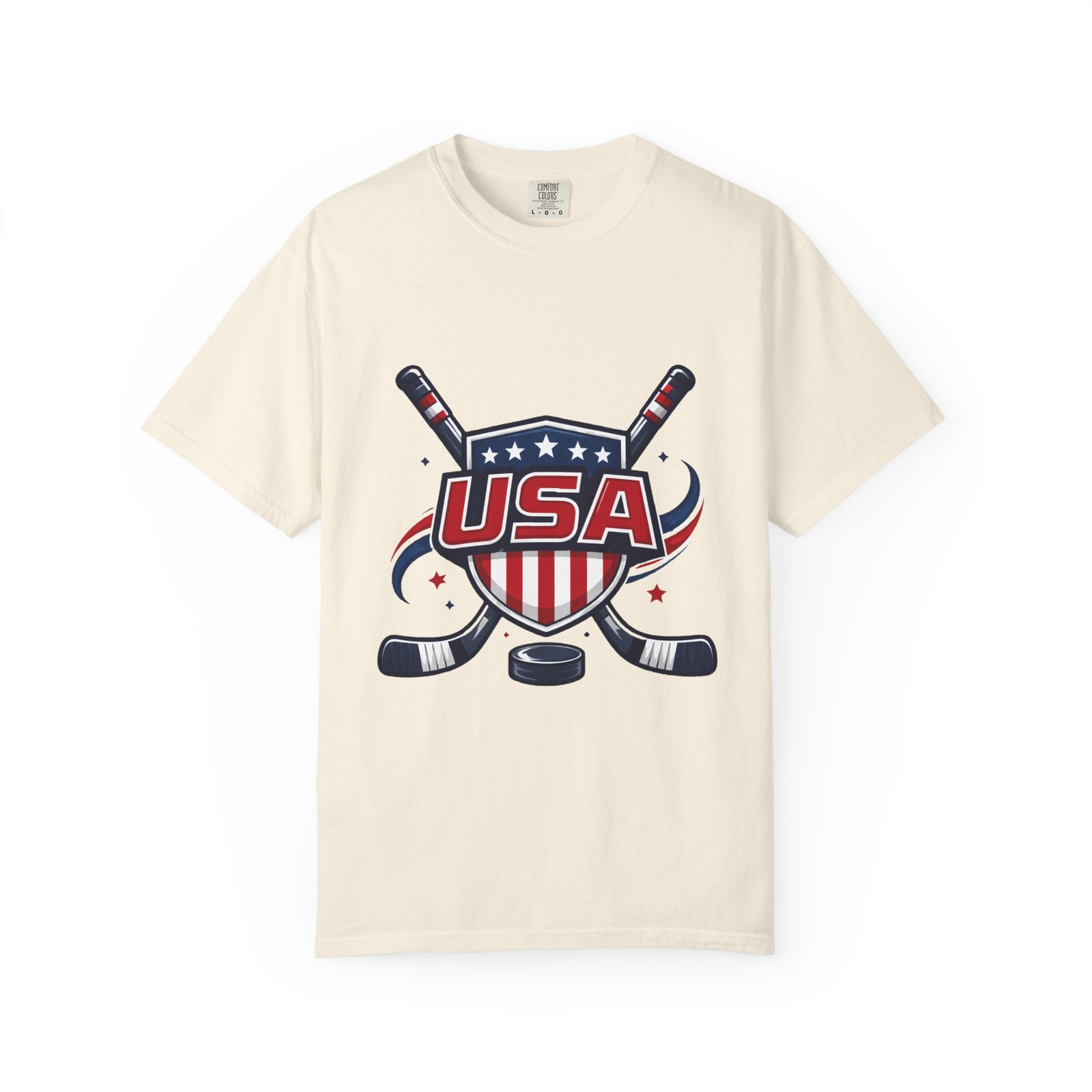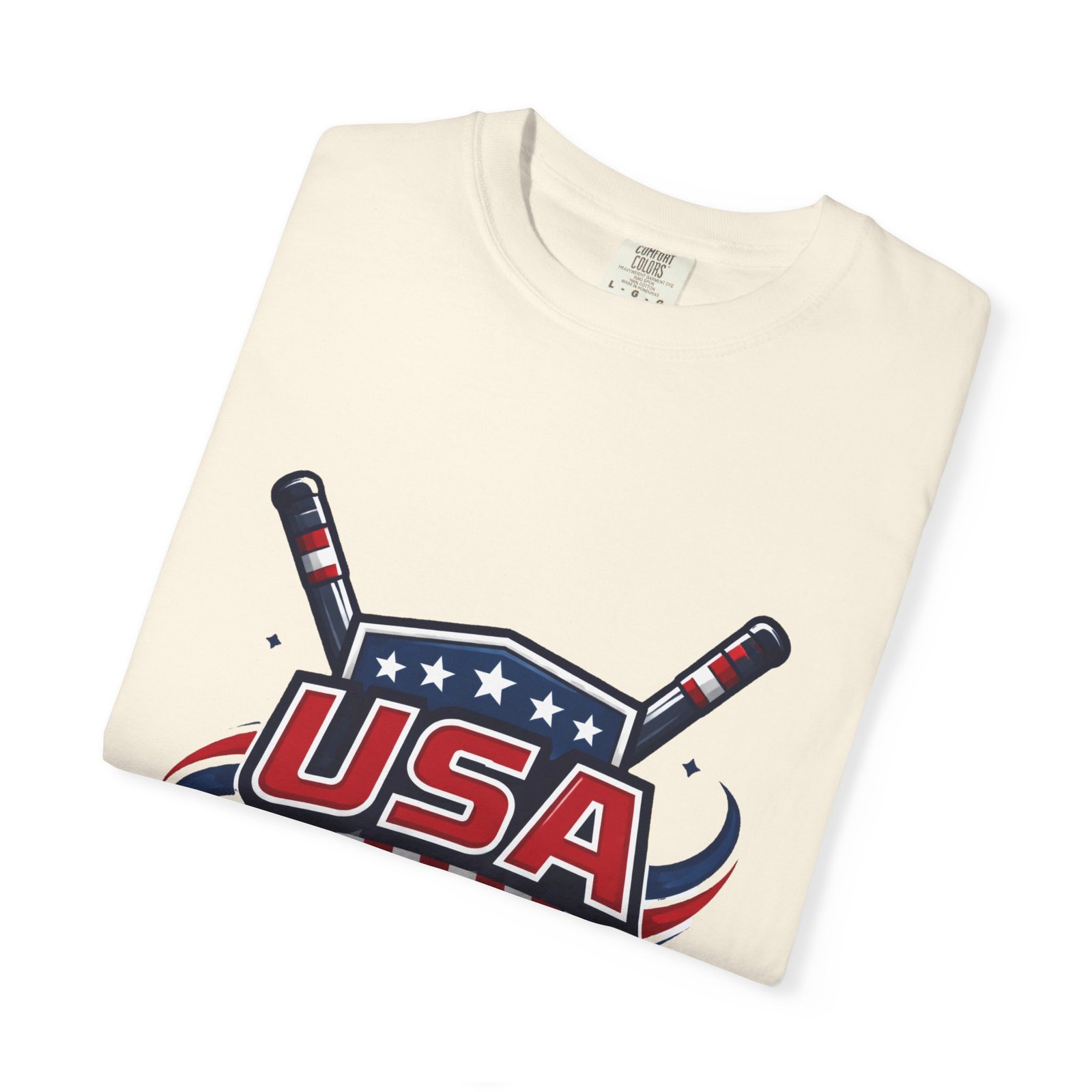 Lightweight and lived-in, this garment-dyed tee carries a vintage hockey spirit with a bold USA crest and crossed sticks. The soft, washed-in color and substantial heavyweight cotton feel like a favorite shirt from the first wear. It sits relaxed across the shoulders and breathes on and off the ice, whether you’re cheering from the stands, practicing stickhandling in the driveway, or layering under a flannel at a rink-side bonfire. The sewn-in label and clean tubular knit keep the silhouette smooth and simple — the graphic does the talking. Choose from many colors and sizes to match team colors or everyday rotation.