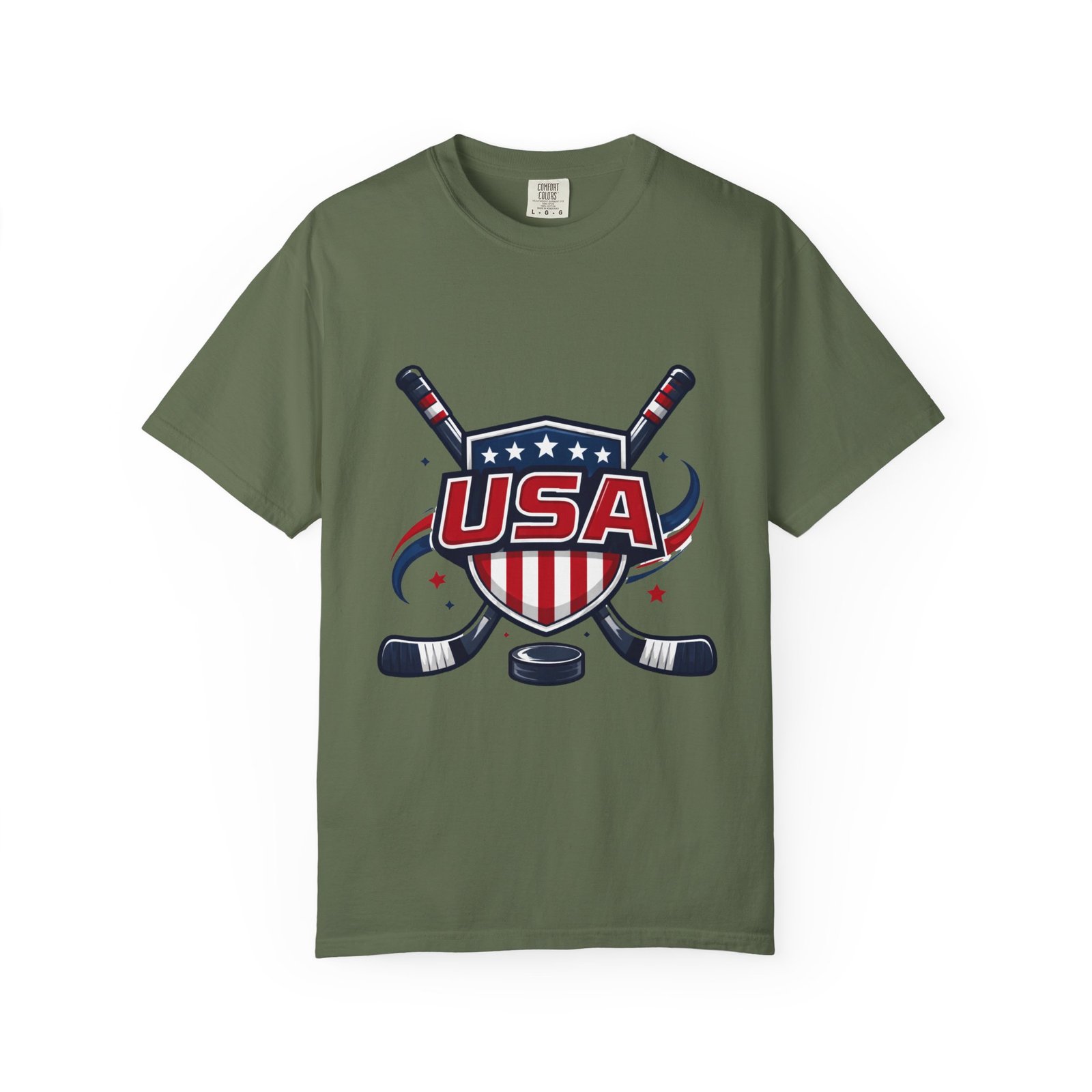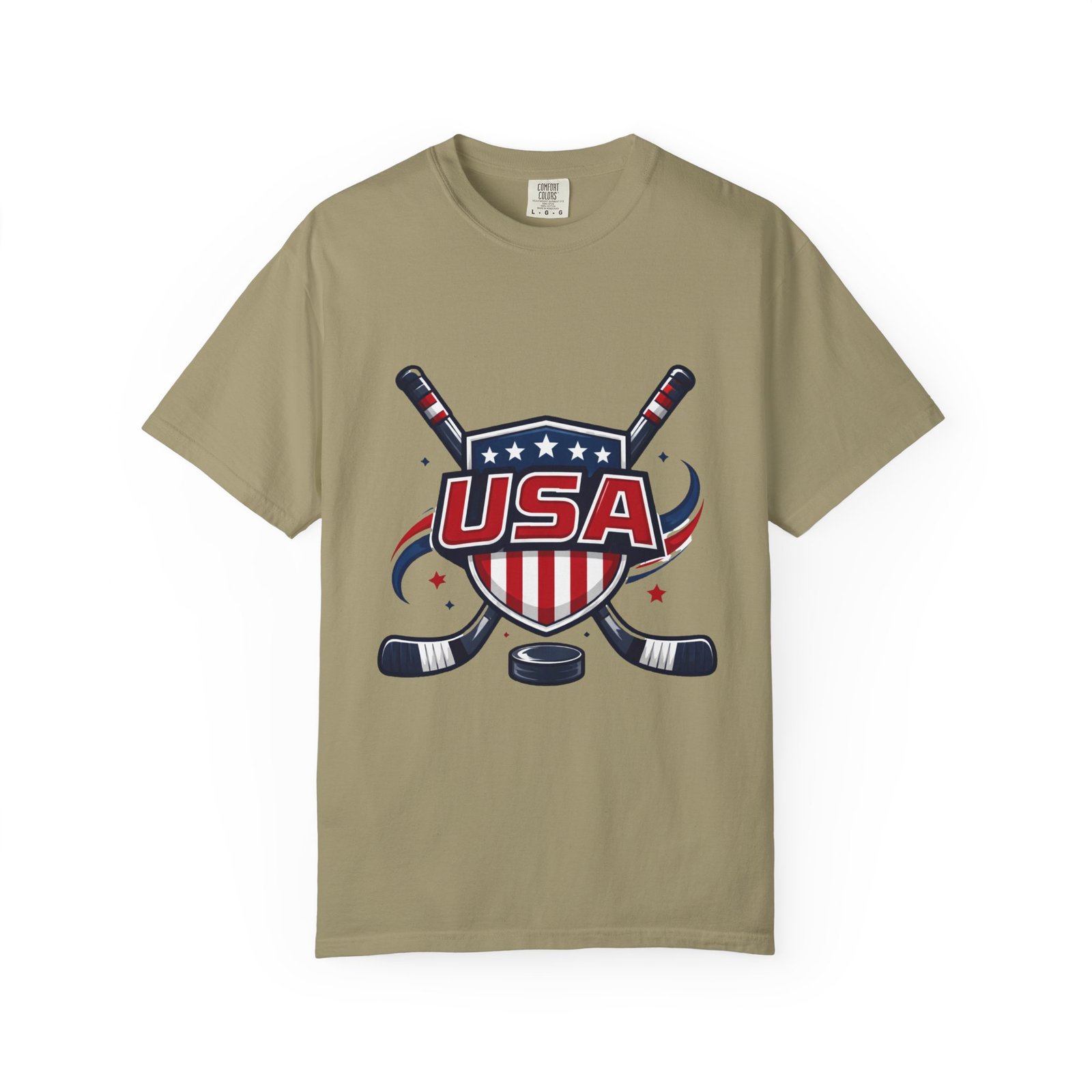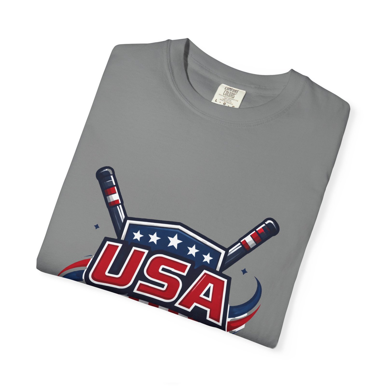 Lightweight and lived-in, this garment-dyed tee carries a vintage hockey spirit with a bold USA crest and crossed sticks. The soft, washed-in color and substantial heavyweight cotton feel like a favorite shirt from the first wear. It sits relaxed across the shoulders and breathes on and off the ice, whether you’re cheering from the stands, practicing stickhandling in the driveway, or layering under a flannel at a rink-side bonfire. The sewn-in label and clean tubular knit keep the silhouette smooth and simple — the graphic does the talking. Choose from many colors and sizes to match team colors or everyday rotation.