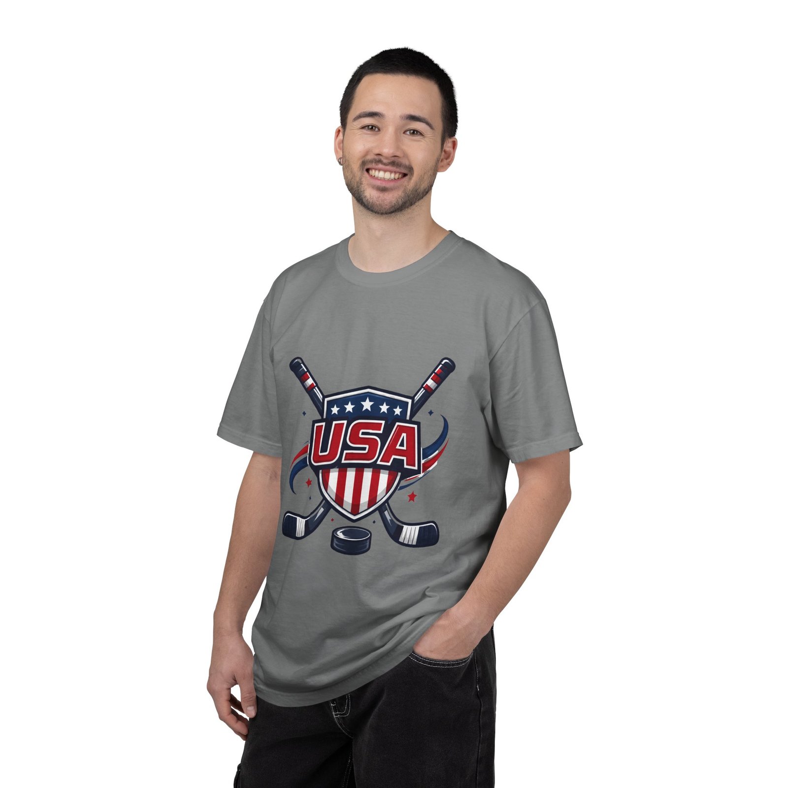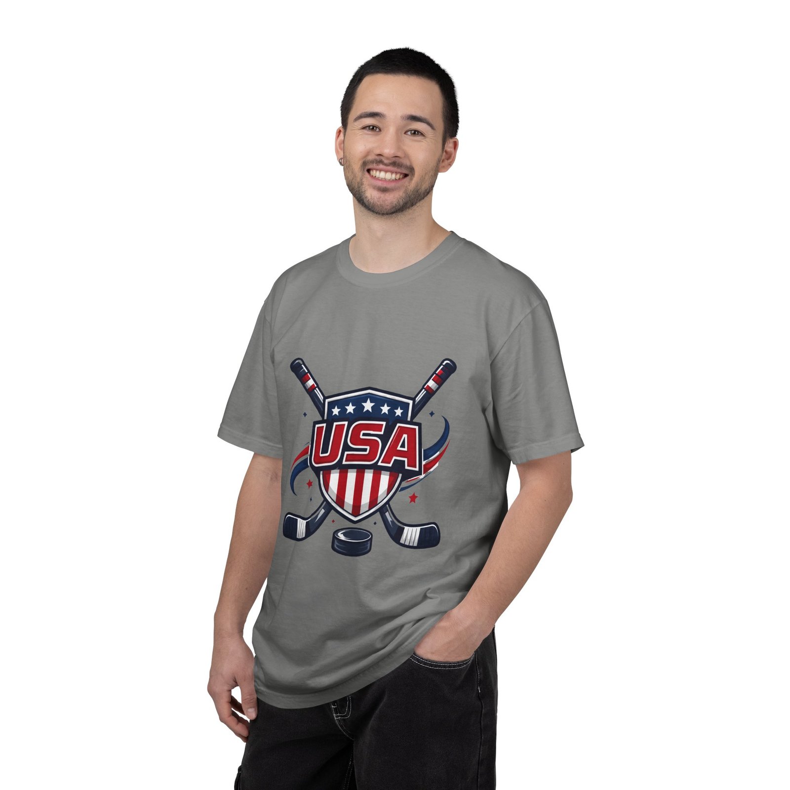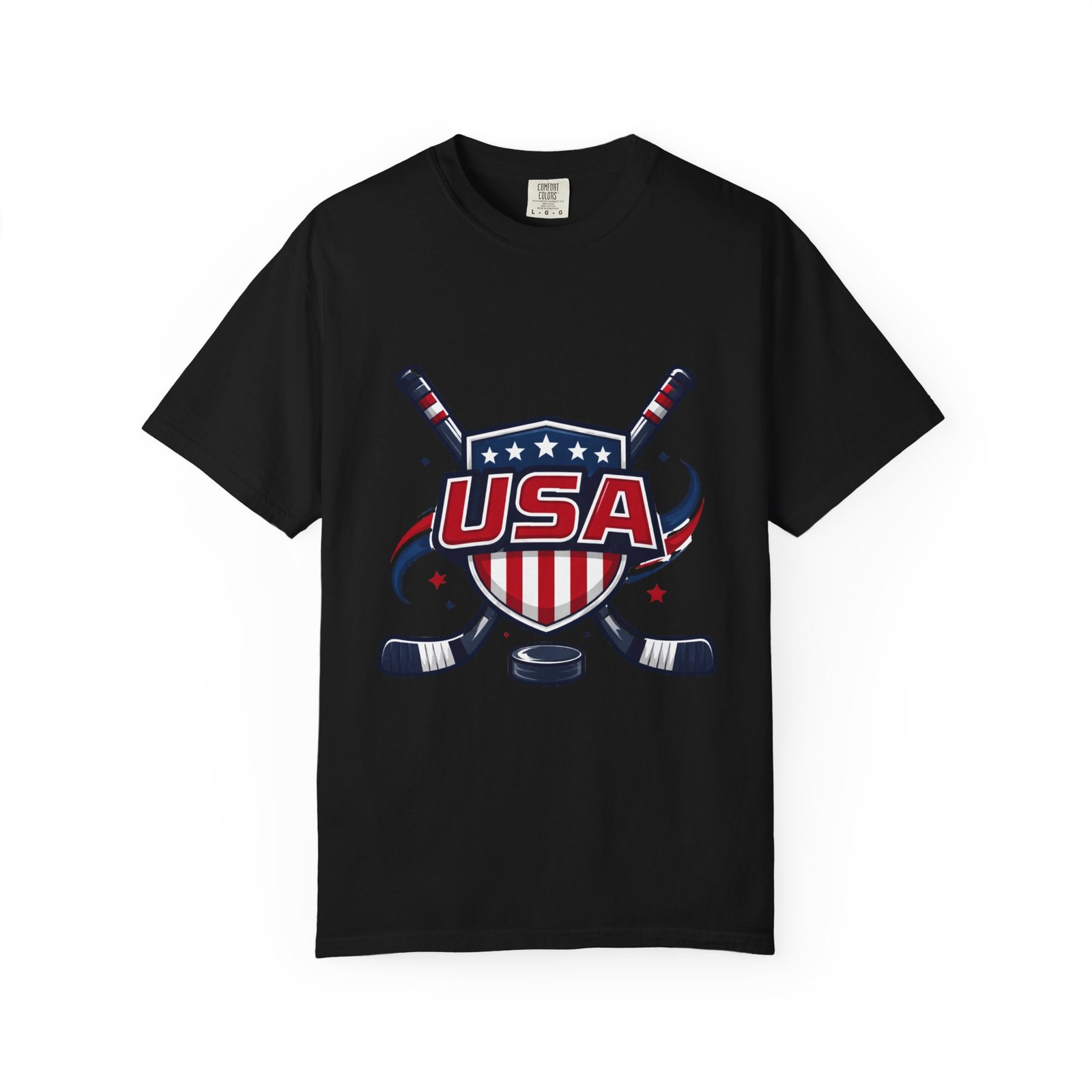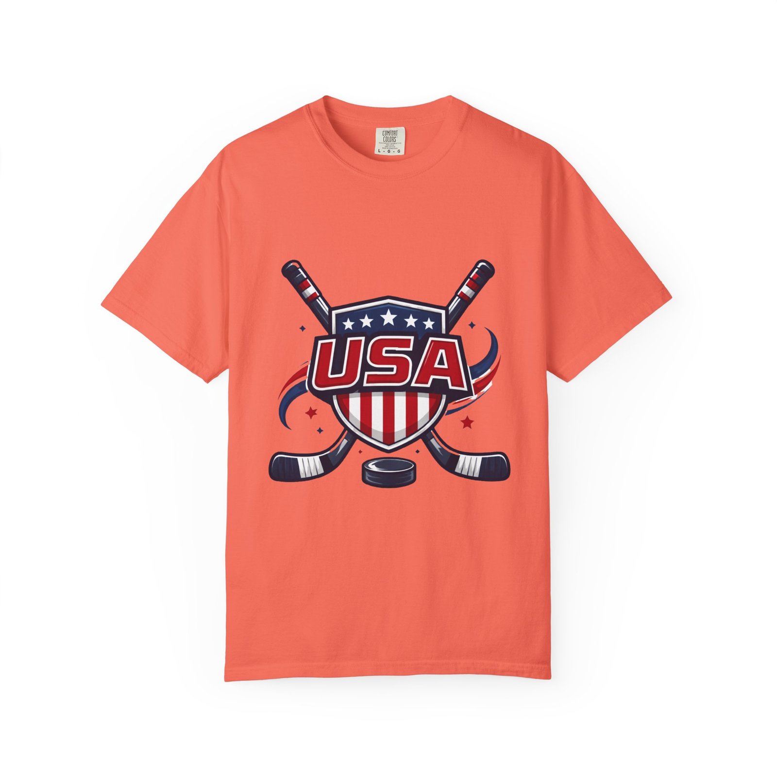 Lightweight and lived-in, this garment-dyed tee carries a vintage hockey spirit with a bold USA crest and crossed sticks. The soft, washed-in color and substantial heavyweight cotton feel like a favorite shirt from the first wear. It sits relaxed across the shoulders and breathes on and off the ice, whether you’re cheering from the stands, practicing stickhandling in the driveway, or layering under a flannel at a rink-side bonfire. The sewn-in label and clean tubular knit keep the silhouette smooth and simple — the graphic does the talking. Choose from many colors and sizes to match team colors or everyday rotation.