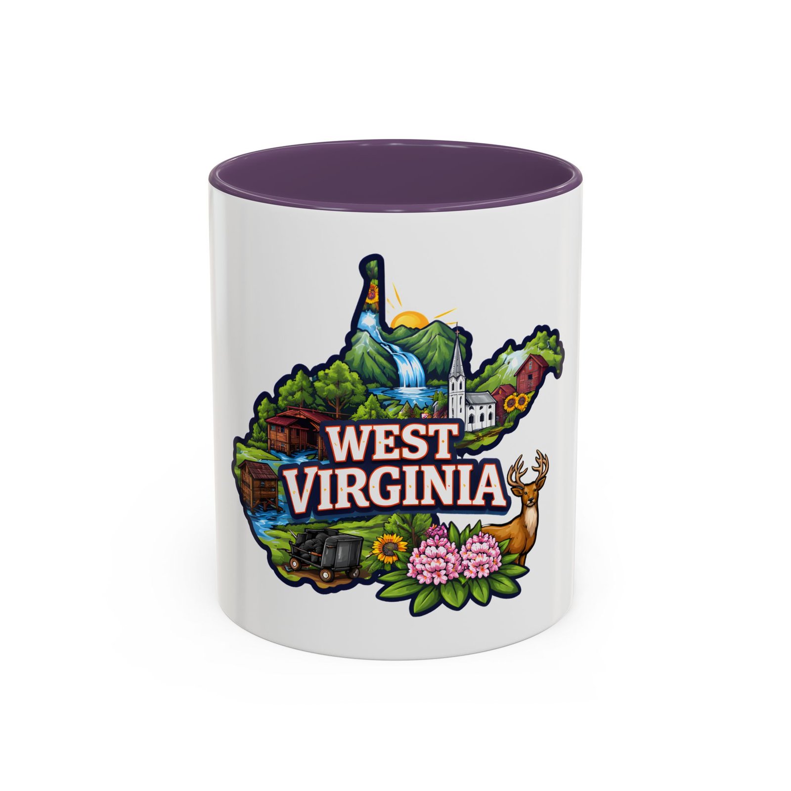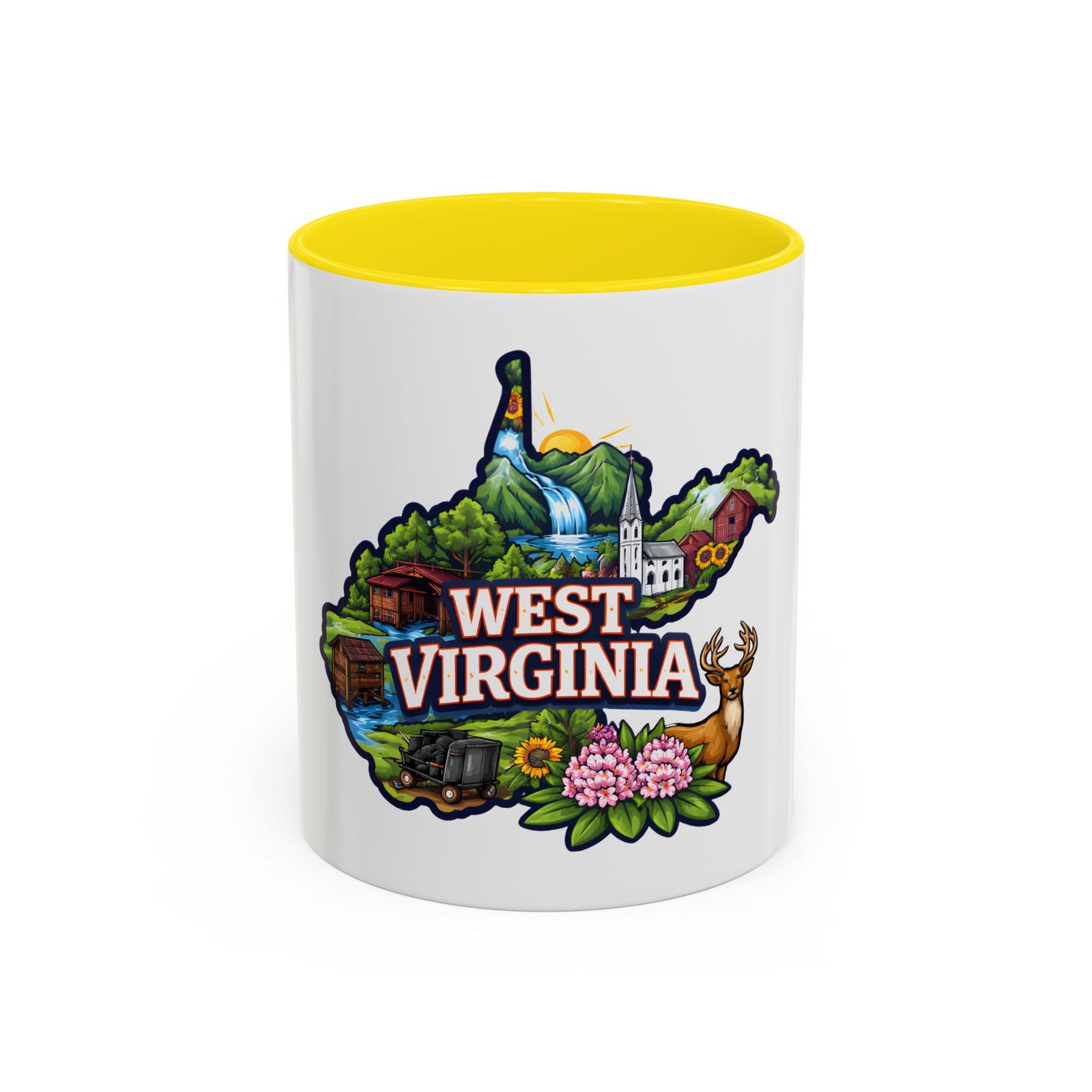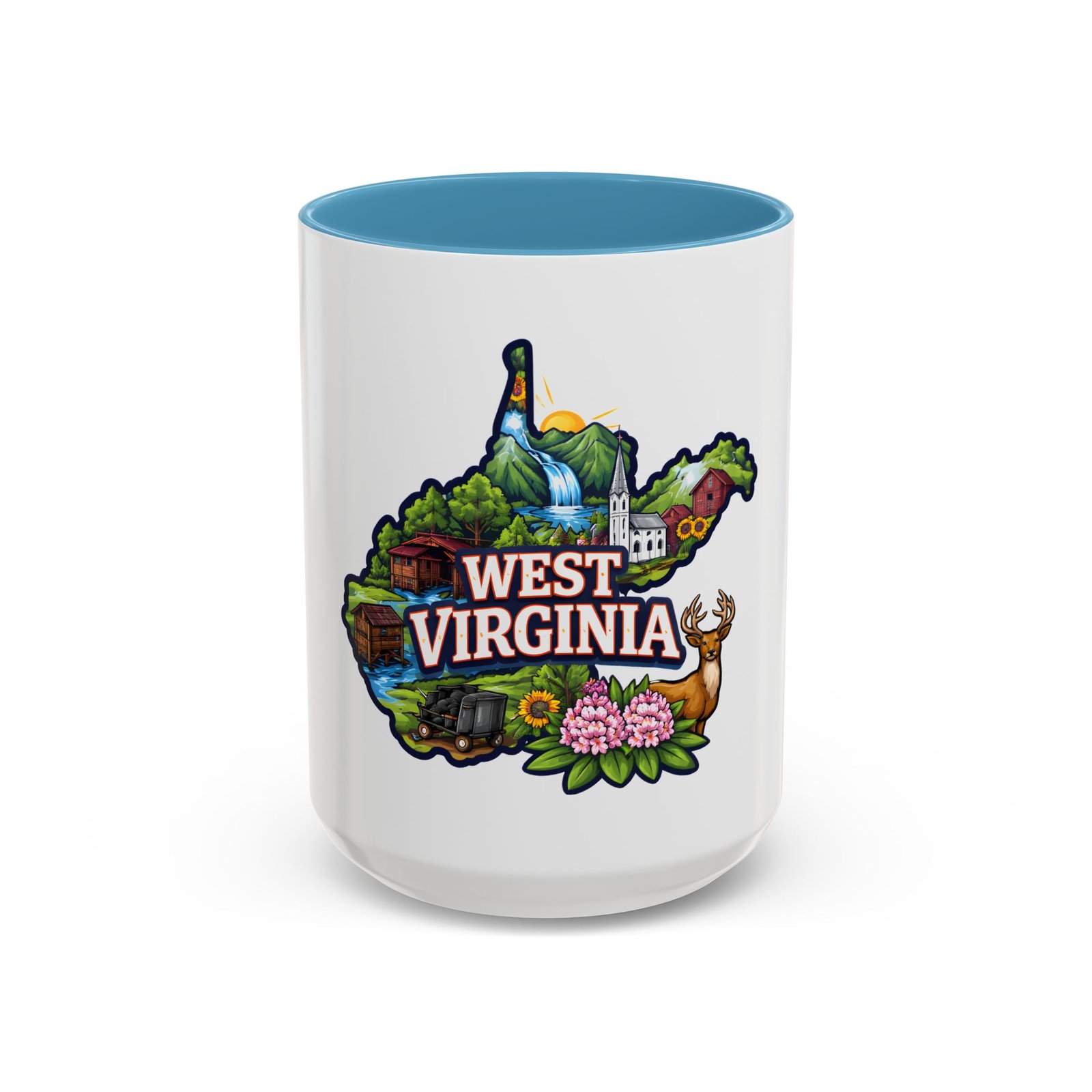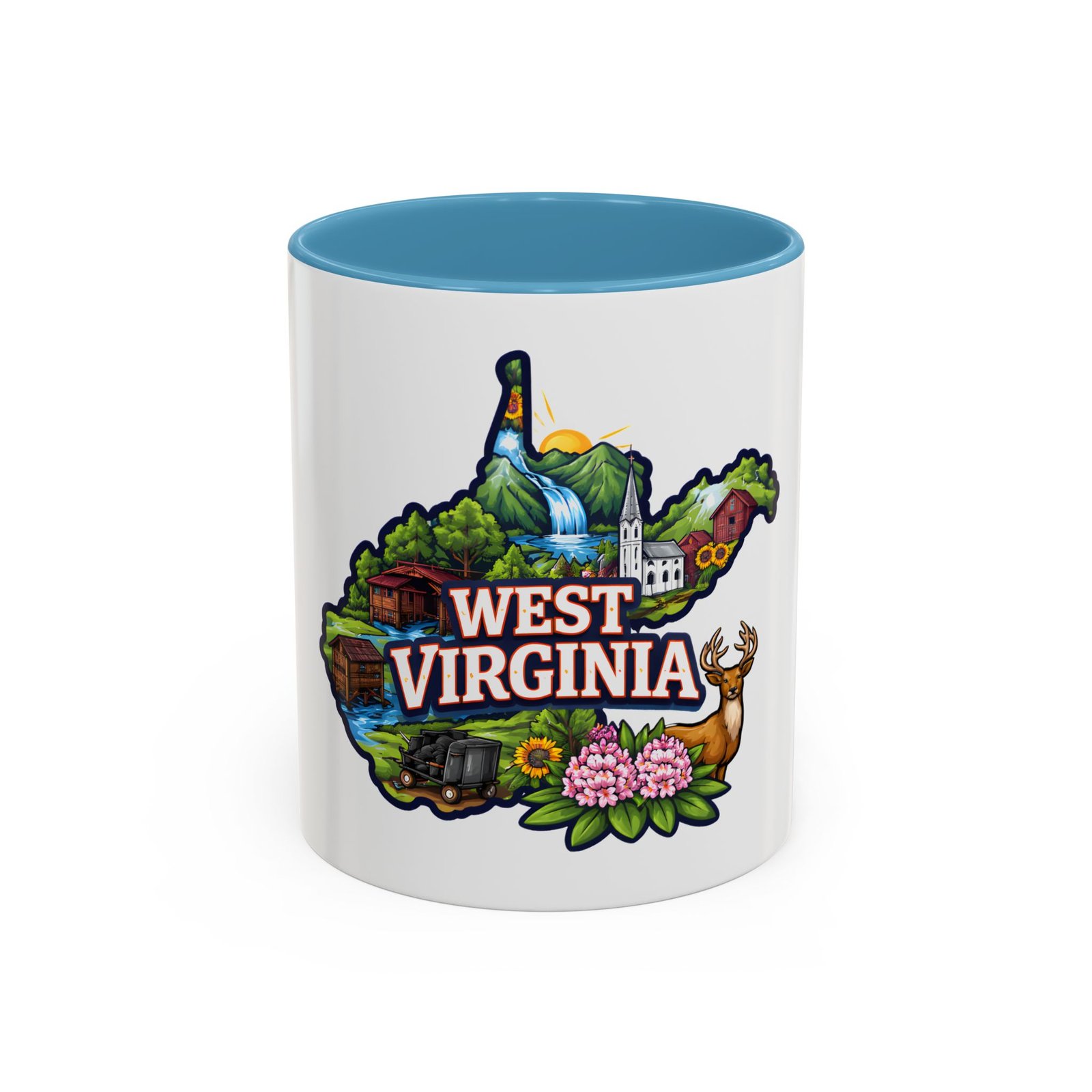 Sip a little bit of home with this ceramic accent mug, where bold color meets cozy familiarity. The illustrated West Virginia map wraps the mug in rolling hills, waterfalls, blooming rhododendrons, and a proud white-steepled church — small scenes that bring back mornings on the porch and afternoons on winding backroads. The colored interior and handle add a lively contrast that brightens your routine. It sits comfortably in your hands thanks to the C-shaped handle and glossy finish, turning an ordinary coffee break into a quiet moment of hometown pride.