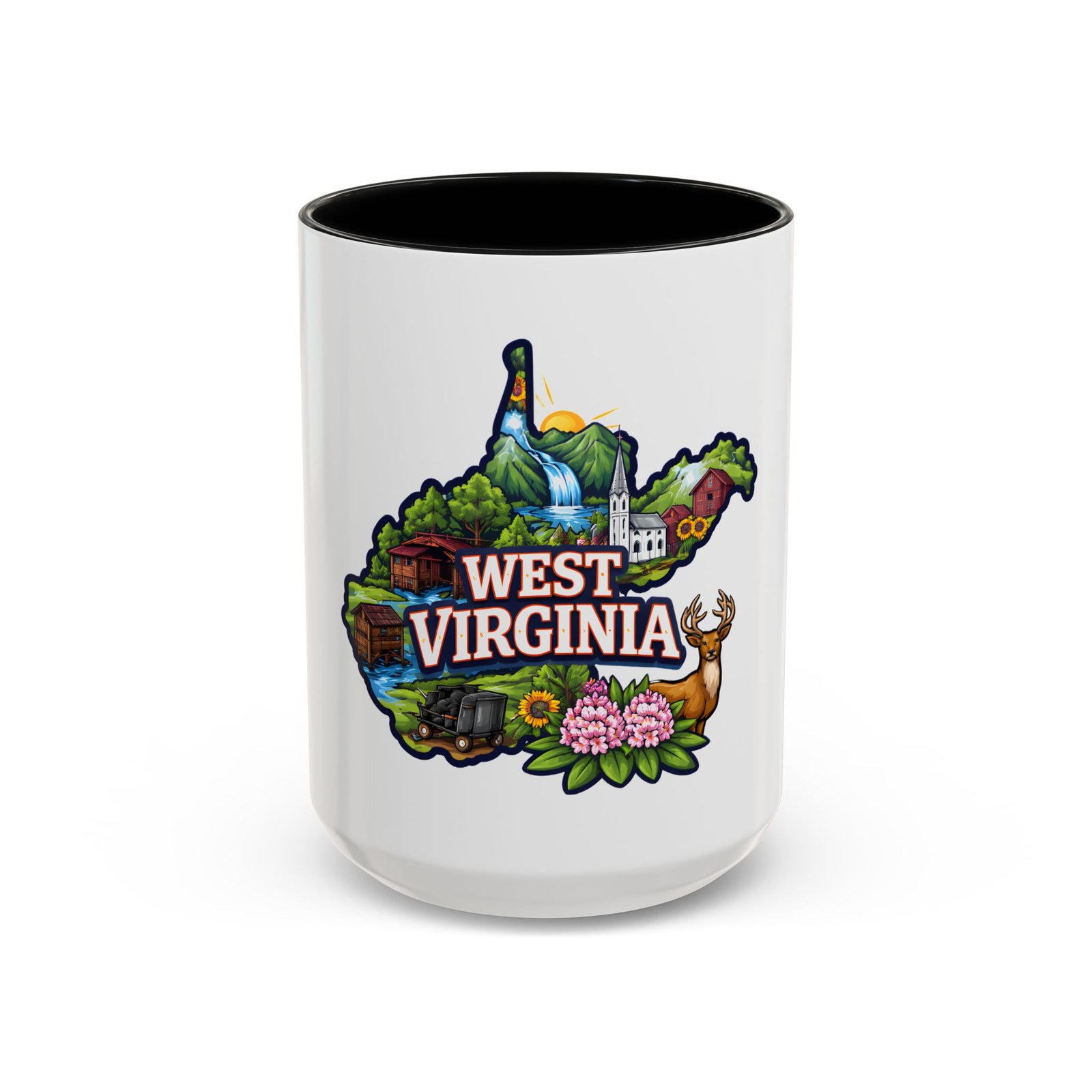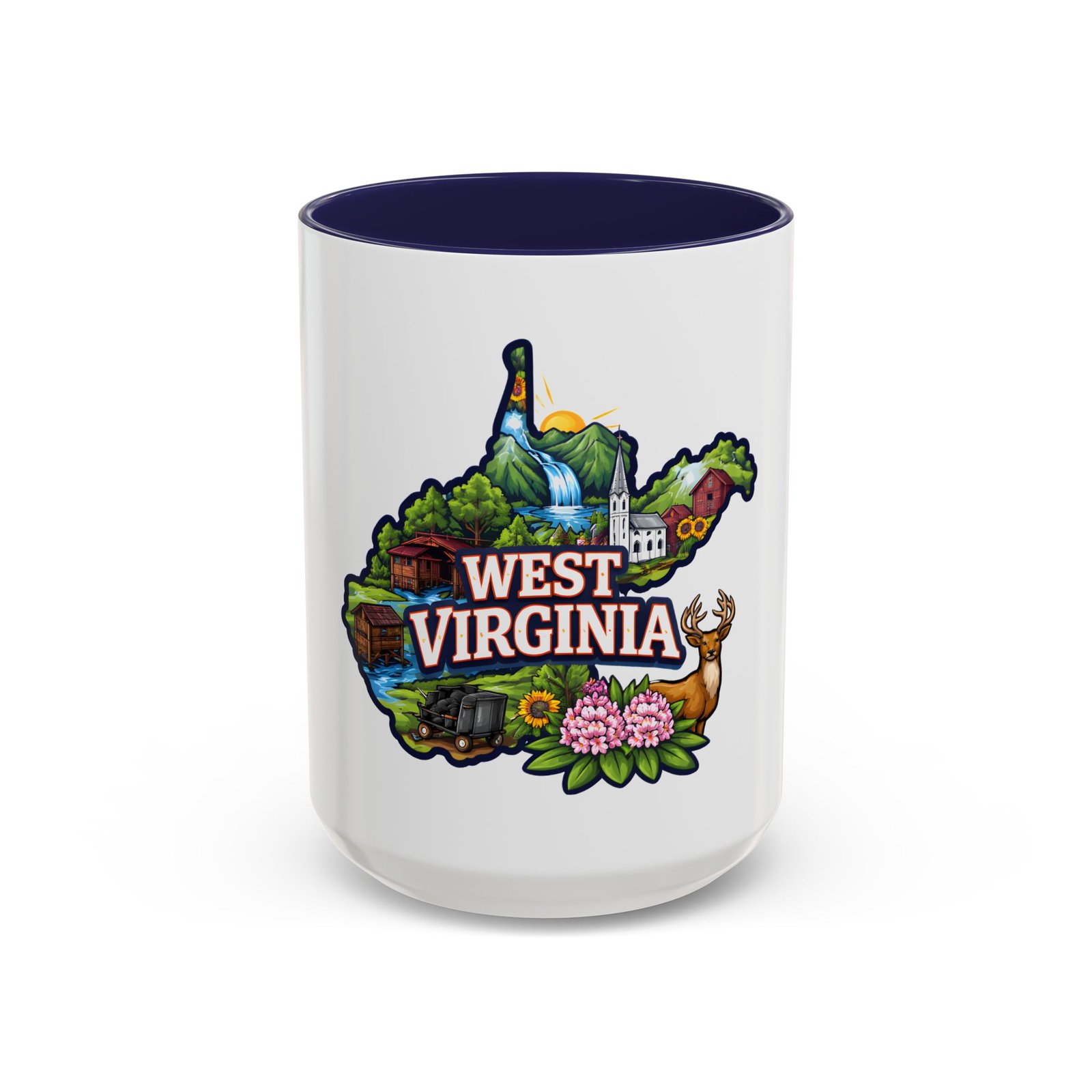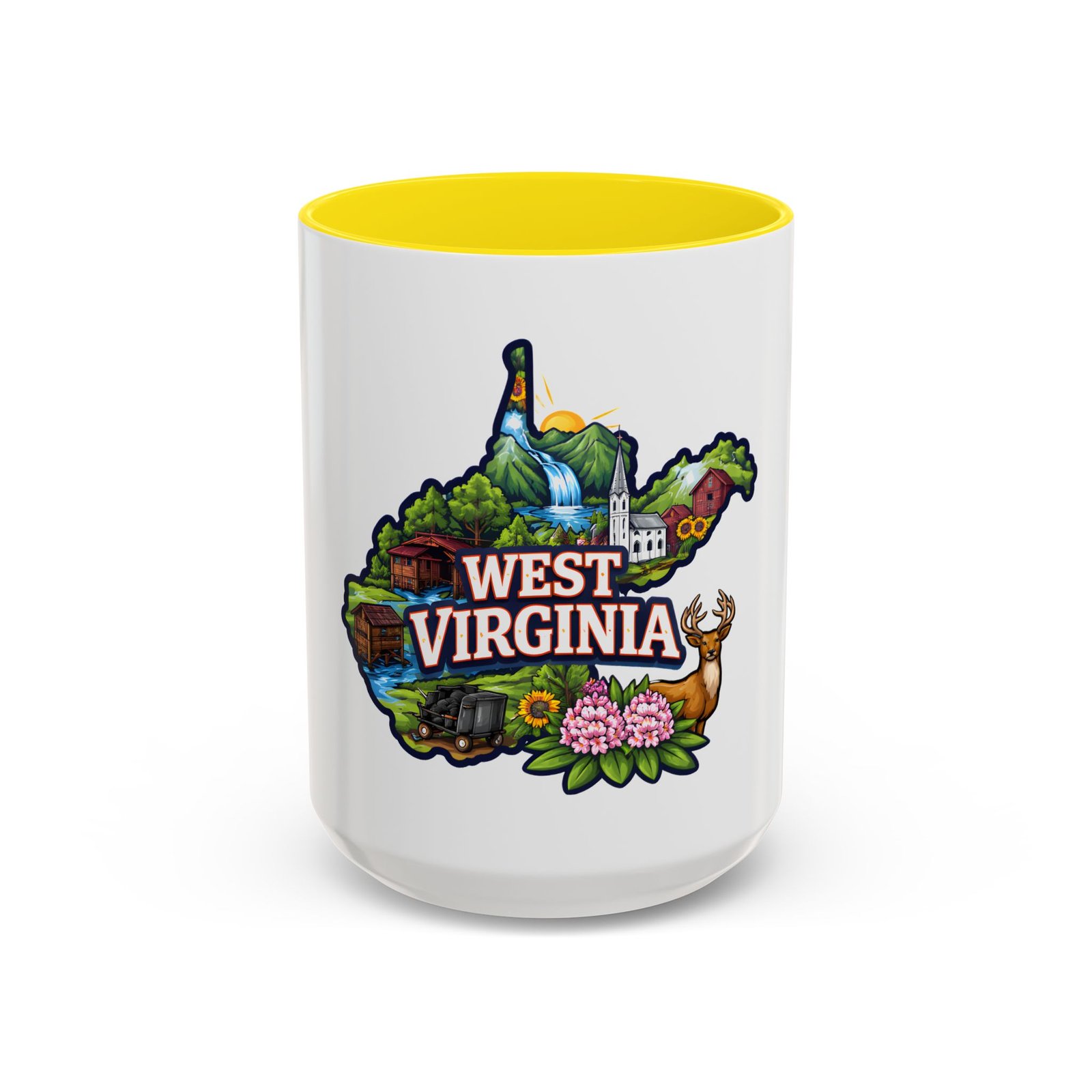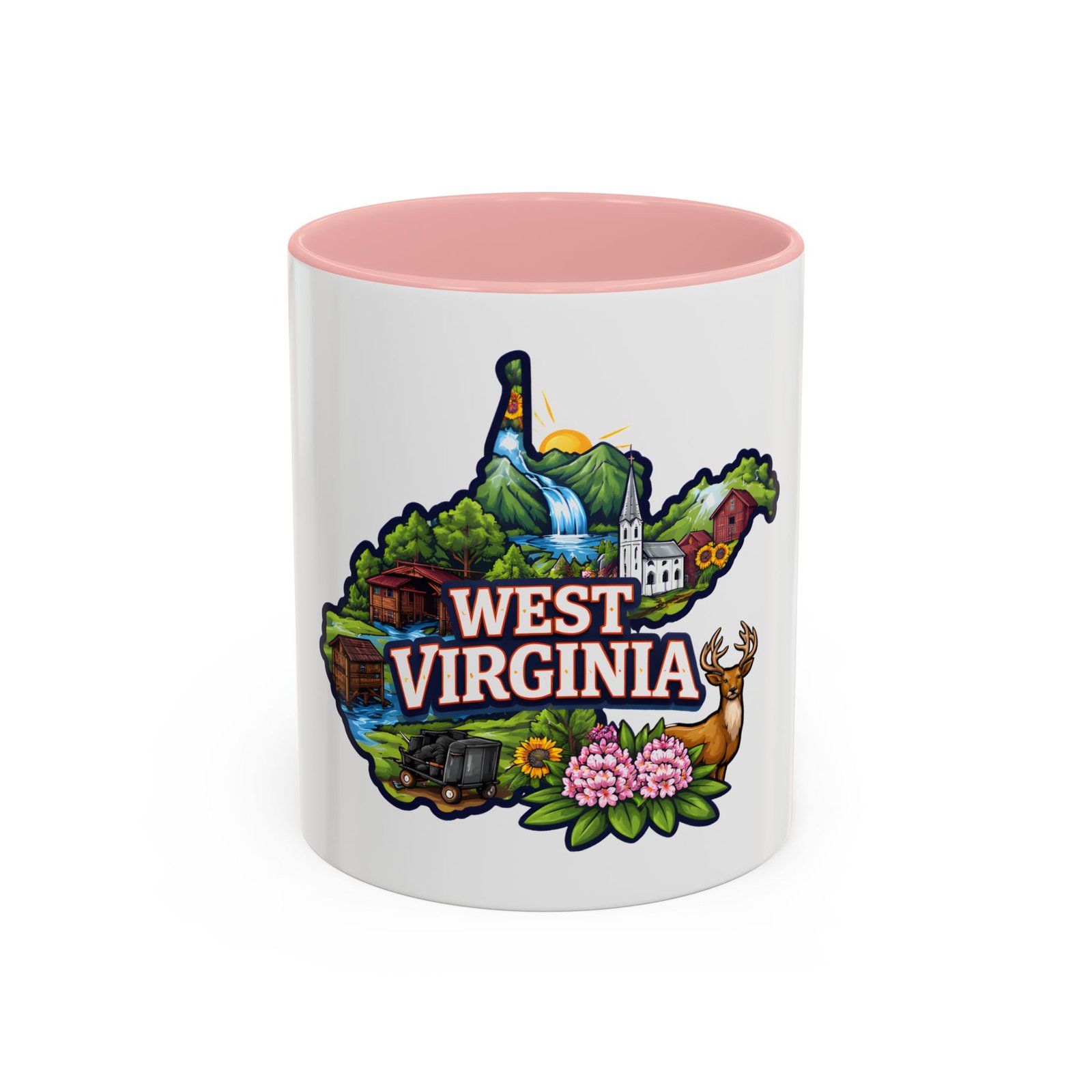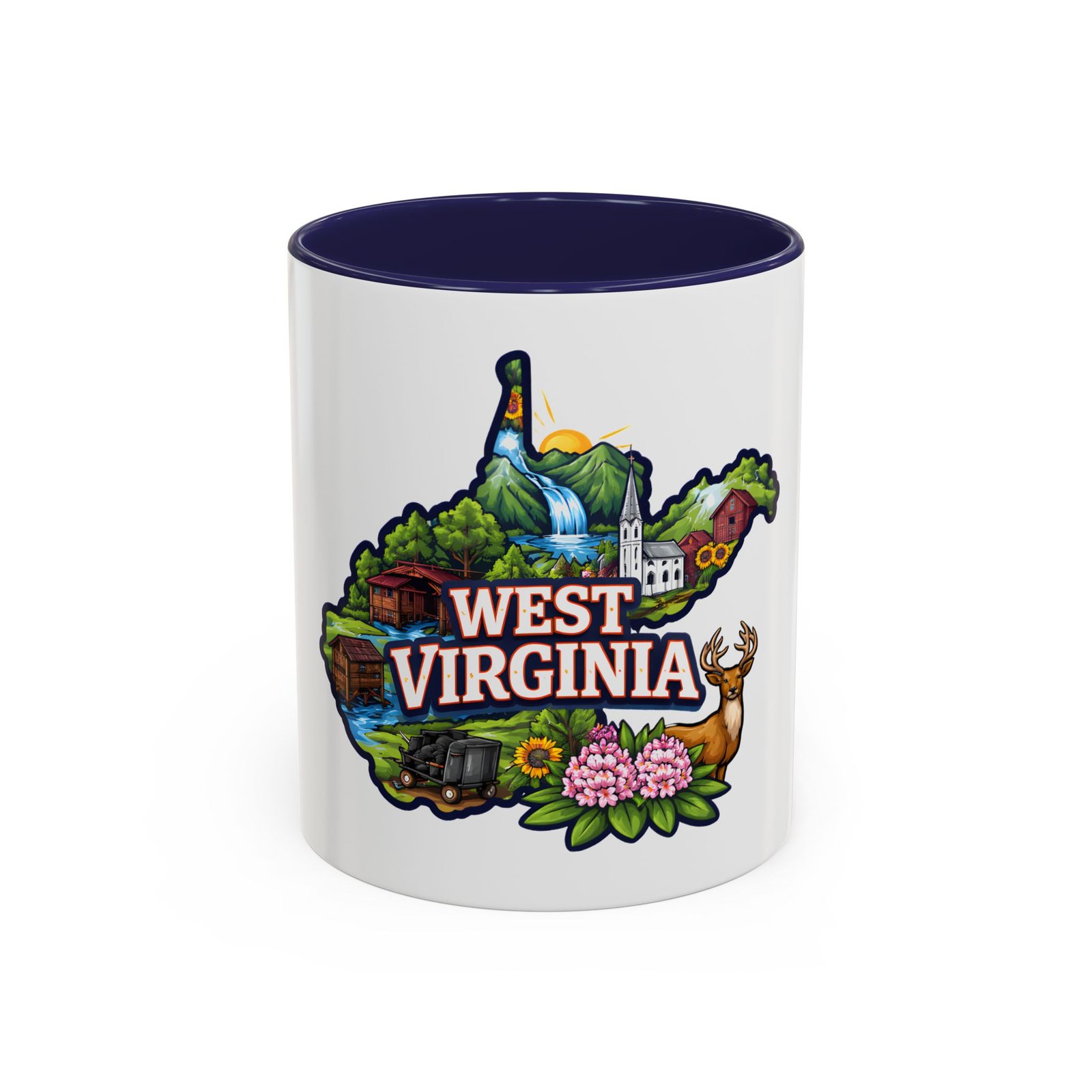 Sip a little bit of home with this ceramic accent mug, where bold color meets cozy familiarity. The illustrated West Virginia map wraps the mug in rolling hills, waterfalls, blooming rhododendrons, and a proud white-steepled church — small scenes that bring back mornings on the porch and afternoons on winding backroads. The colored interior and handle add a lively contrast that brightens your routine. It sits comfortably in your hands thanks to the C-shaped handle and glossy finish, turning an ordinary coffee break into a quiet moment of hometown pride.