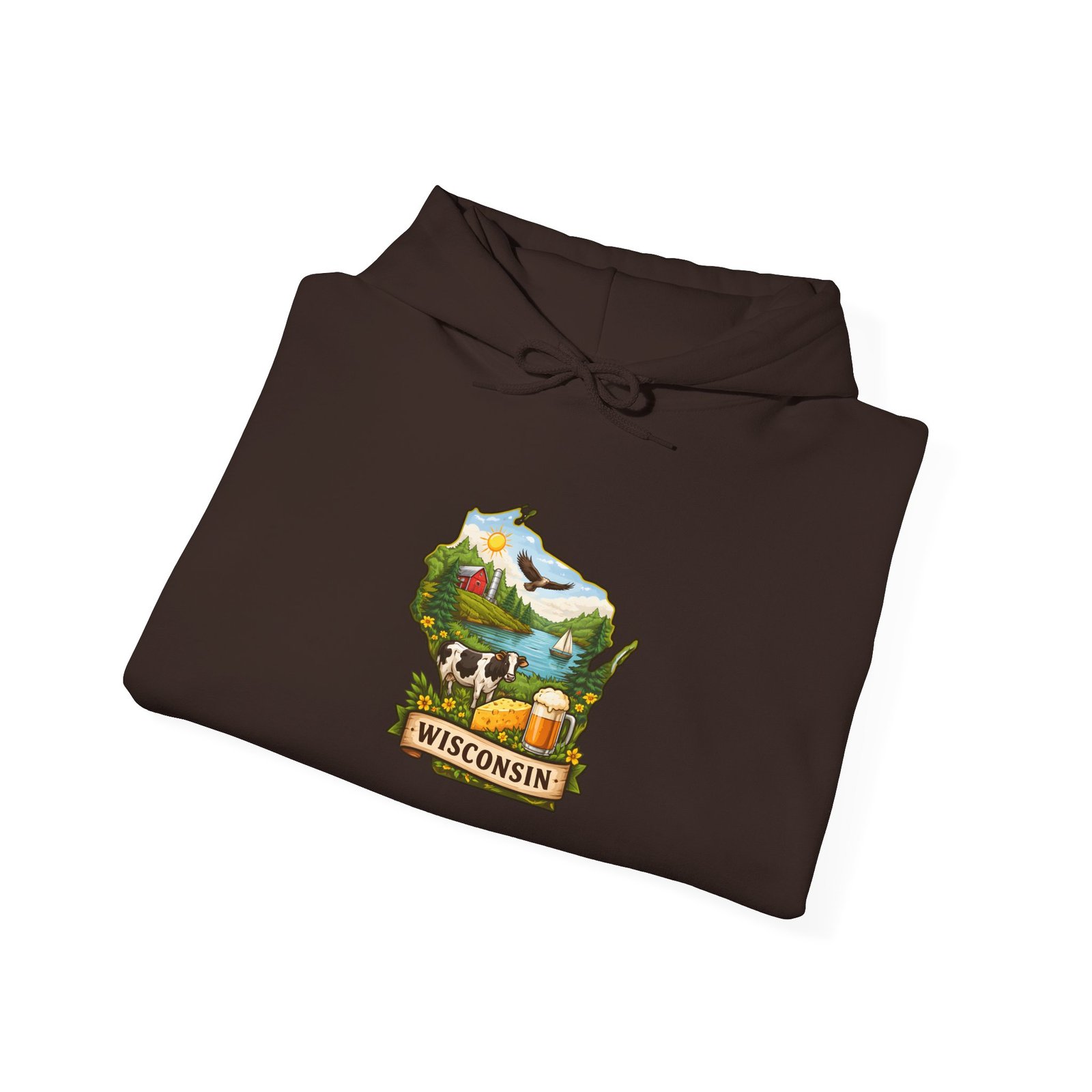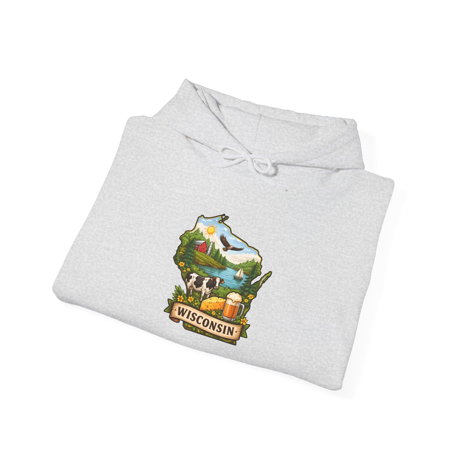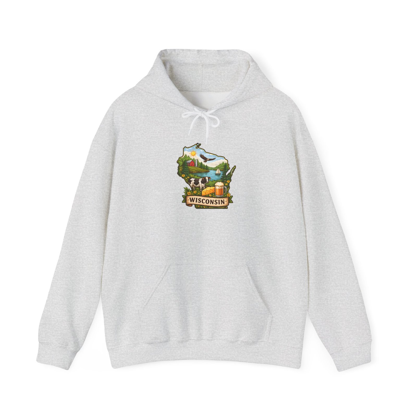 Wrap yourself in quiet northern comfort with this cozy hooded sweatshirt featuring a hand-drawn Wisconsin map illustration. Soft, medium-weight fabric holds the artwork with clear, durable printing while the roomy kangaroo pocket and double-lined hood keep hands warm on lake mornings and chilly bonfire nights. The design nods to rolling hills, dairy country, and pine-fringed lakes — it reads like a postcard you can wear. Slip it on for weekend drives, farmers market runs, or slow afternoons at a cabin. It layers easily under a jacket and pairs well with worn jeans and boots, becoming one of those go-to pieces you reach for when you want to feel grounded and at home.
