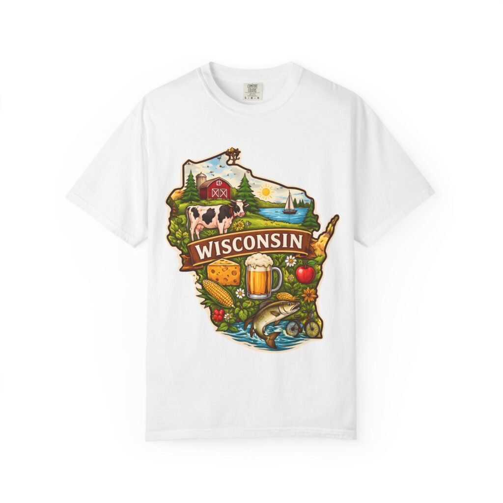 This heavyweight, garment-dyed tee wears like a favorite from the first try. A bold, colorful Wisconsin map print wraps local icons — rolling dairy hills, a red barn, a frothy beer mug, a wedge of cheese, an apple, and a hooked fish — into one lively scene. The relaxed cut and soft, post-dye texture invite long afternoons at the lake, casual brewery hops, or weekend farm visits. It layers easily under a flannel or stands alone as a proud nod to state roots. The sewn-in label and double-stitched seams mean this shirt keeps its shape through washes and seasons, while the tubular knit gives a clean, unfussy silhouette. Choose a true-to-you color from the many garment-dyed shades to make this shirt feel lived-in from day one.